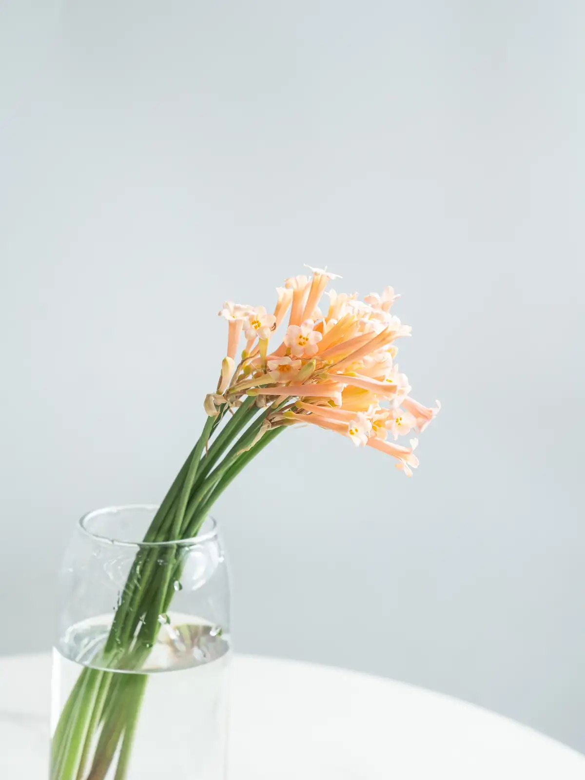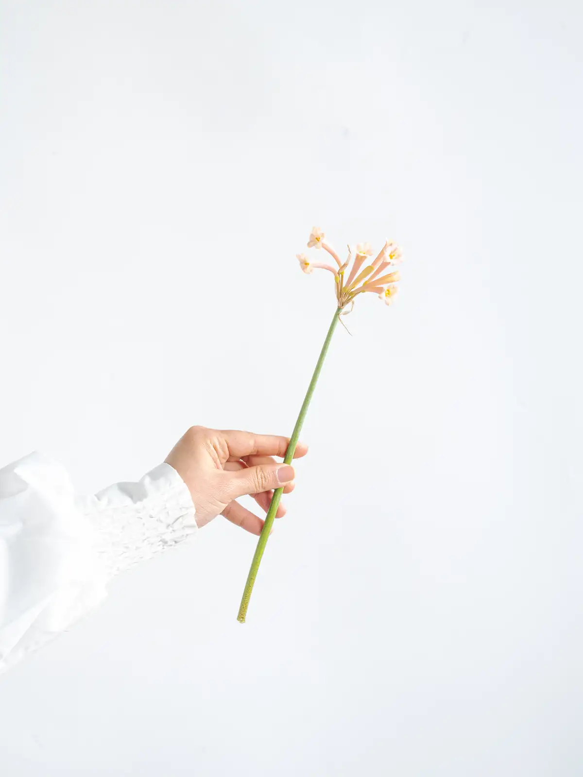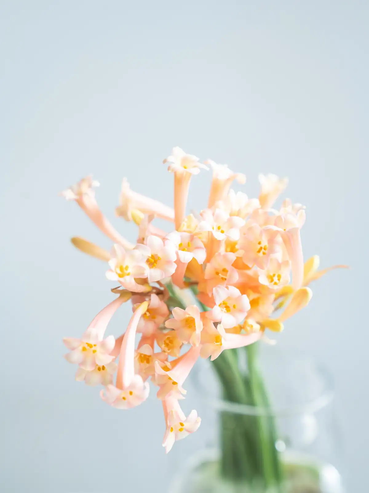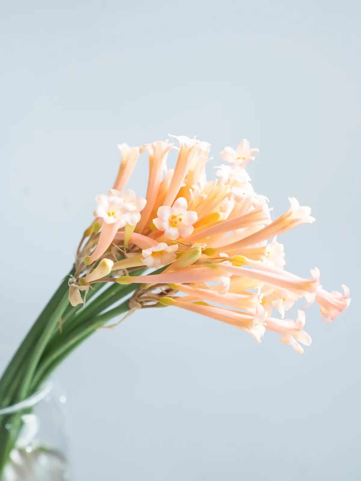 淡いピンク色の筒状花が可憐な球根花。花が連なって咲き、繊細で優しい印象の花姿です。