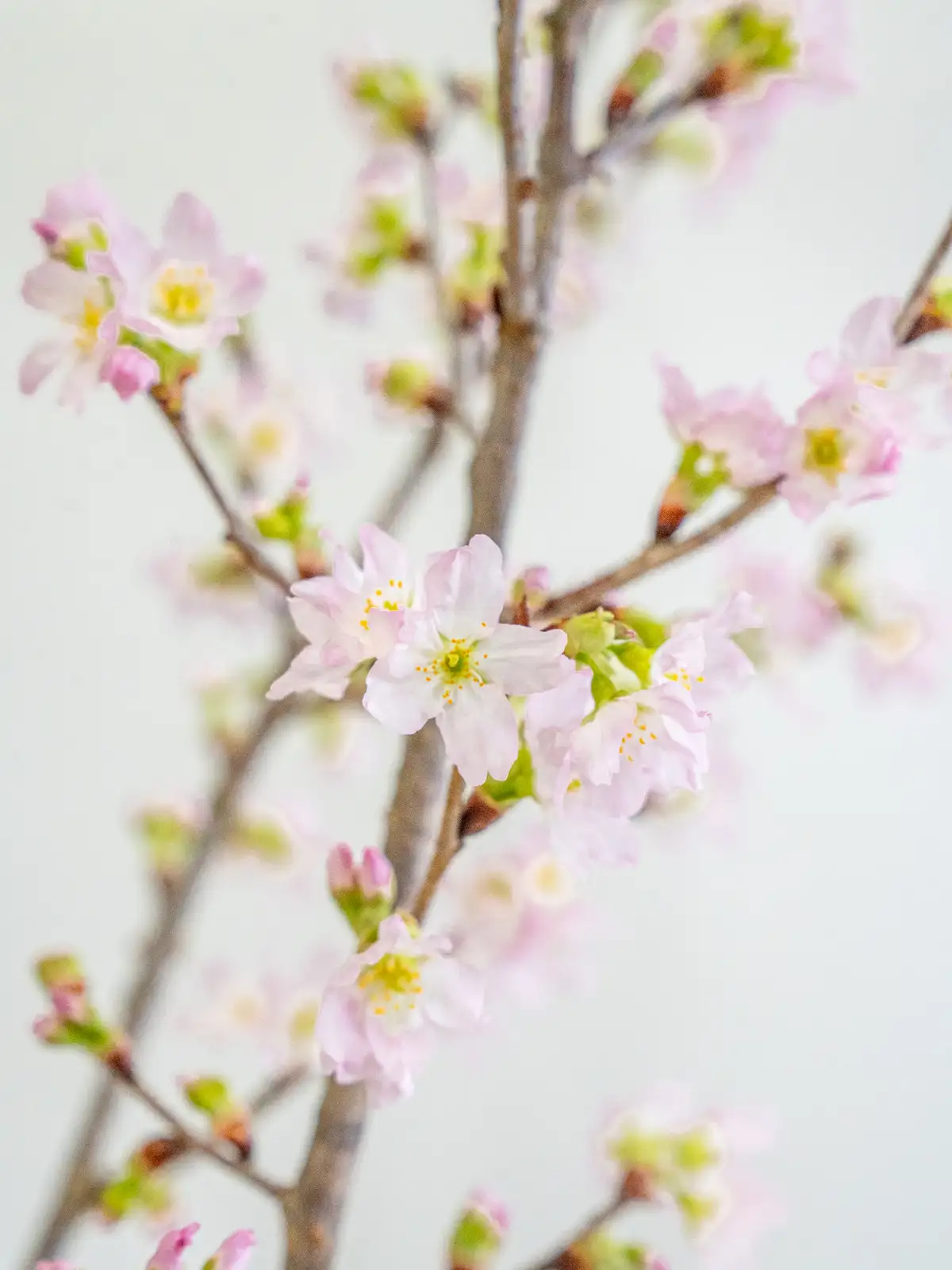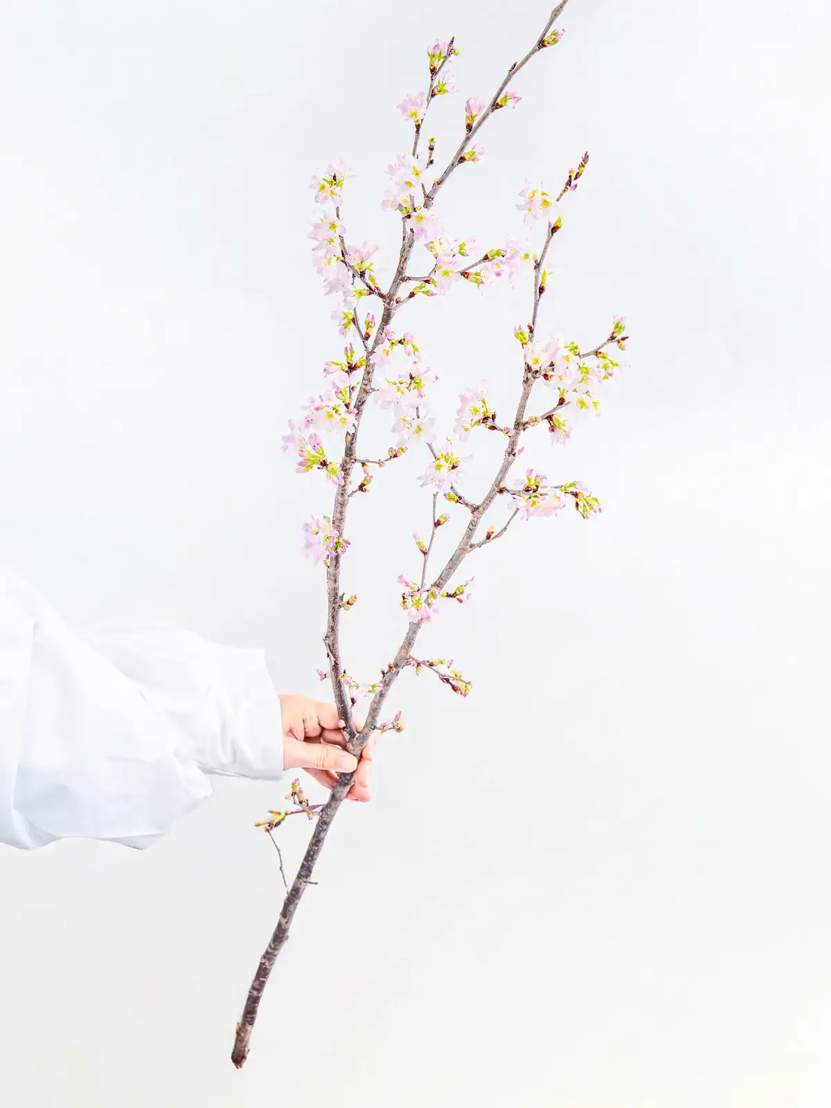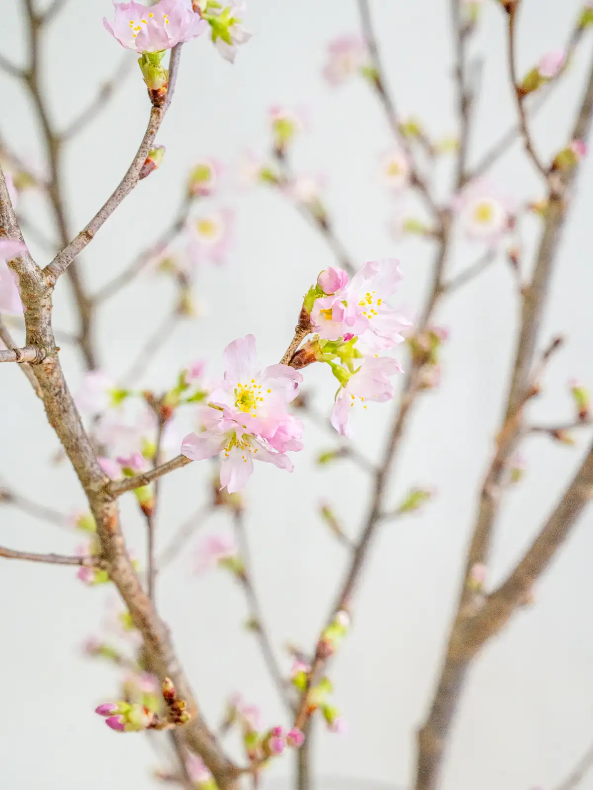 淡いピンク色の花を枝いっぱいに咲かせる早咲きの桜。細かな花付きで、春らしい軽やかな印象です。