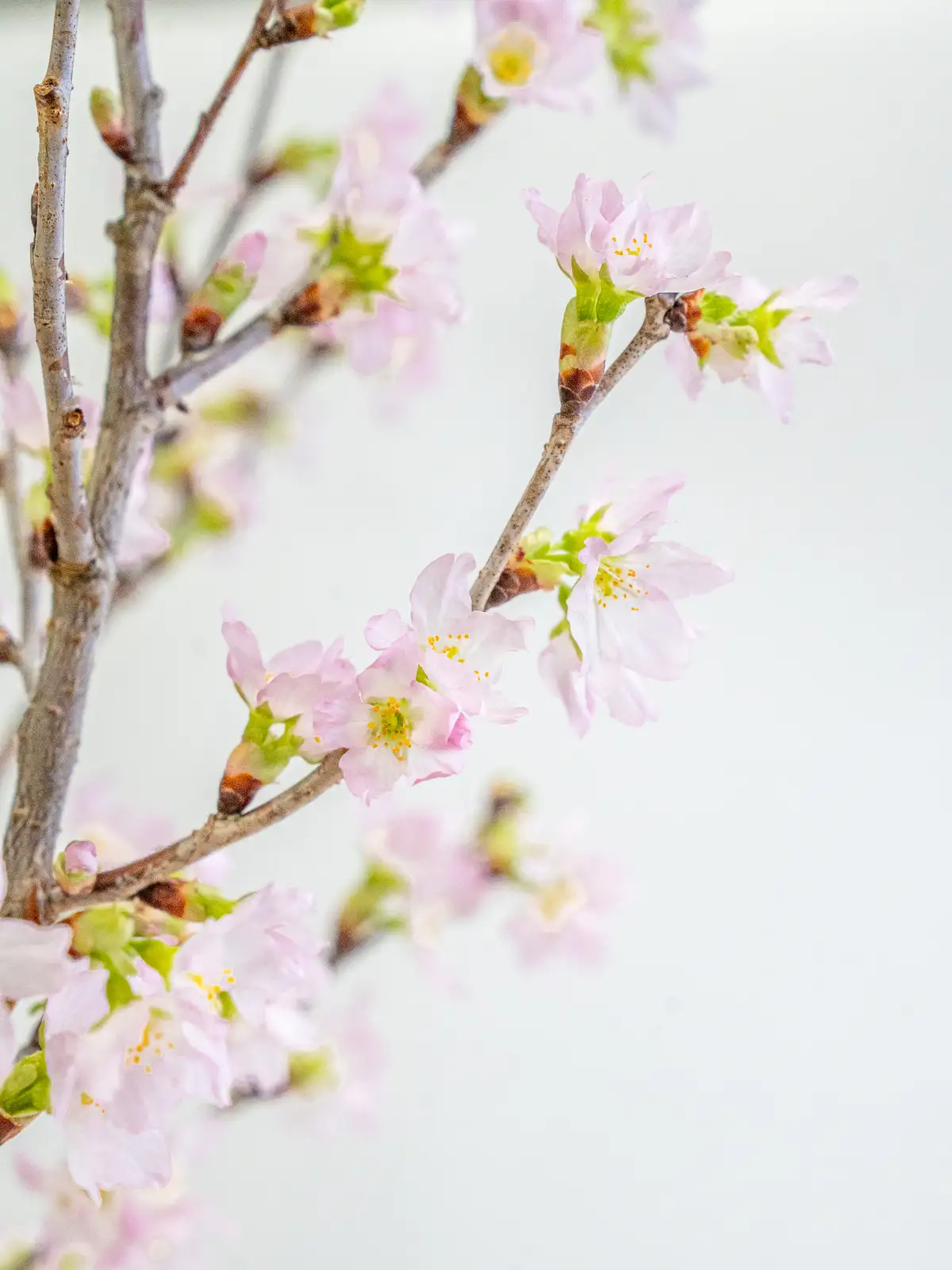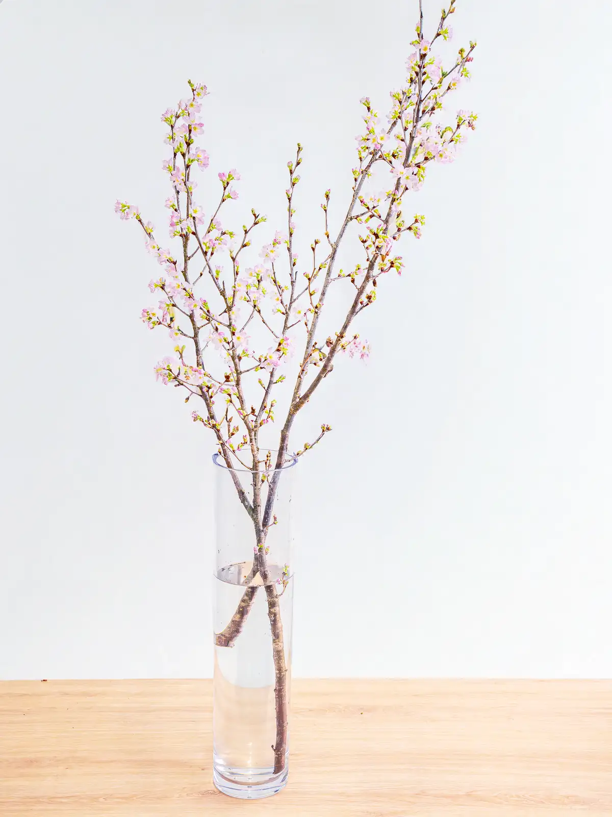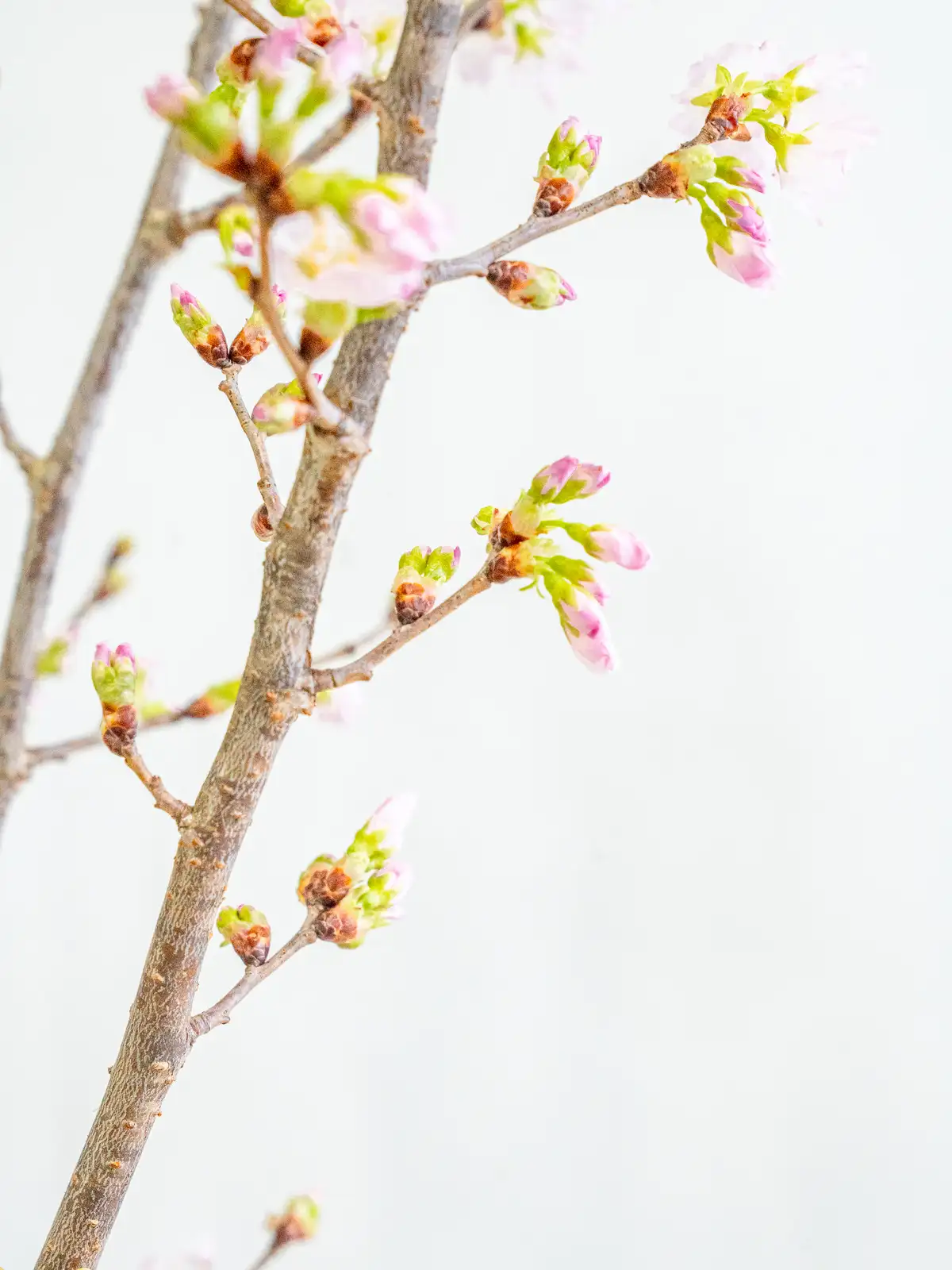 淡いピンク色の花を枝いっぱいに咲かせる早咲きの桜。細かな花付きで、春らしい軽やかな印象です。