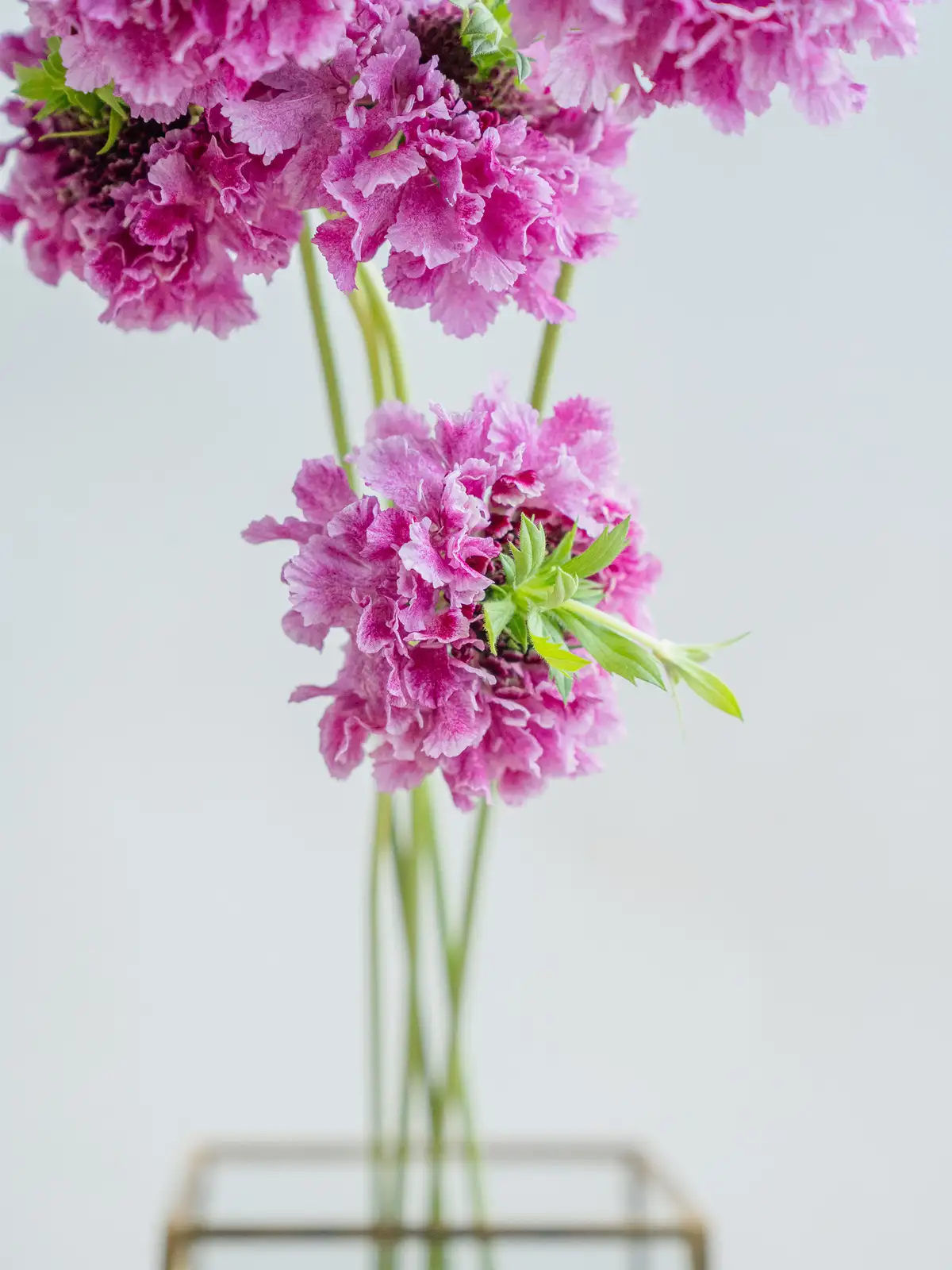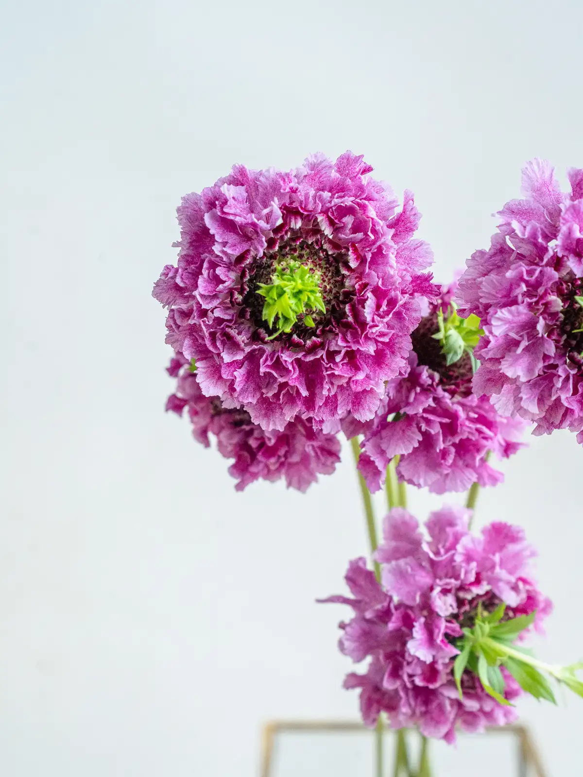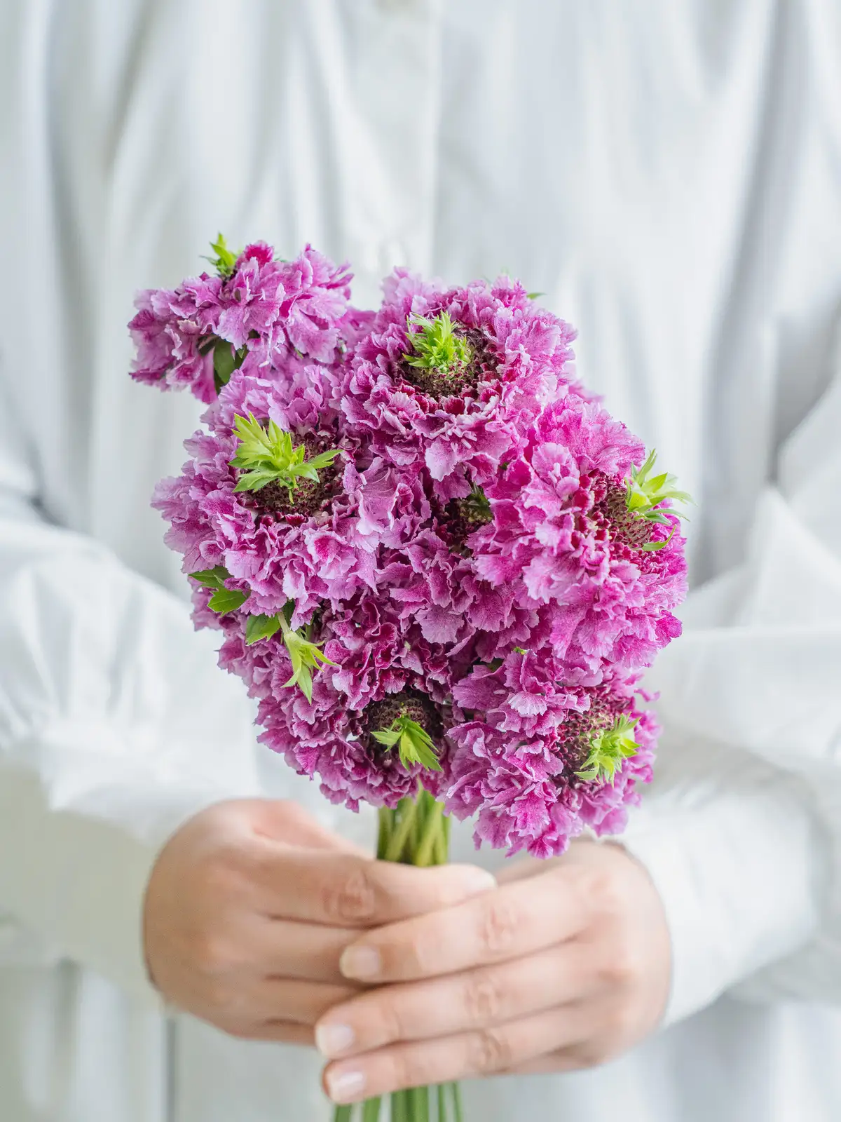 深みのある紫色が印象的なスカビオサ。中心部が立ち上がる個性的な咲き姿で、花の立体感が際立ちます。