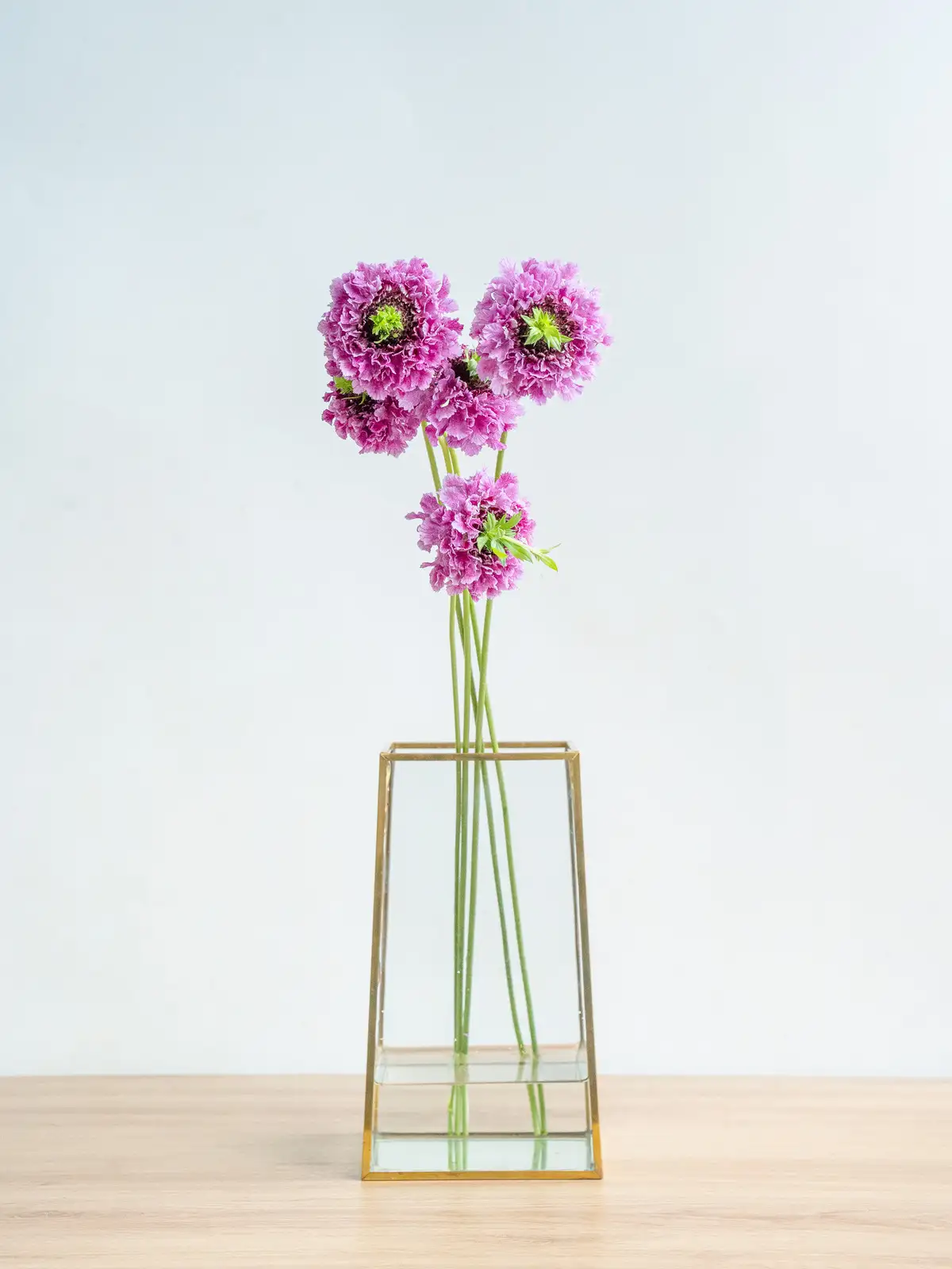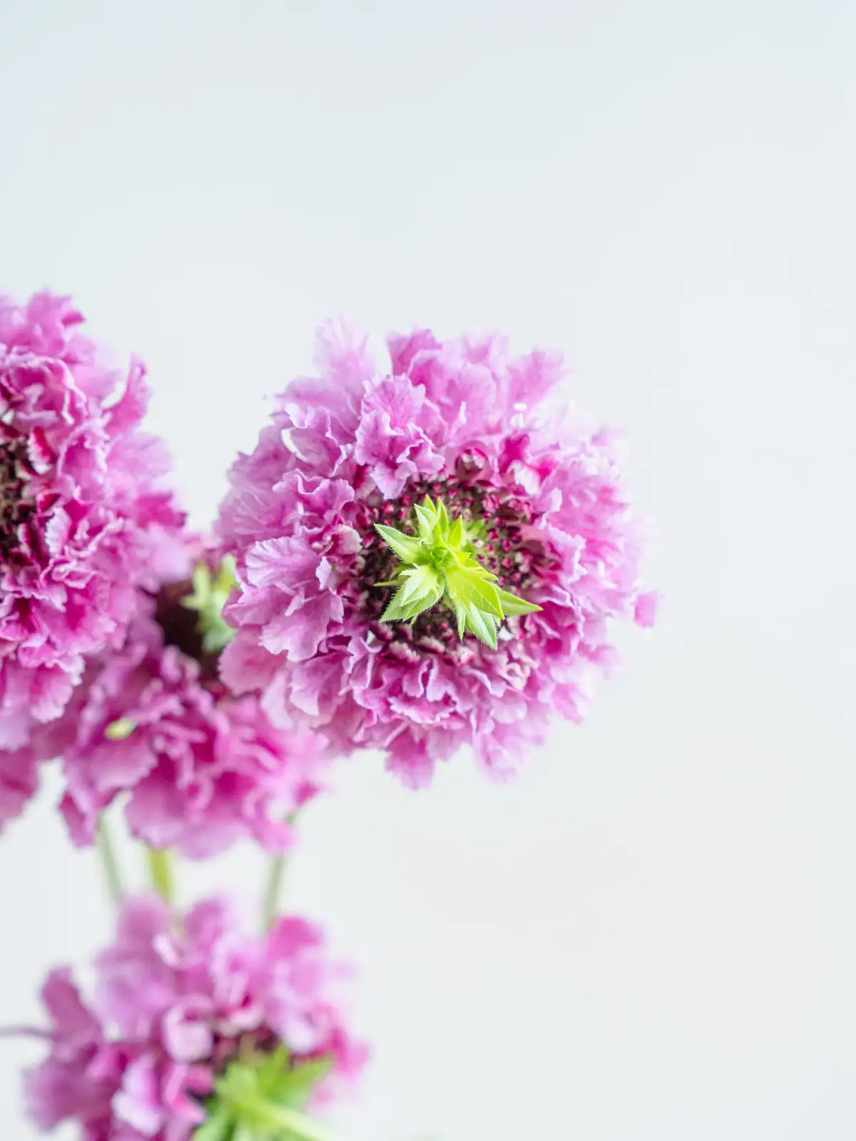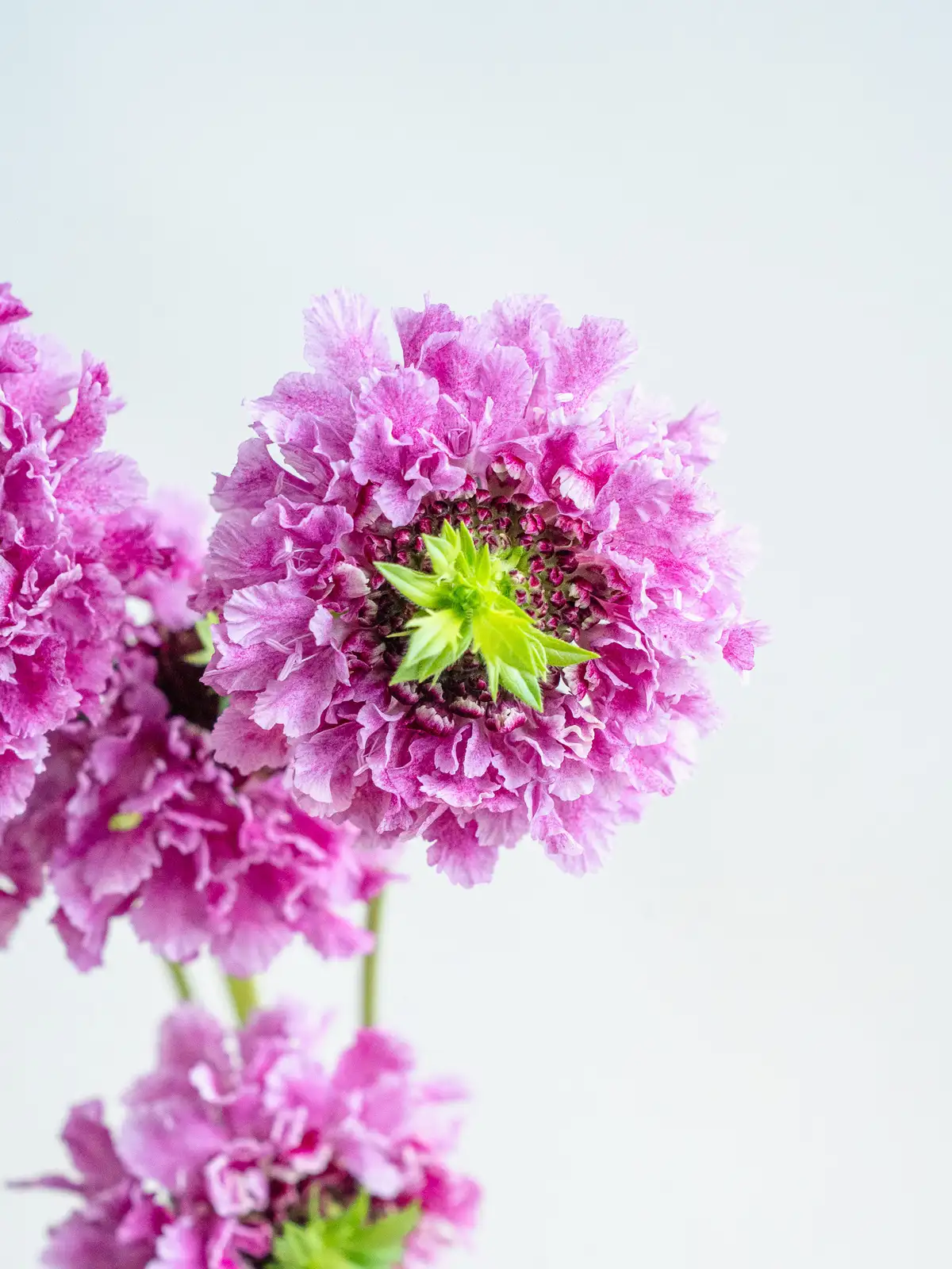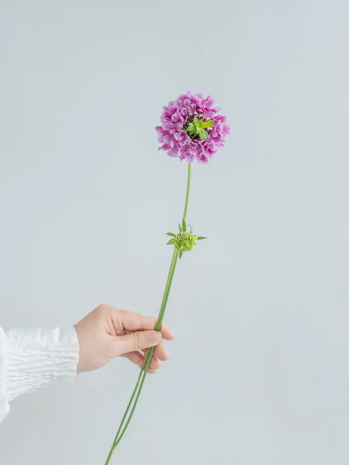 深みのある紫色が印象的なスカビオサ。中心部が立ち上がる個性的な咲き姿で、花の立体感が際立ちます。