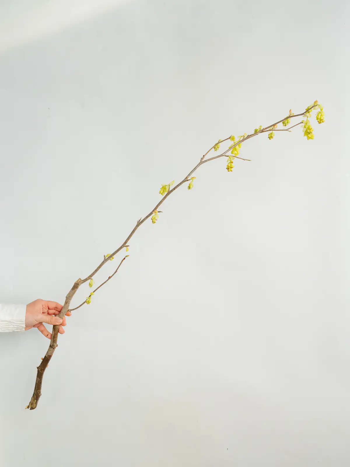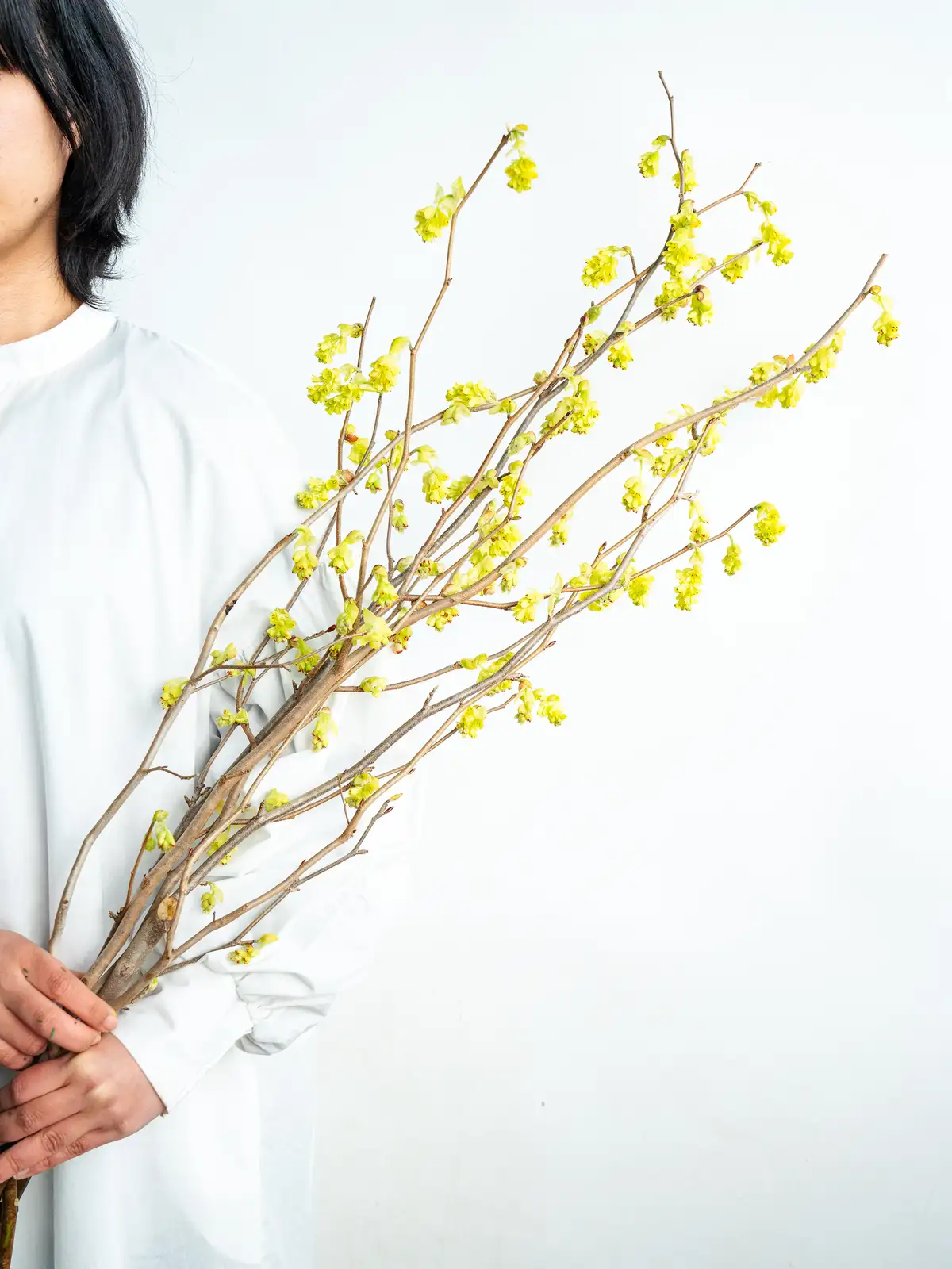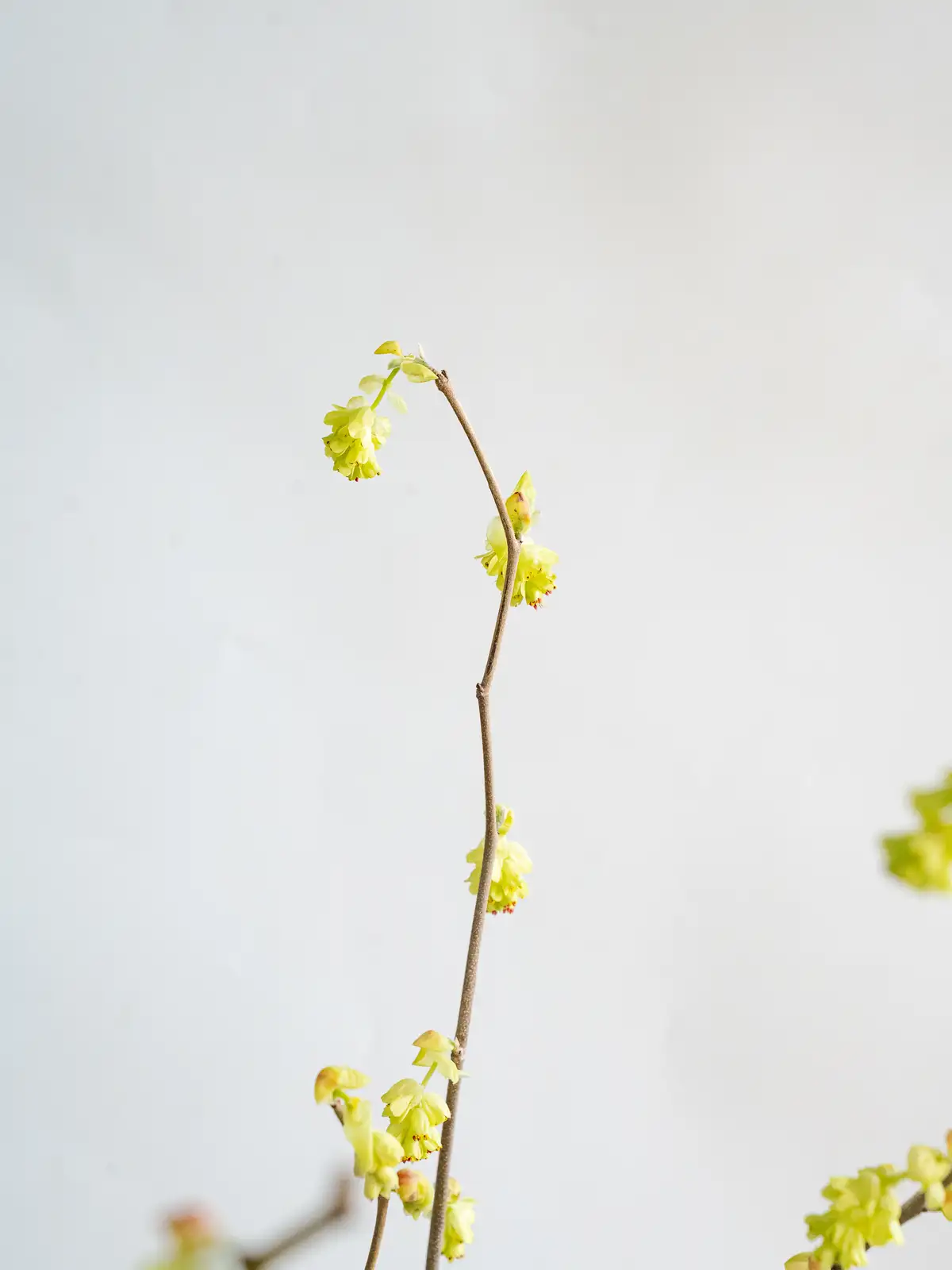小さな黄色の花が房状に垂れ下がって咲く枝物。細やかな花付きと、しなやかな枝のラインが特徴です。