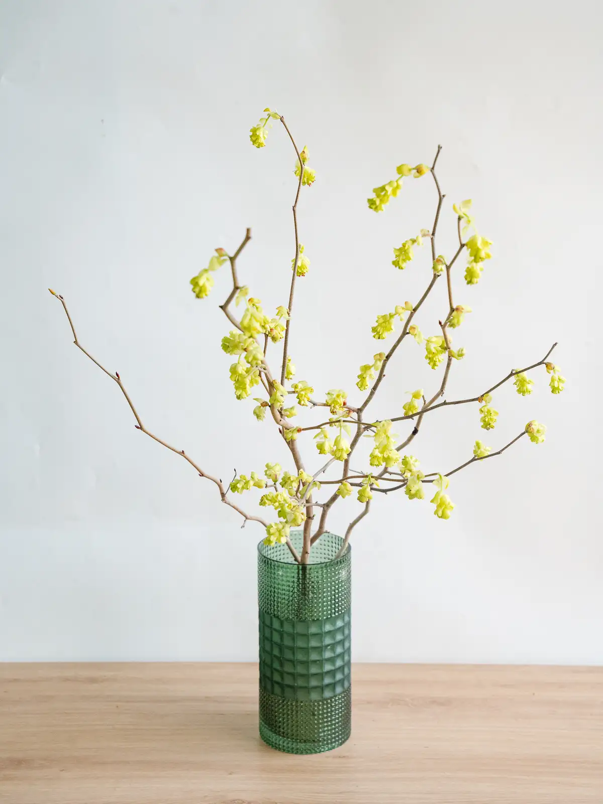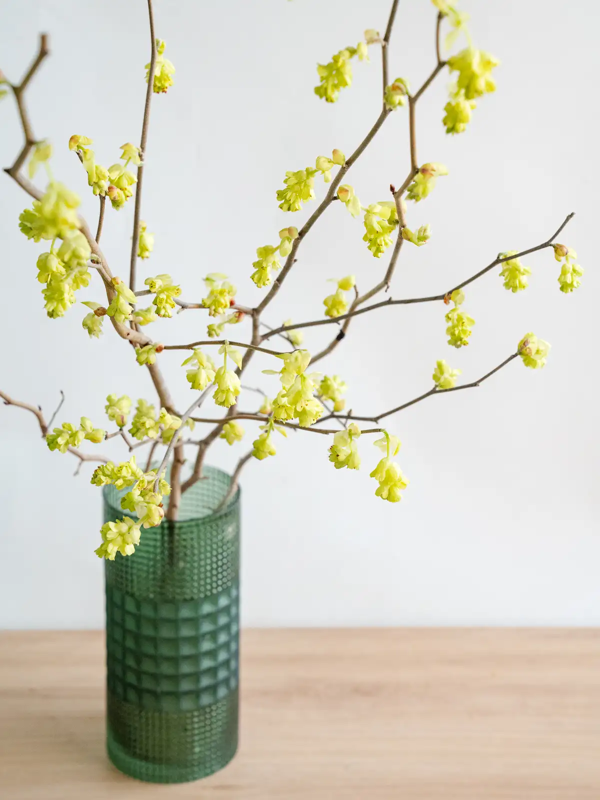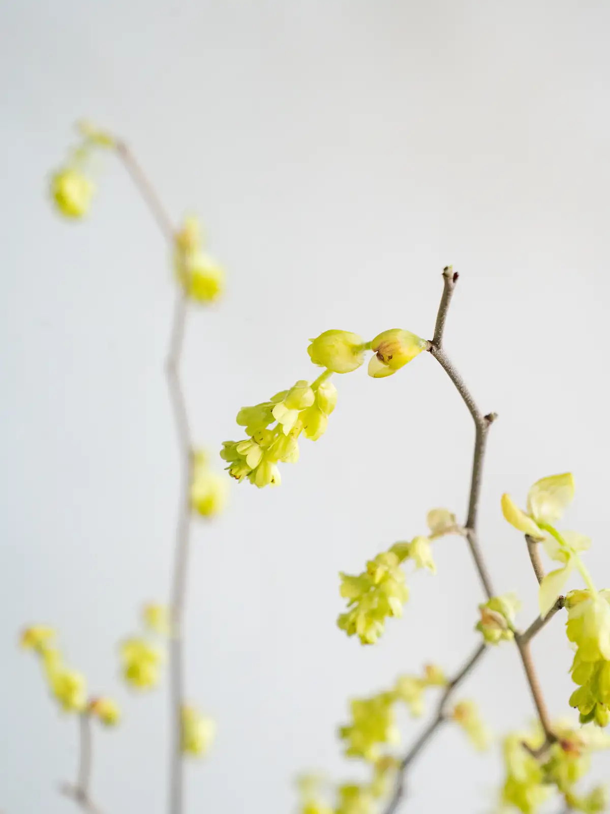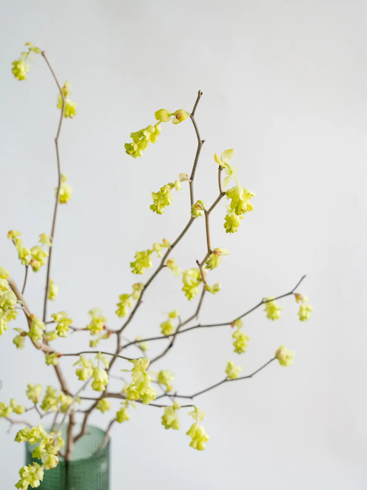 小さな黄色の花が房状に垂れ下がって咲く枝物。細やかな花付きと、しなやかな枝のラインが特徴です。