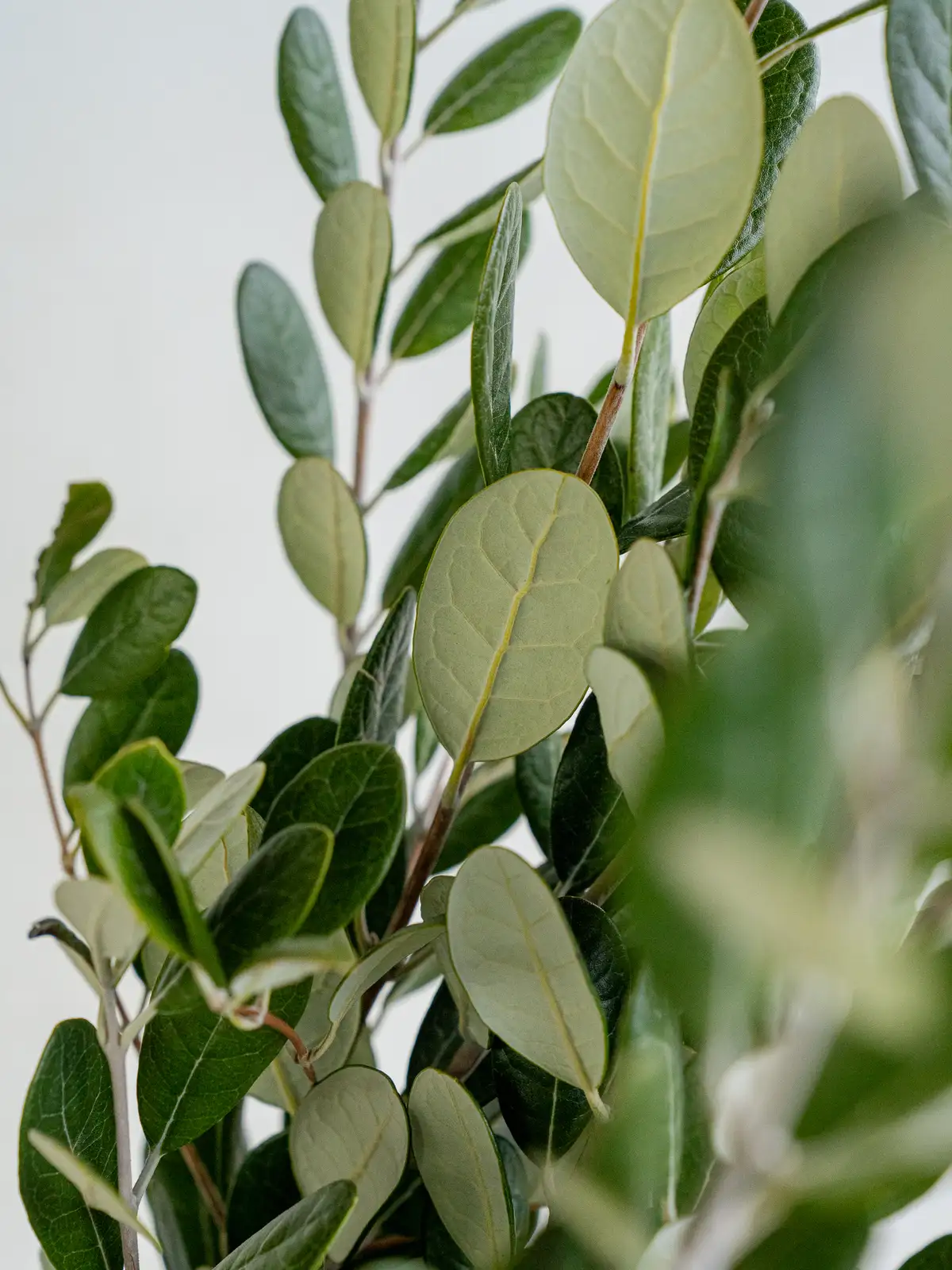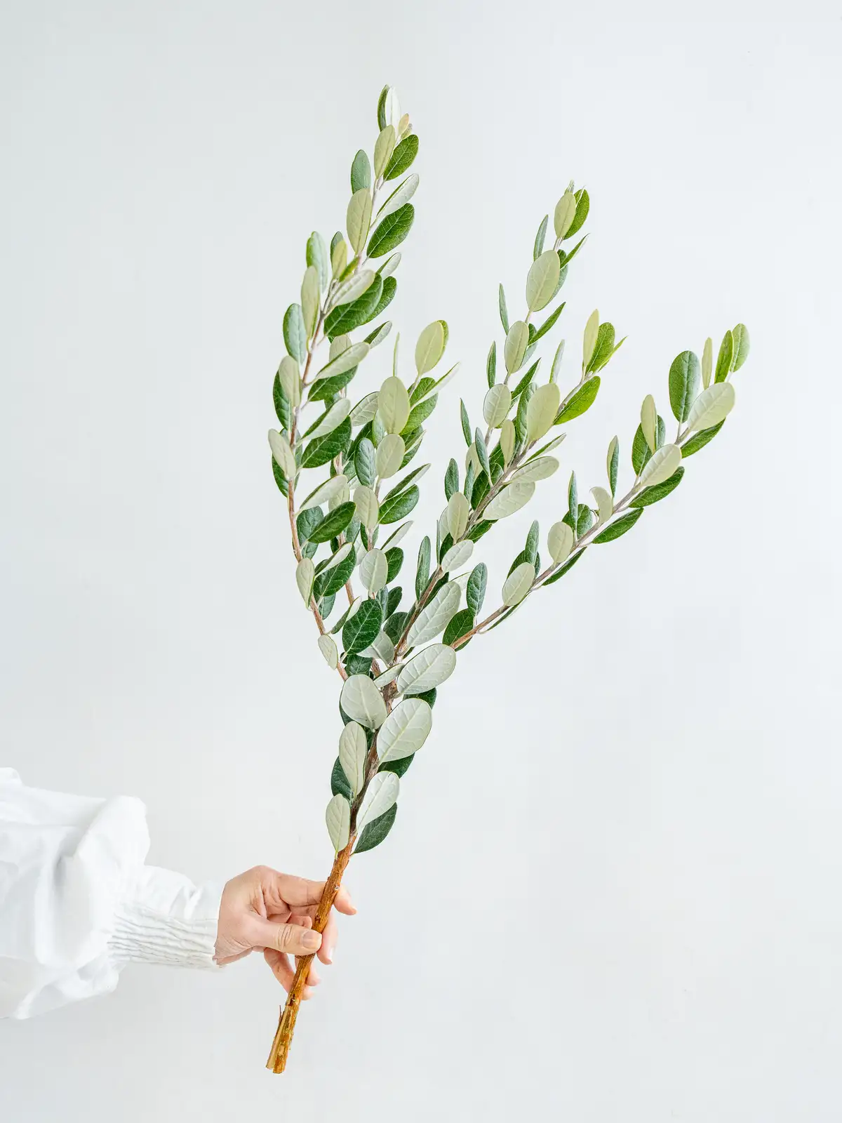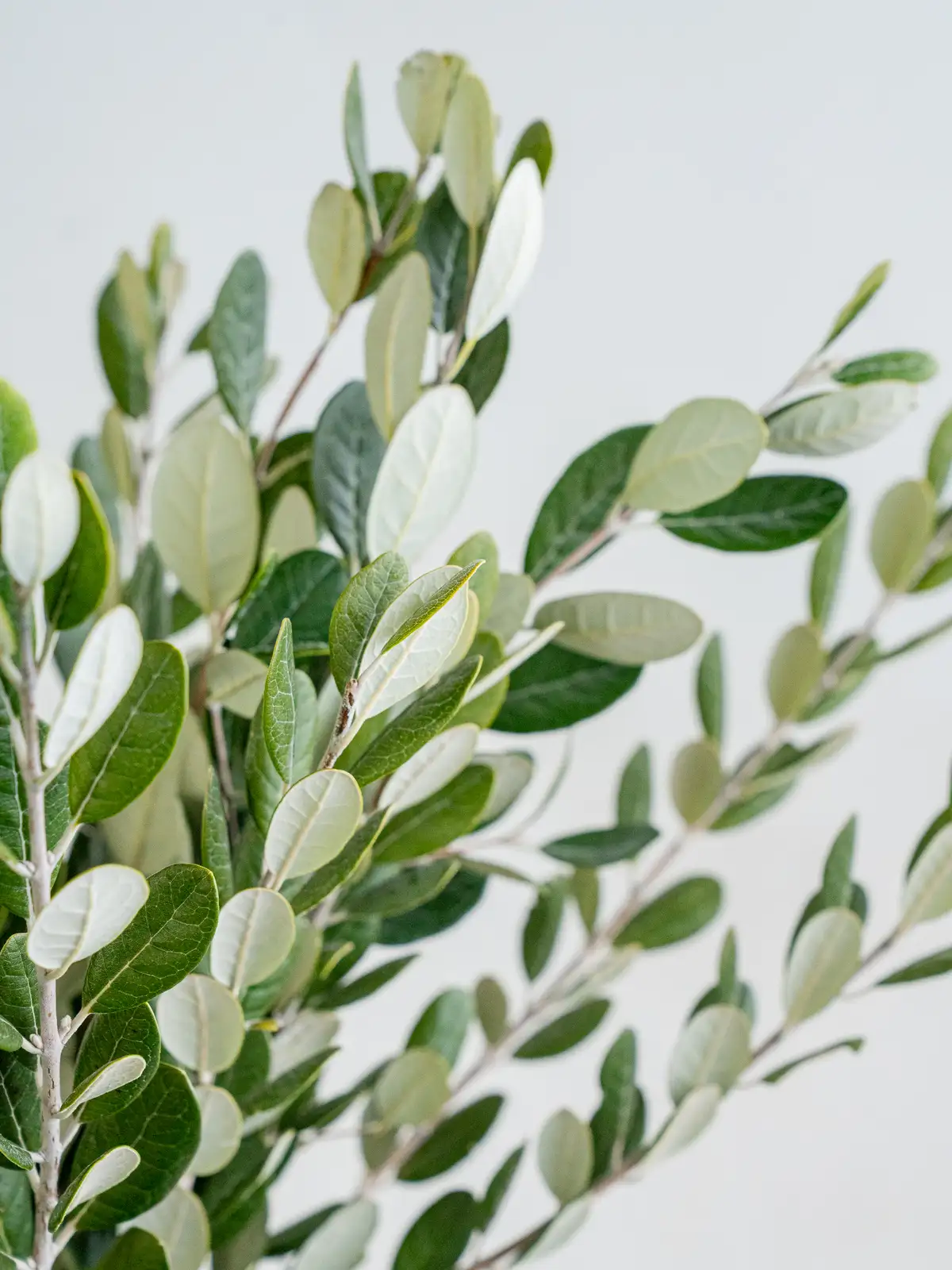 赤い花芯と白い花弁のコントラストが特徴的なフェイジョア。繊細な花姿で、個性的な表情を楽しめる枝物です。