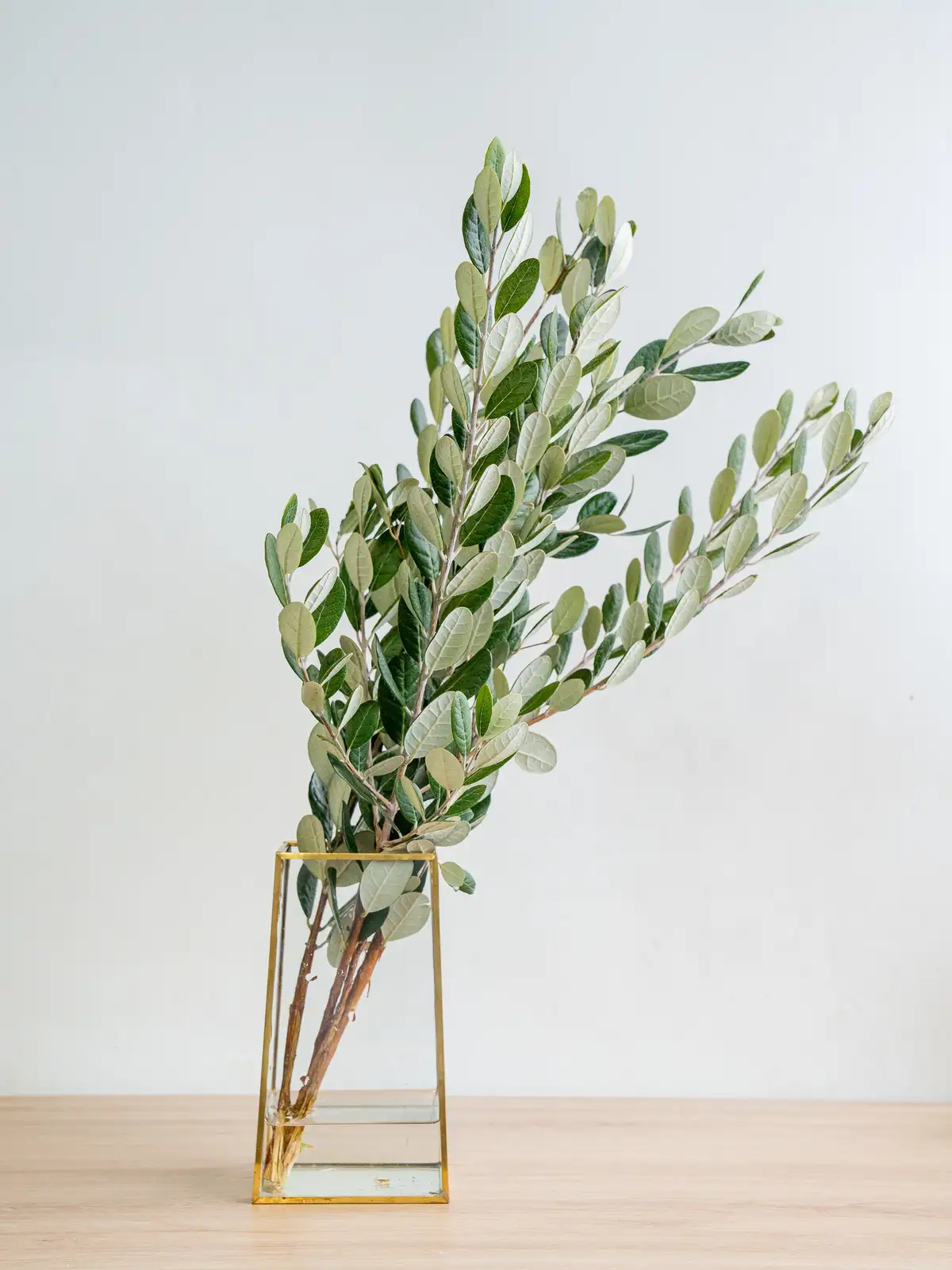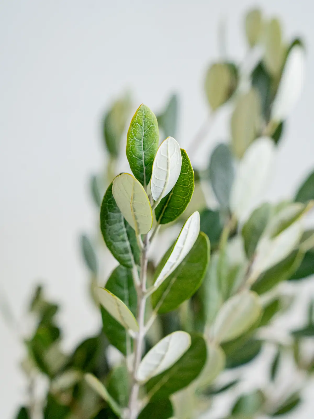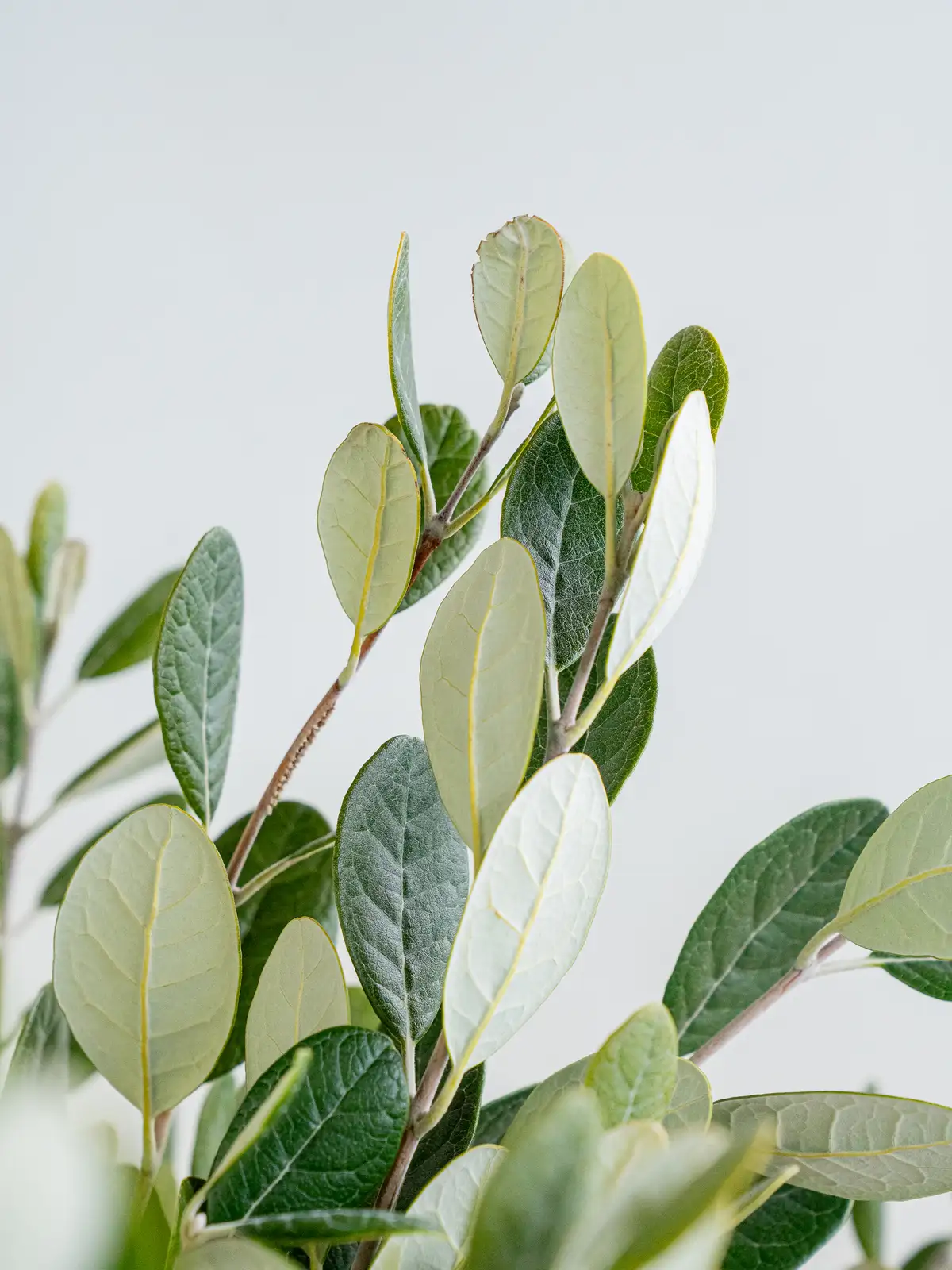 赤い花芯と白い花弁のコントラストが特徴的なフェイジョア。繊細な花姿で、個性的な表情を楽しめる枝物です。