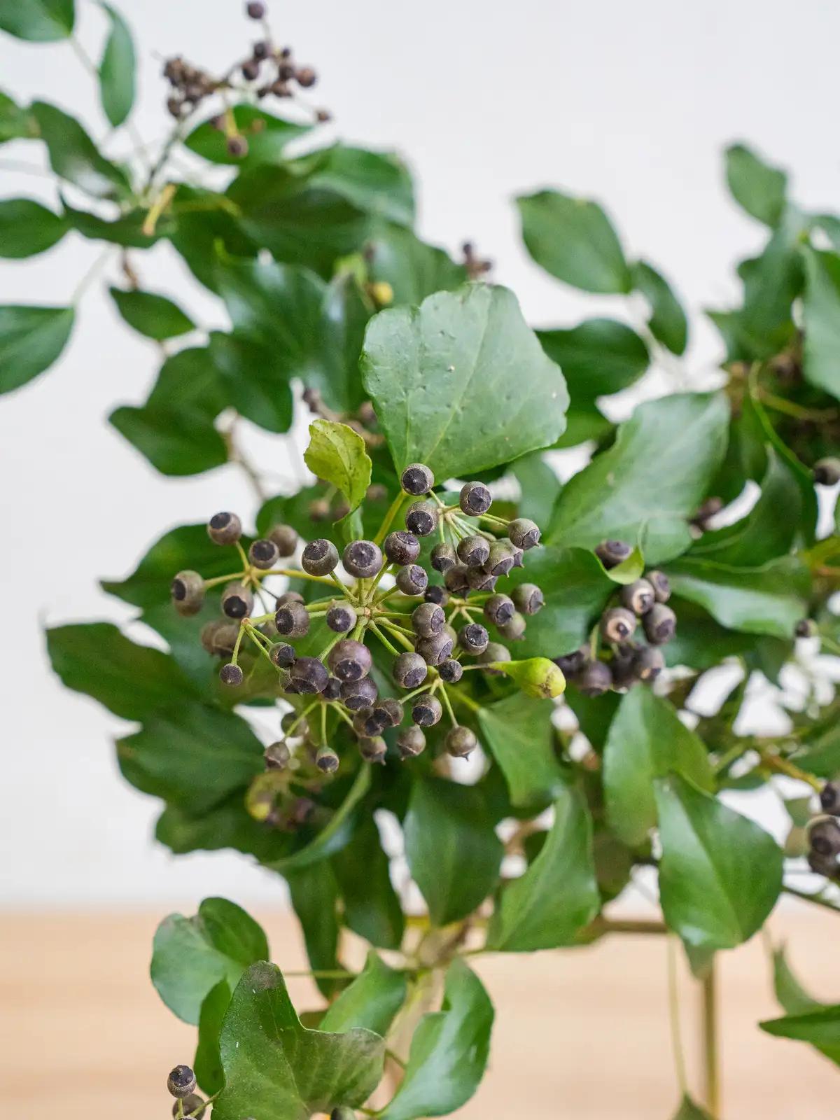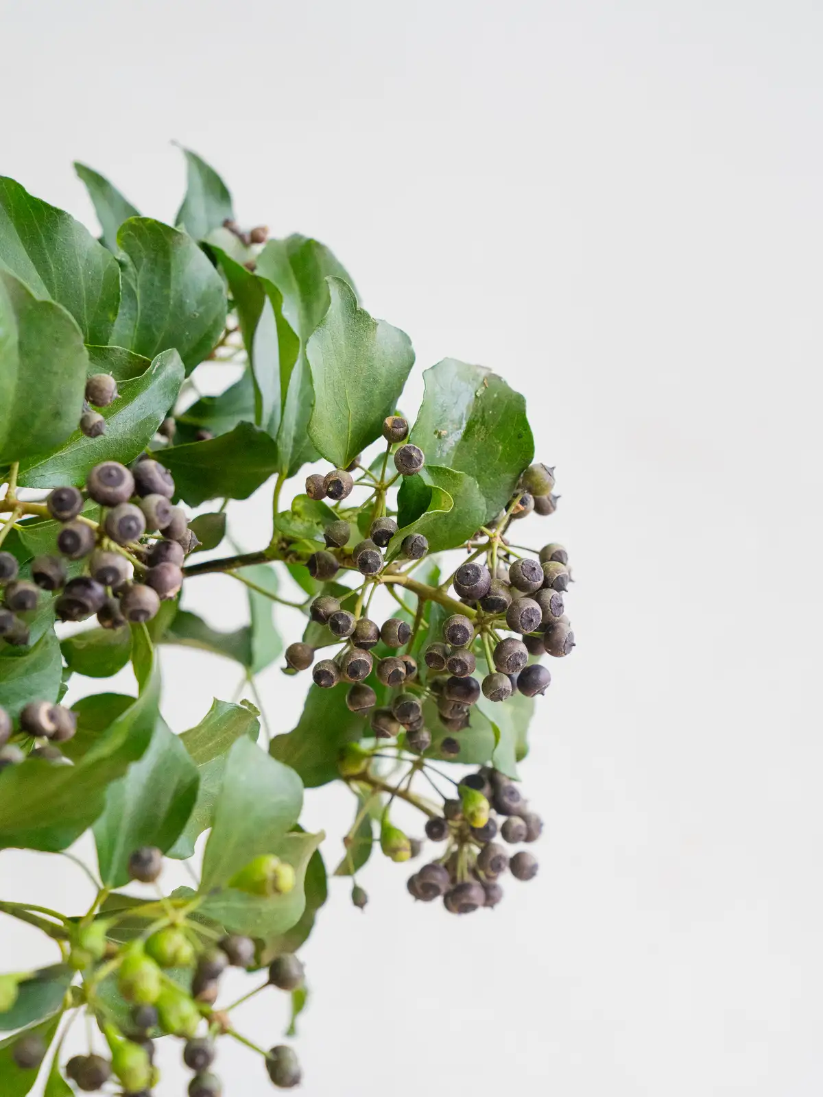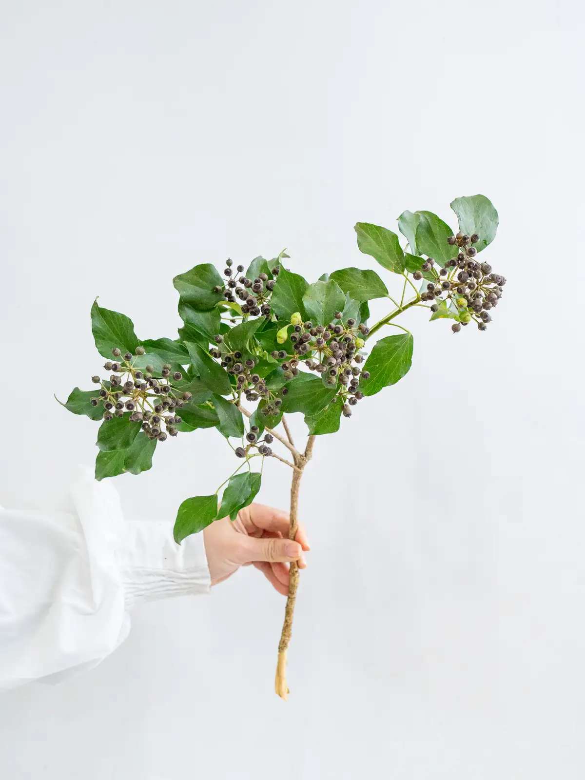 小さな黒い実がまとまって付く実物素材。粒の光沢と深い色合いが特徴で、シックなアクセントになります。