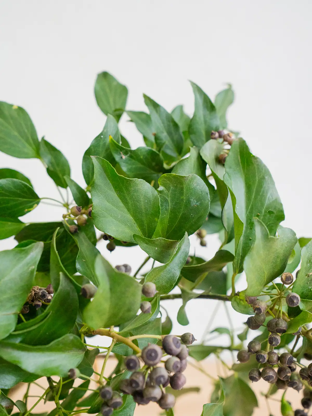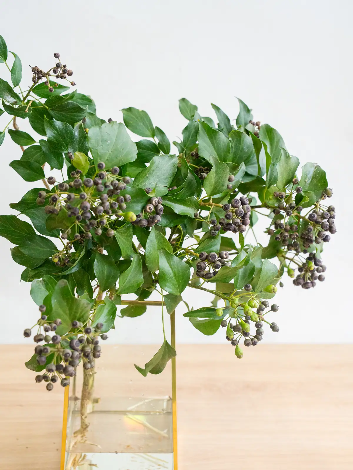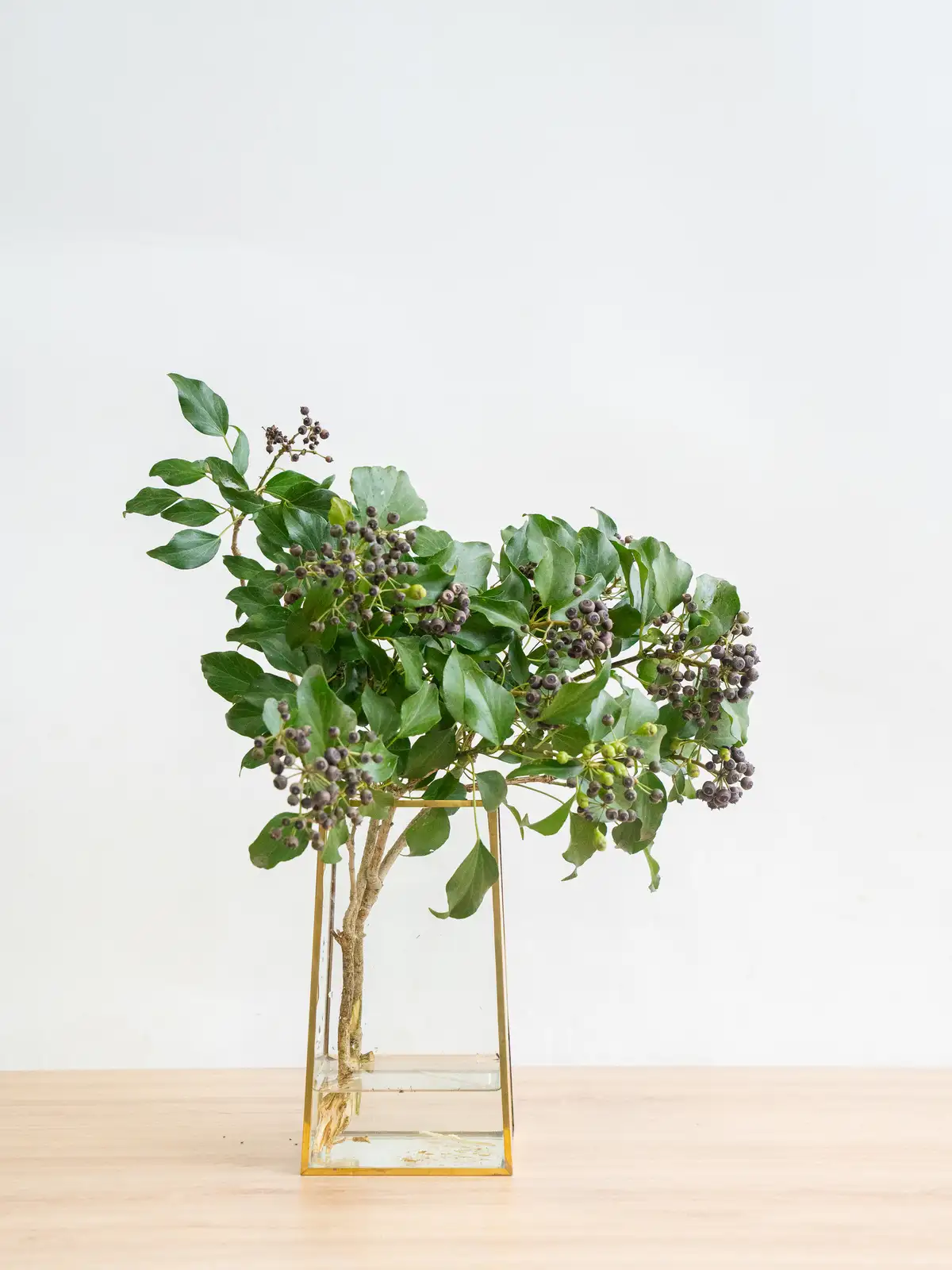 小さな黒い実がまとまって付く実物素材。粒の光沢と深い色合いが特徴で、シックなアクセントになります。