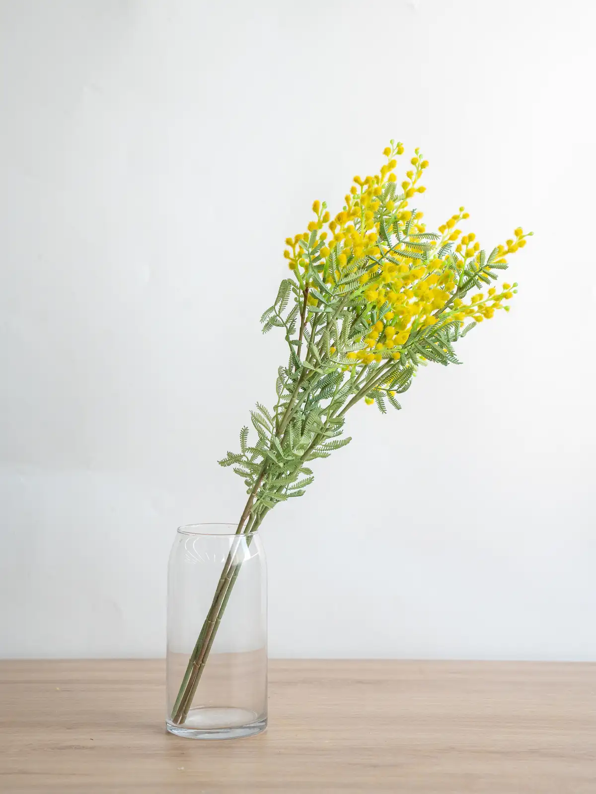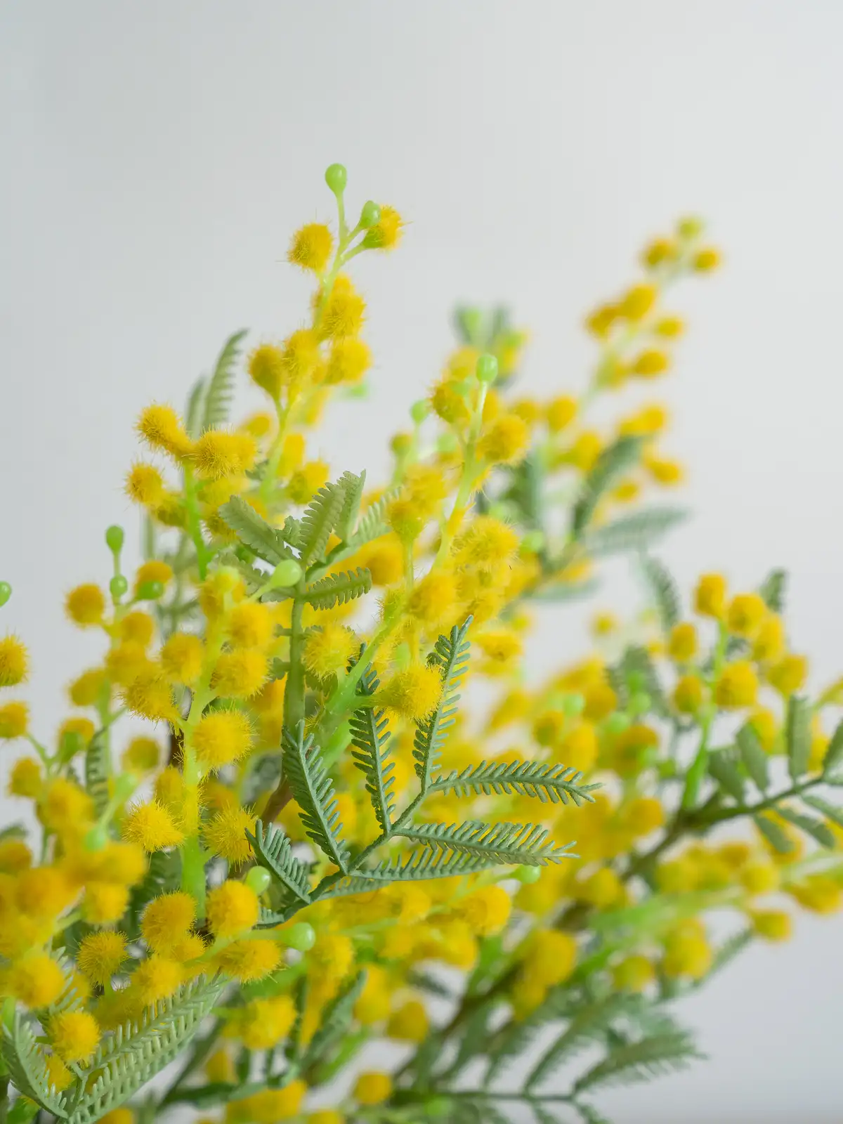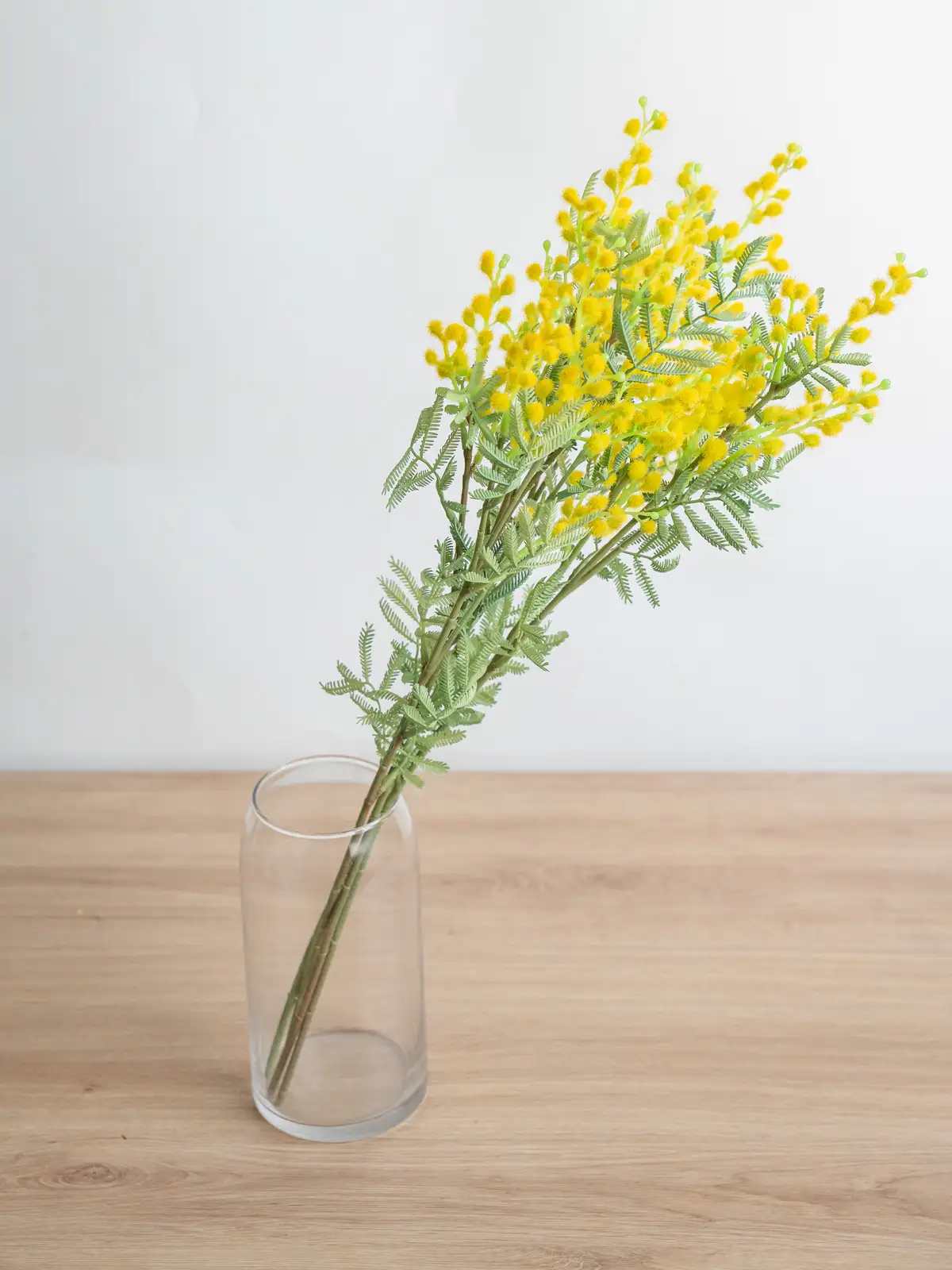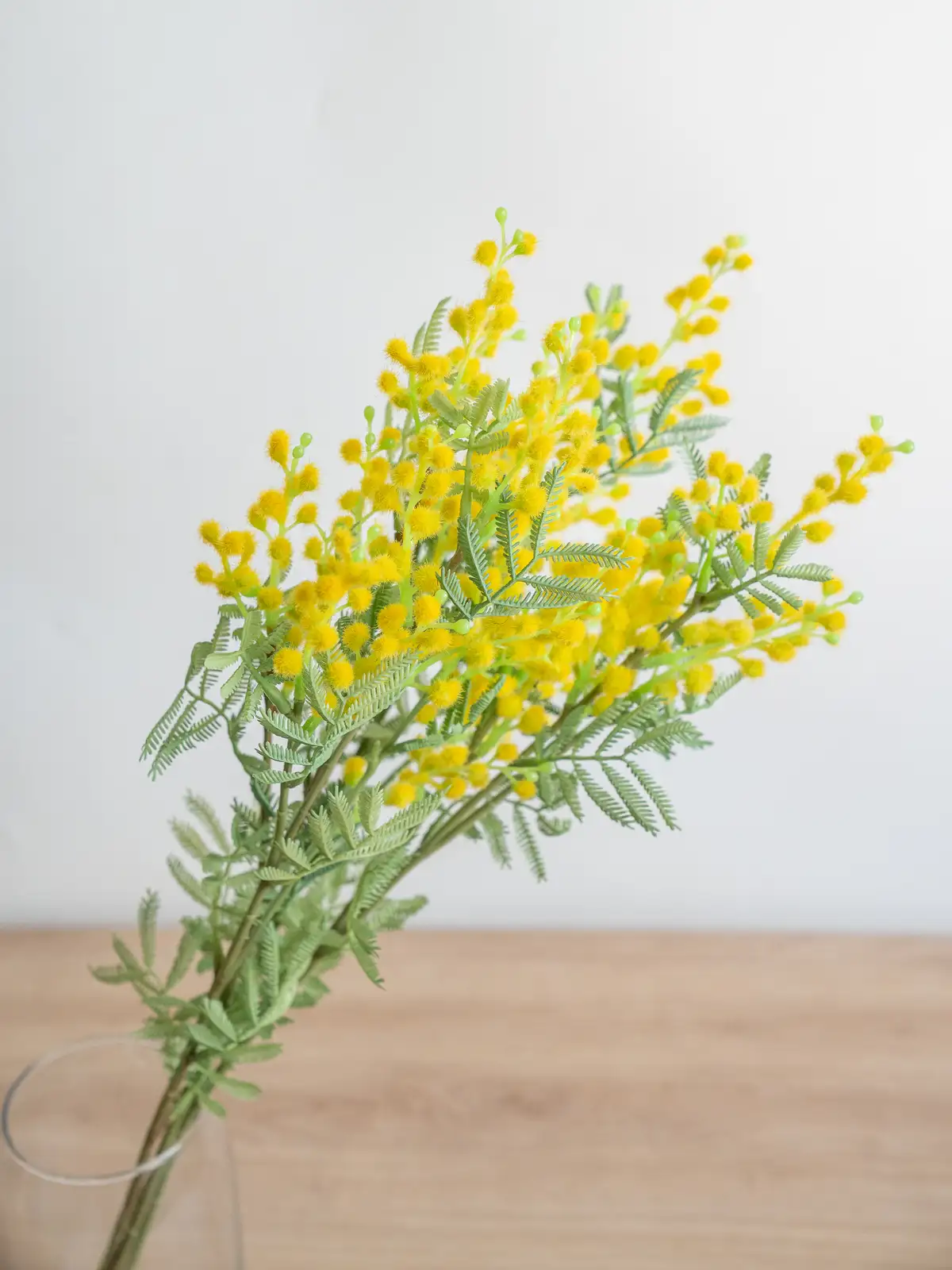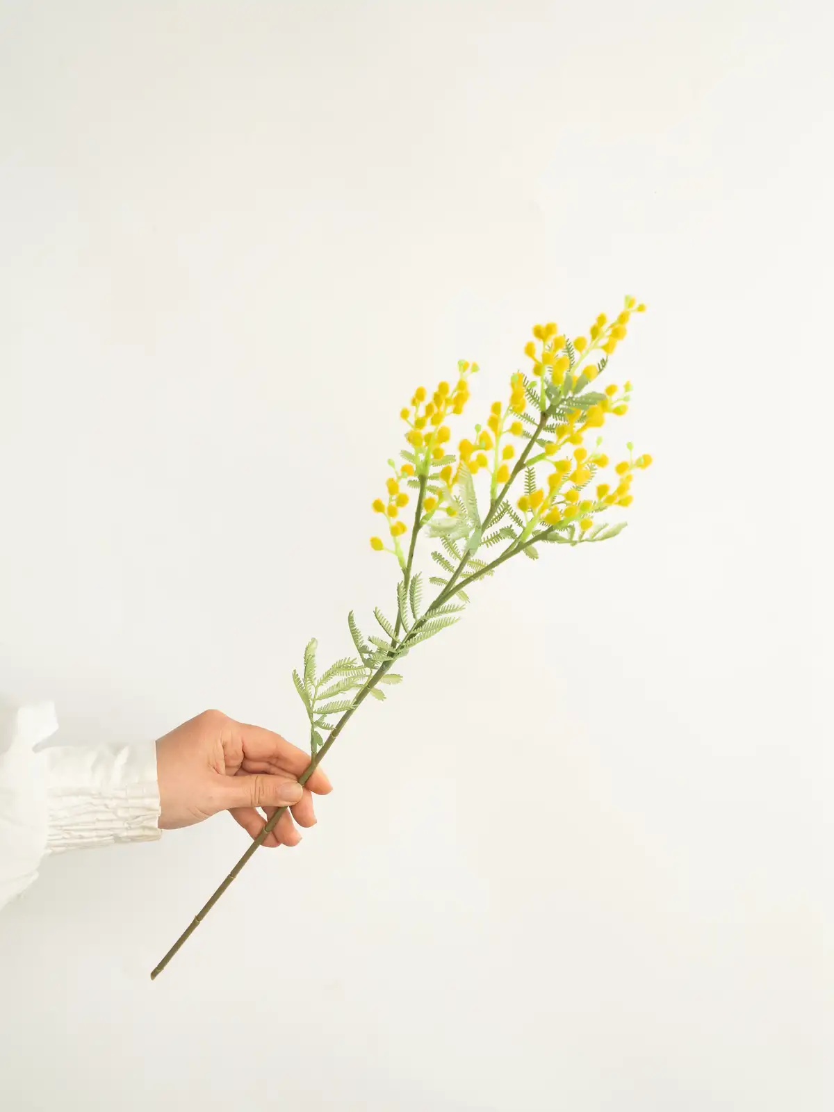 春の訪れを感じさせるミモザ。明るいイエローが印象的なスプレータイプの造花です。枝分かれした小花が軽やかな動きを生み、ディスプレイや装花に自然なボリューム感をプラスします。管理不要で扱いやすく、季節演出にも取り入れやすい一本です。