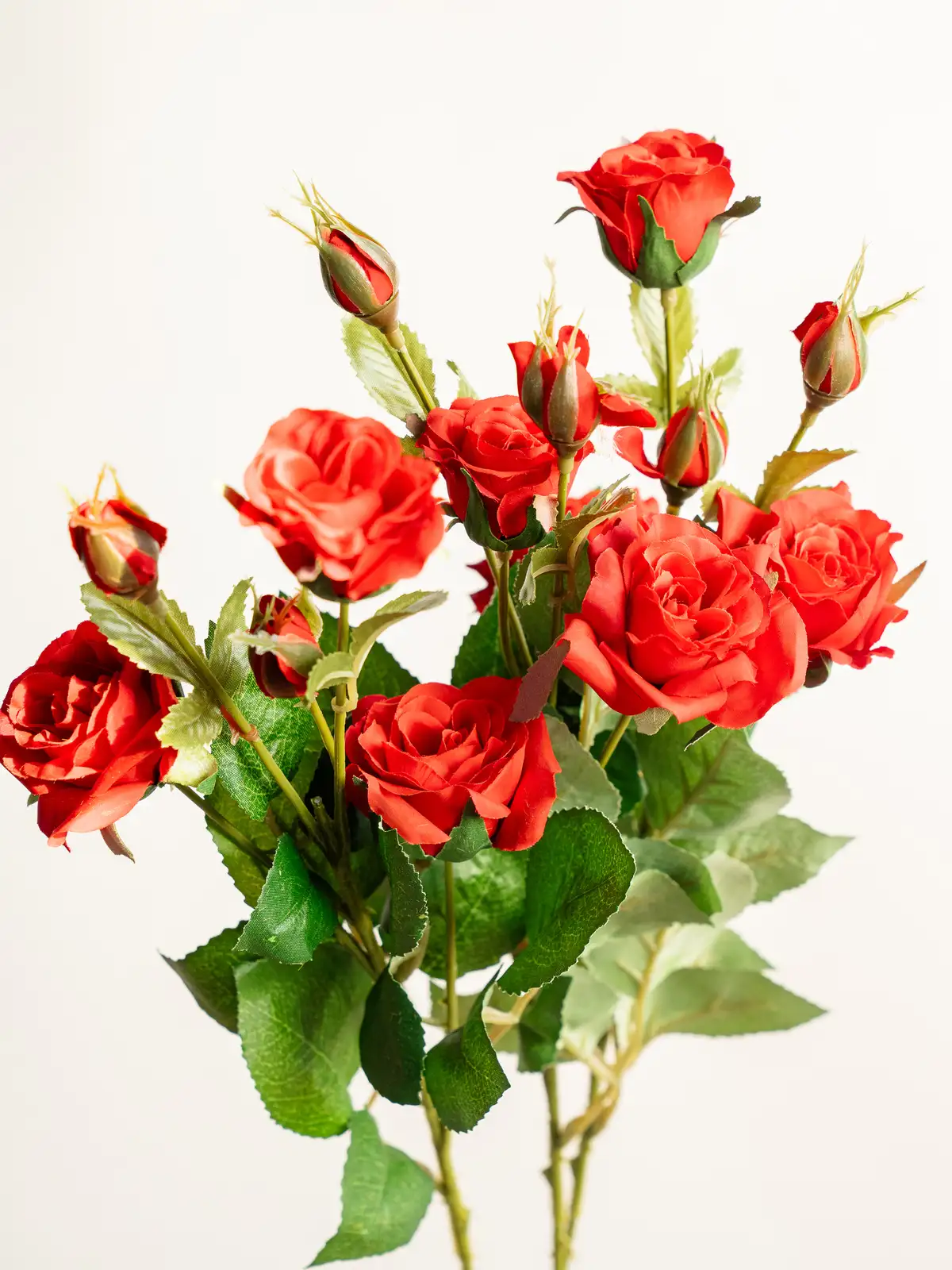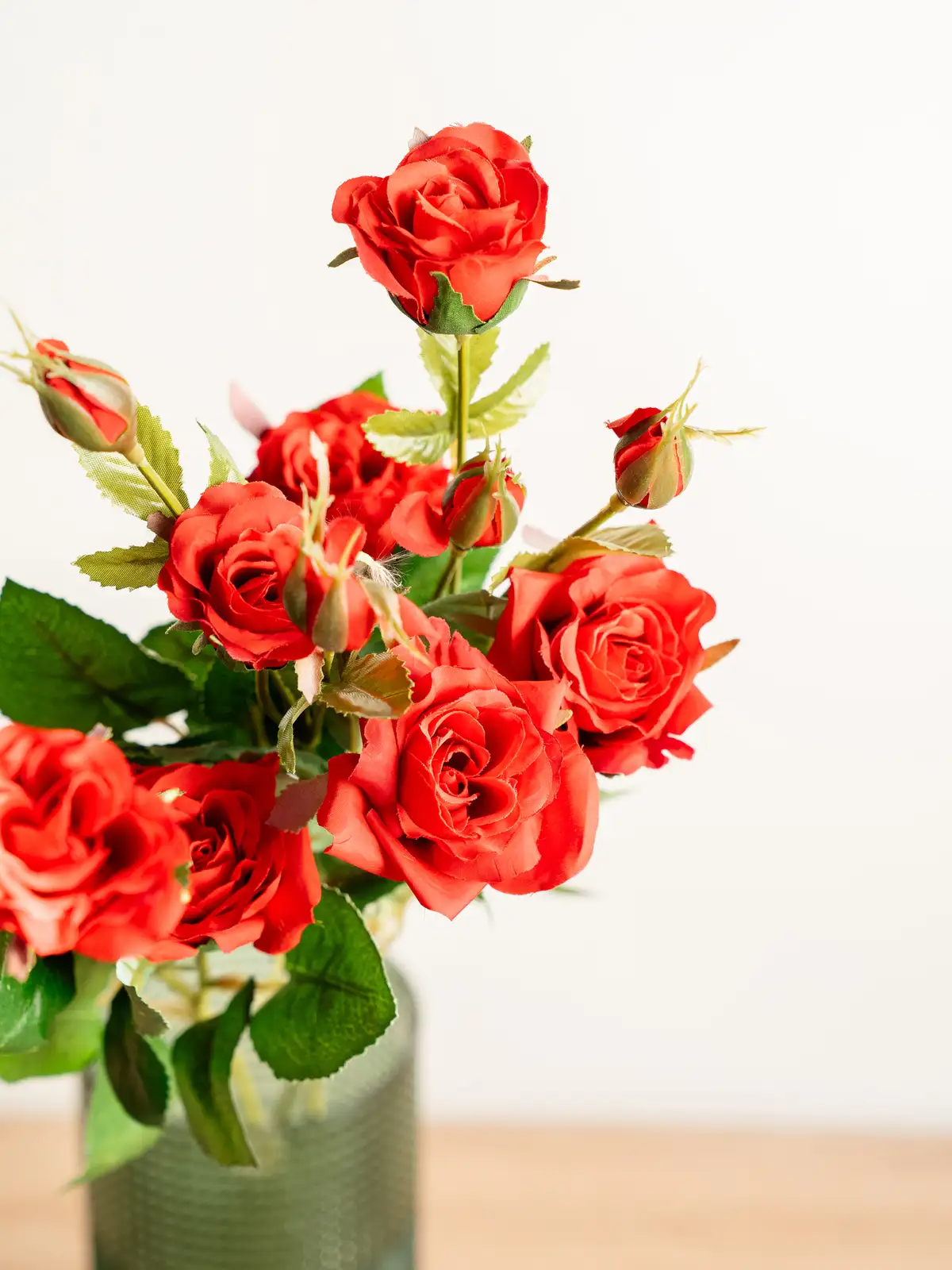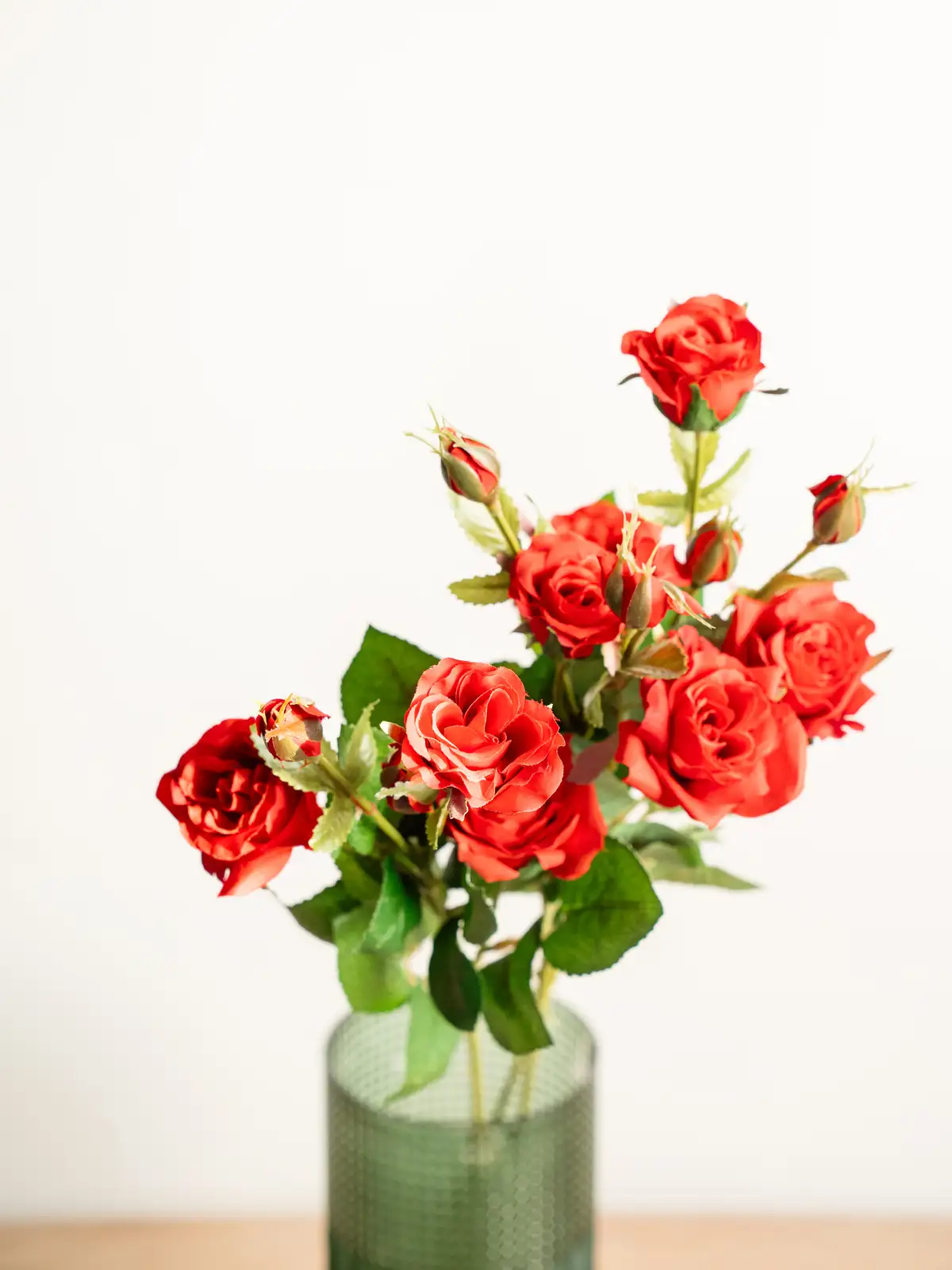 深みのあるレッドが印象的なスプレータイプのバラの造花です。枝分かれした複数の花が立体感と動きを生み、装花やディスプレイに自然なボリュームをプラスします。管理不要で美しさが長く続き、主役にもアクセントにも使いやすい一本です。
