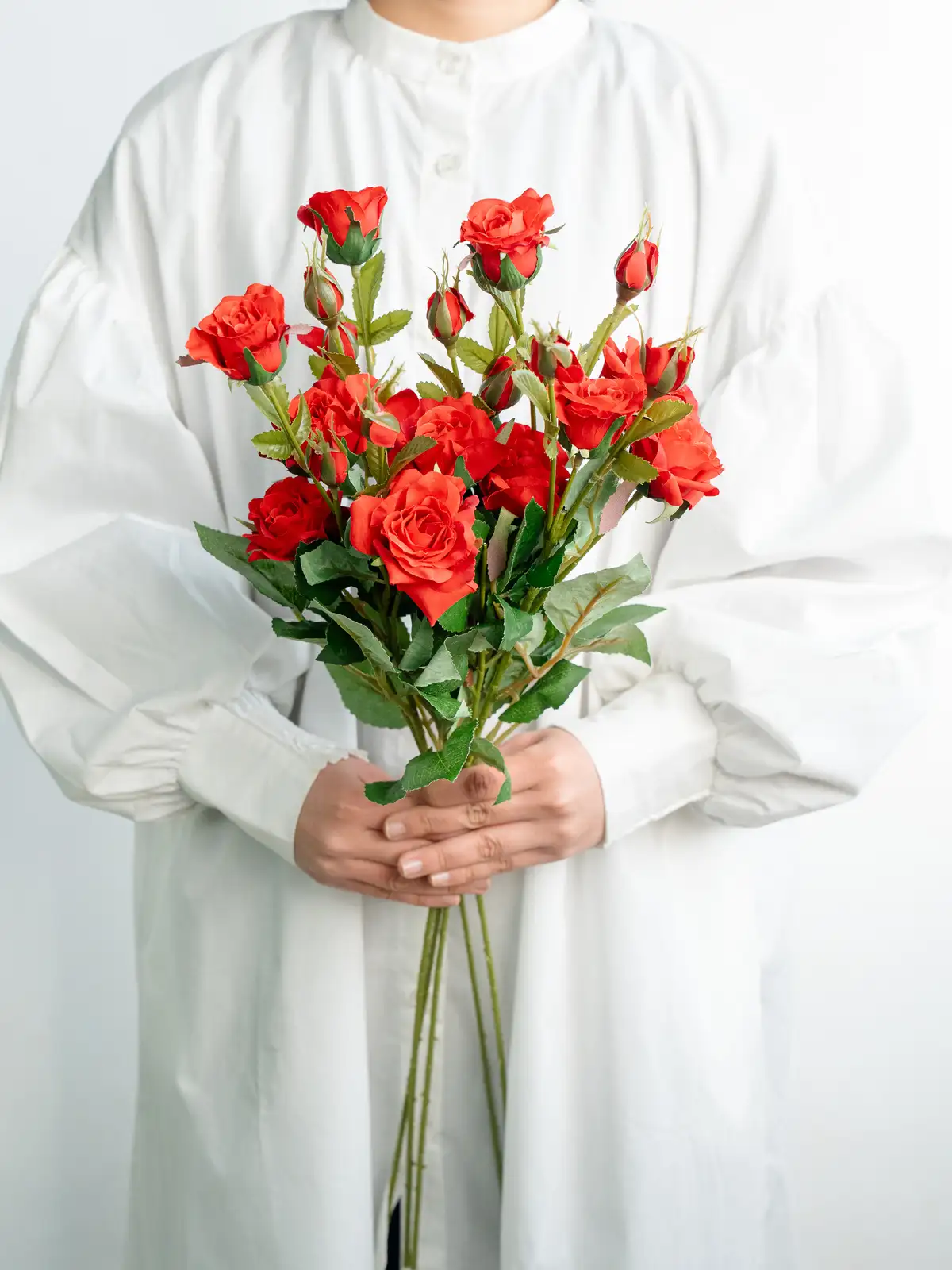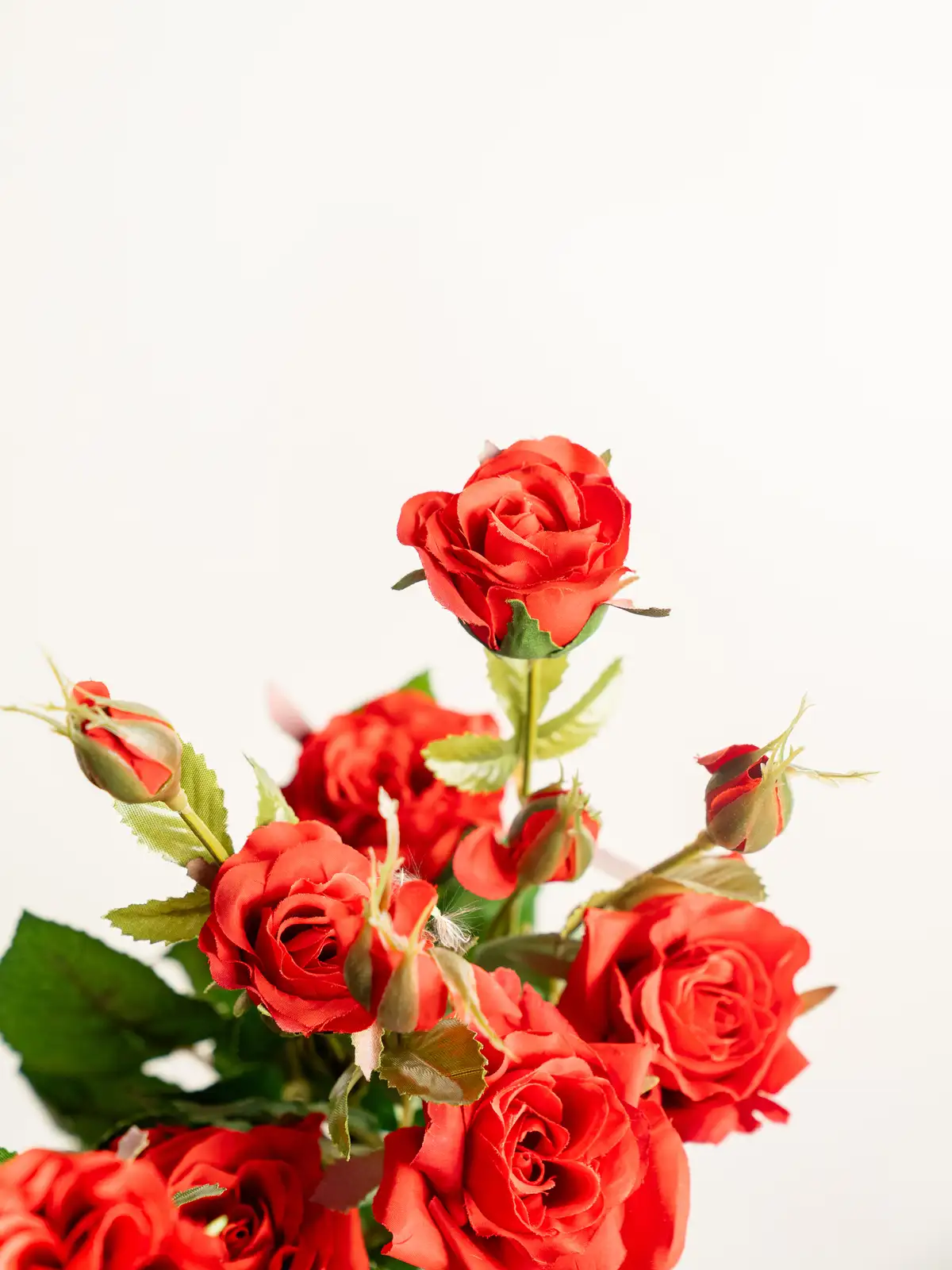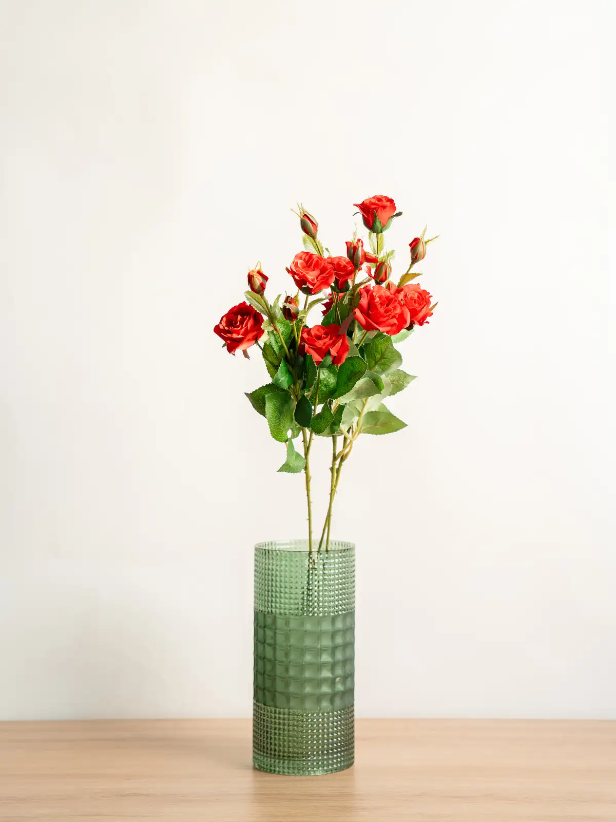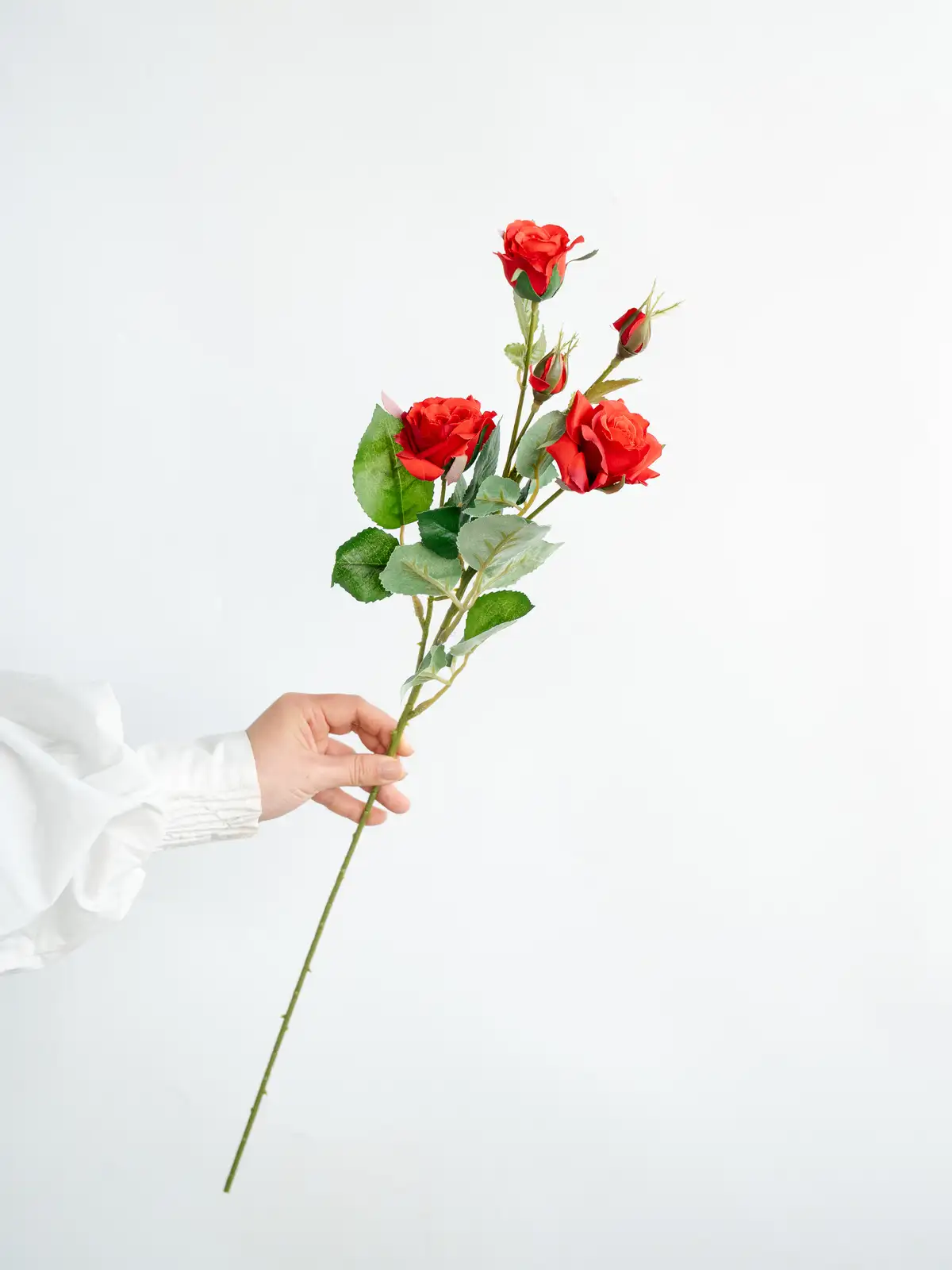 深みのあるレッドが印象的なスプレータイプのバラの造花です。枝分かれした複数の花が立体感と動きを生み、装花やディスプレイに自然なボリュームをプラスします。管理不要で美しさが長く続き、主役にもアクセントにも使いやすい一本です。