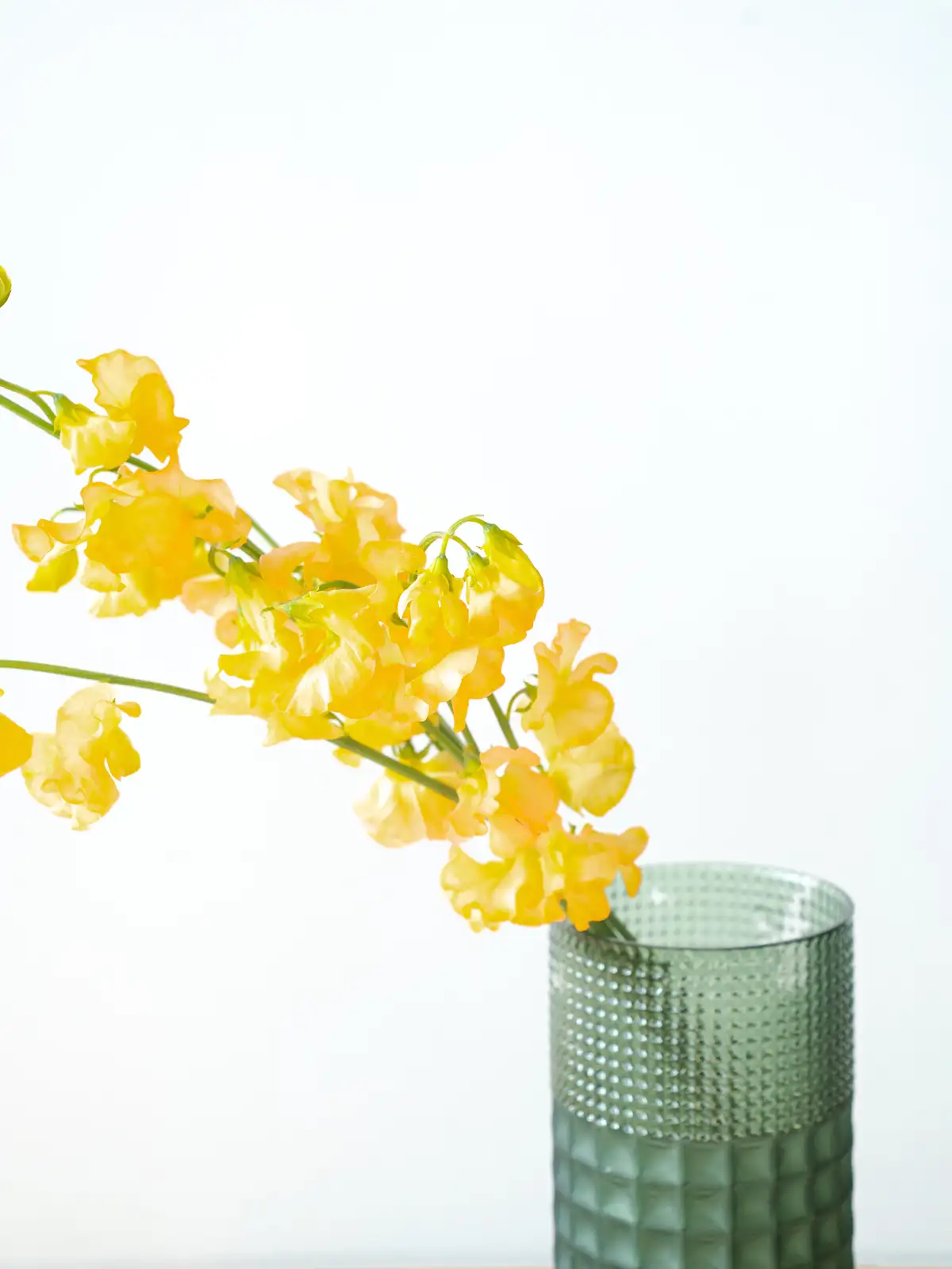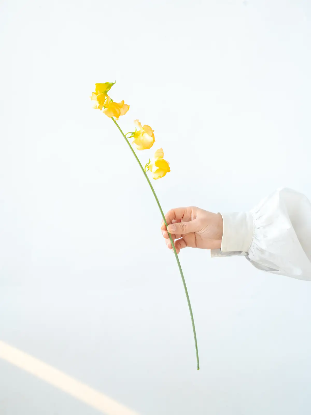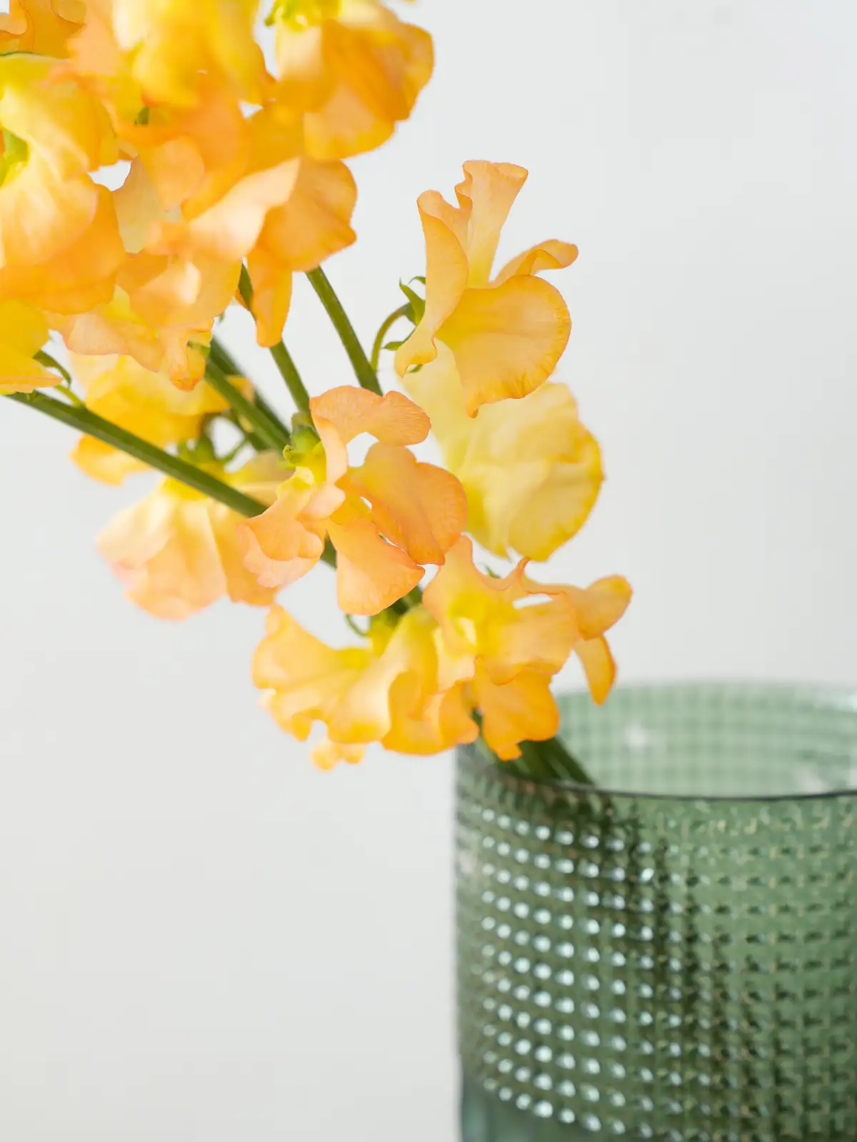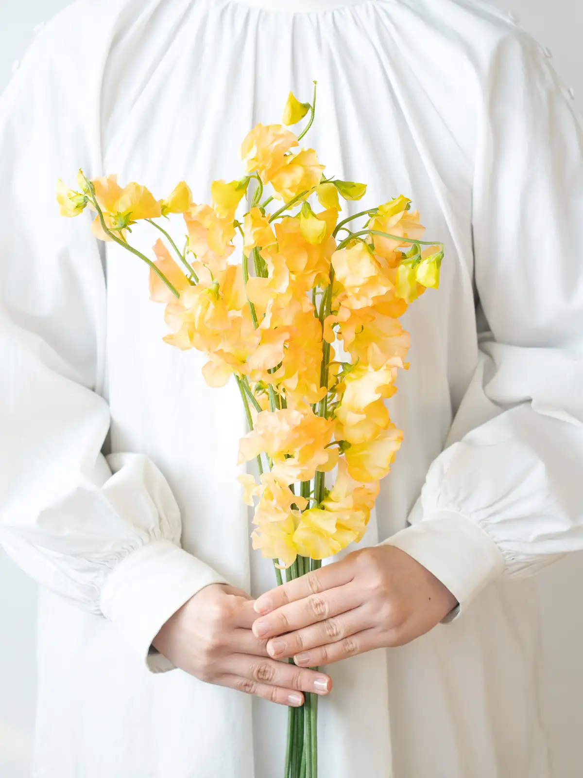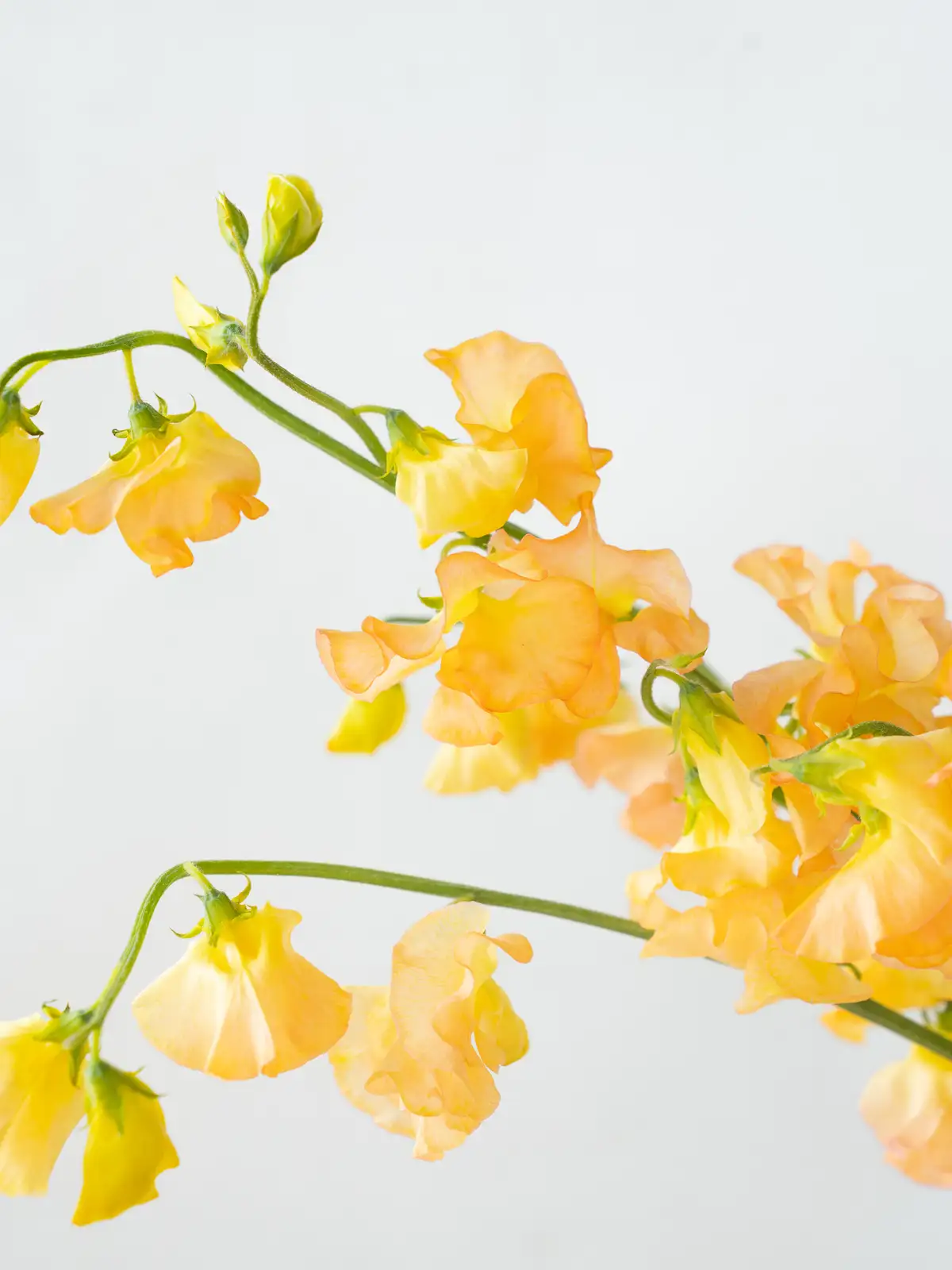 ややくすみを含んだオレンジ色が特徴。柔らかな色合いで、落ち着いた雰囲気のオレンジ系スイートピーです。