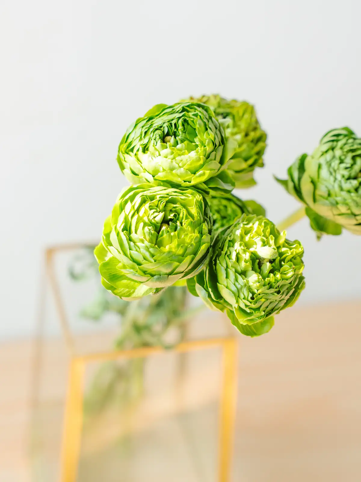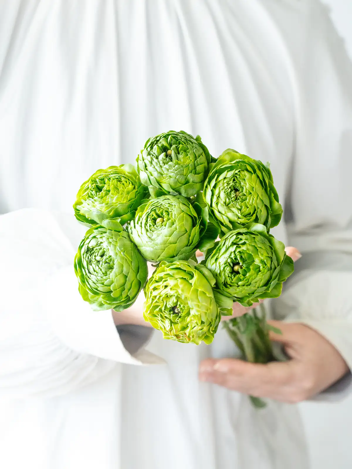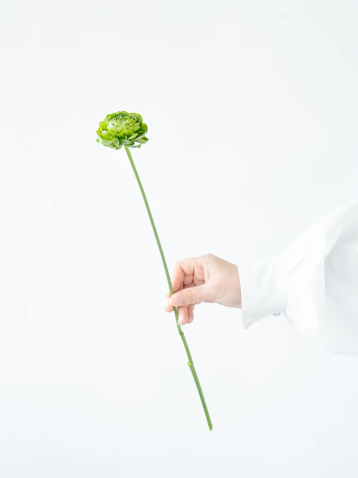 グリーン系の花色が珍しいラナンキュラス。花弁が密に重なり、落ち着いたニュアンスカラーが魅力です。