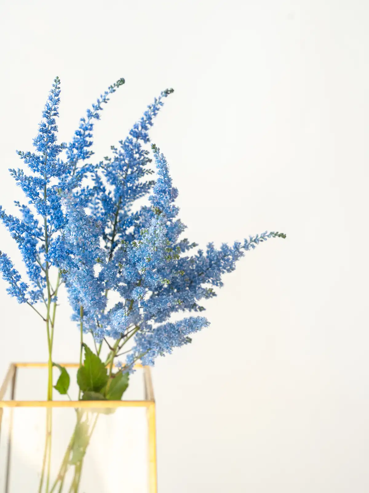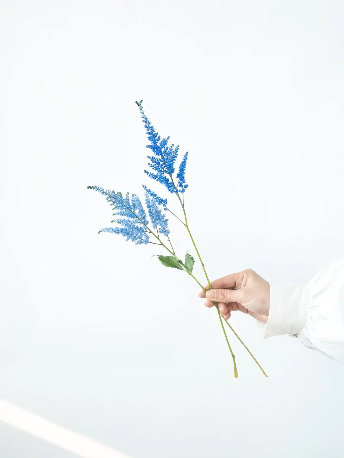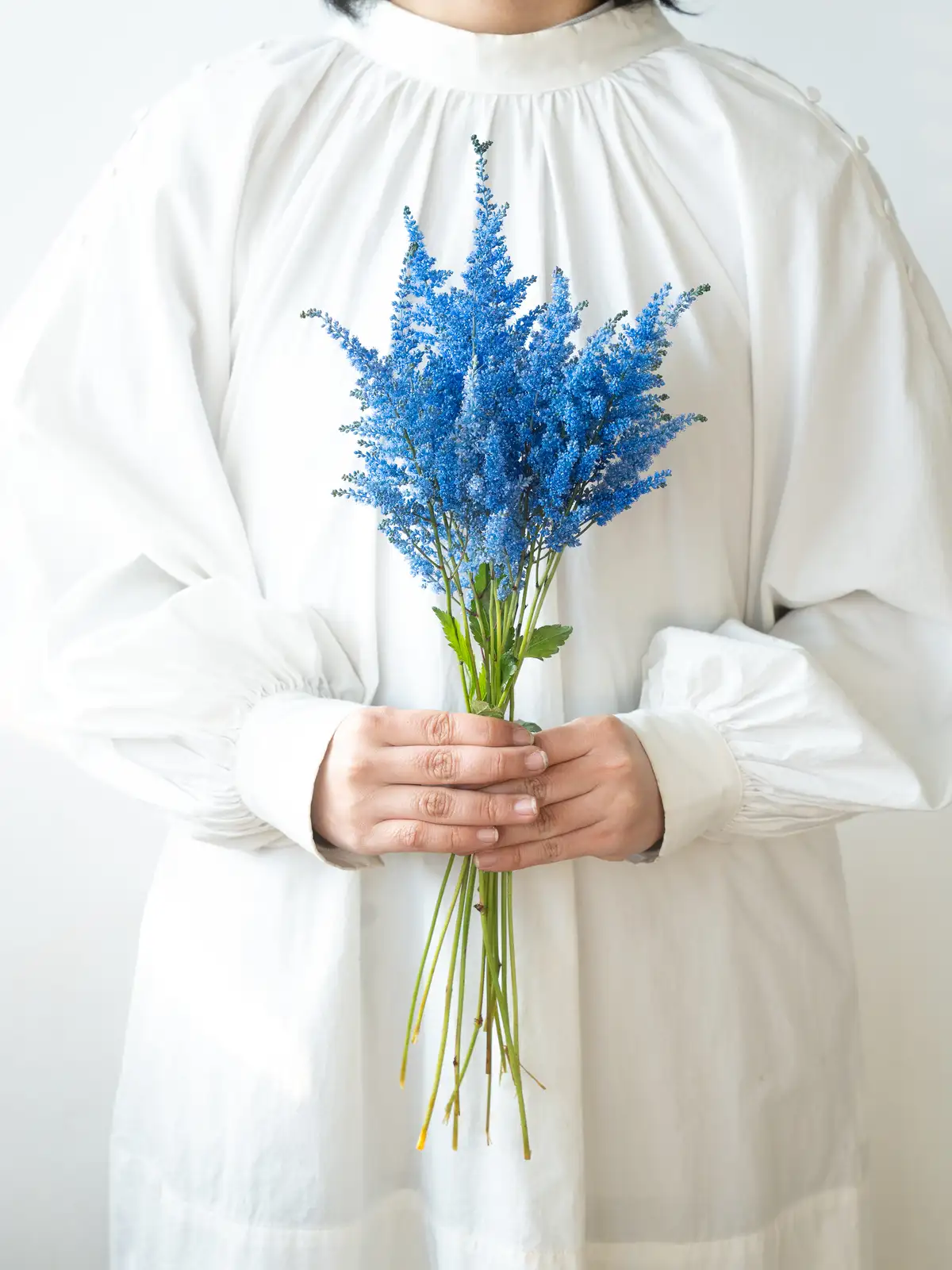 アスチルベの穂状花を青系に染めた素材。繊細な花房の質感はそのままに、鮮やかな色味がアクセントになります。