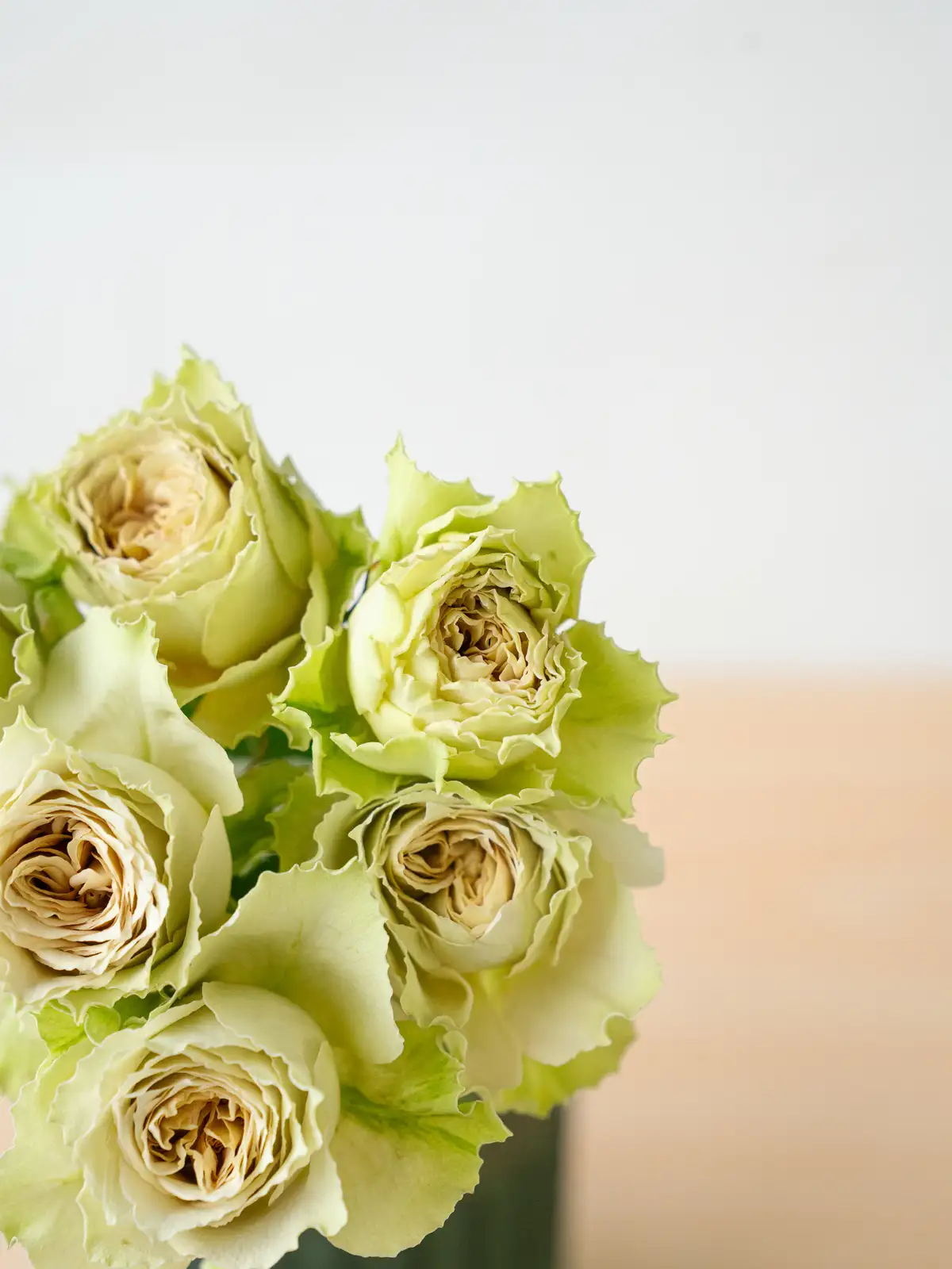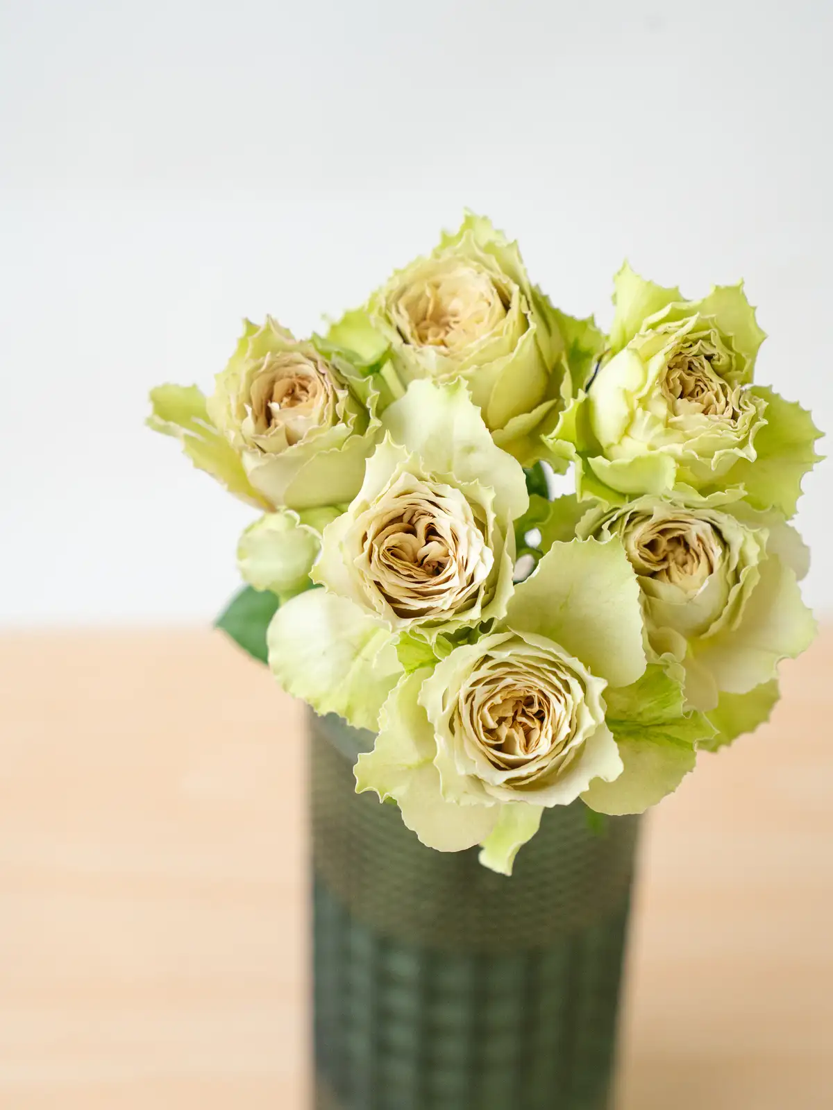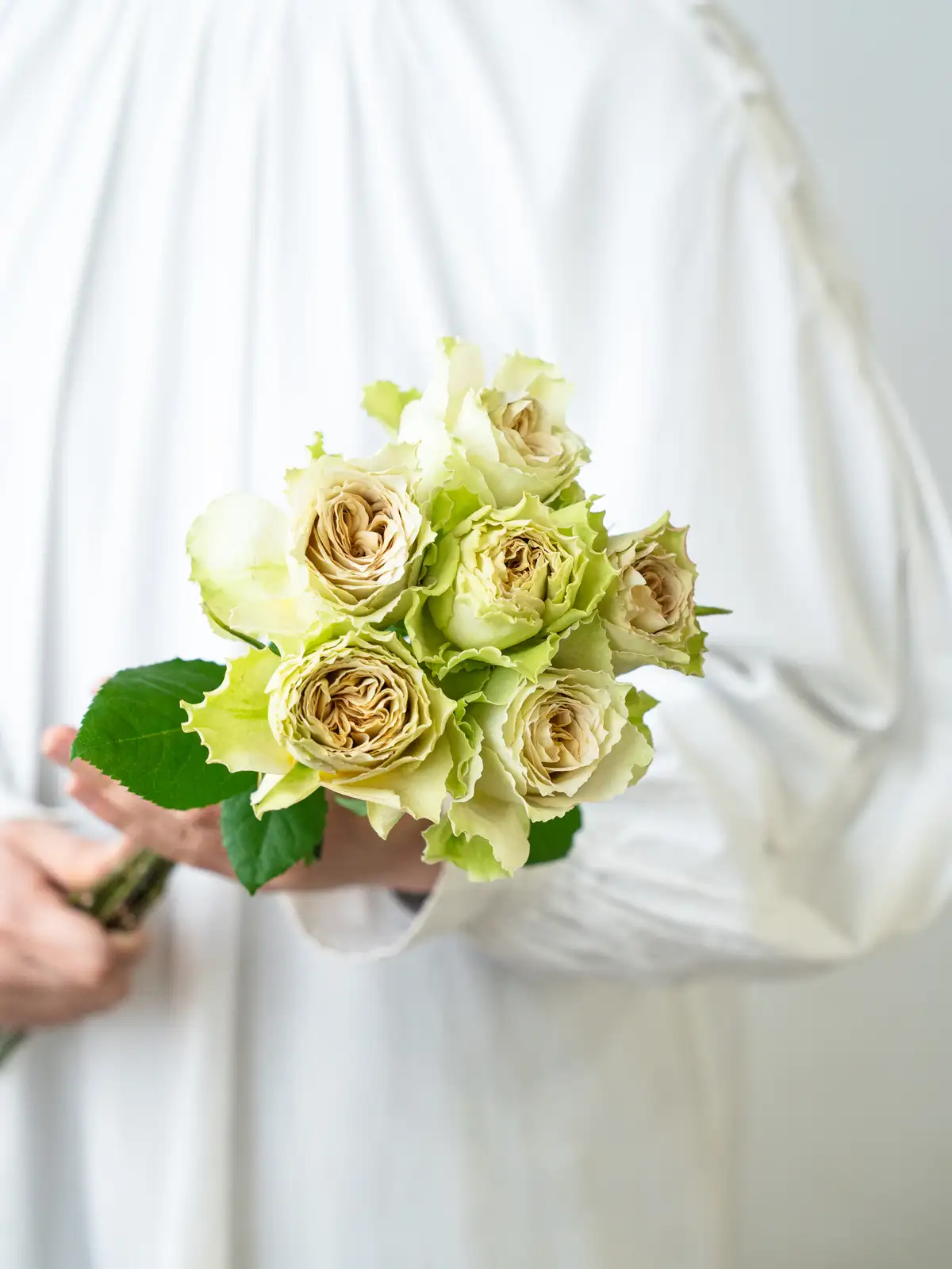 グリーンを帯びた花色が特徴のニュアンス系バラ。花弁は厚みがあり、クラシカルな雰囲気の花形です。