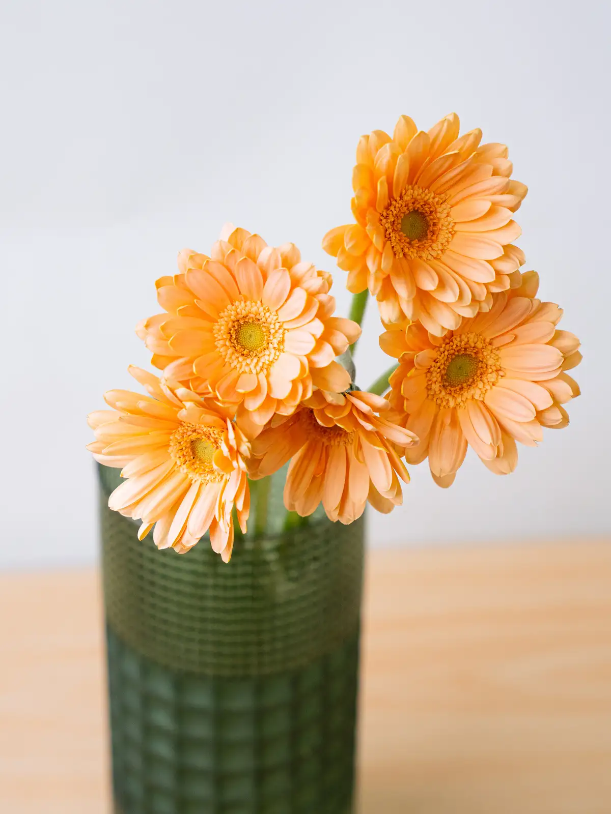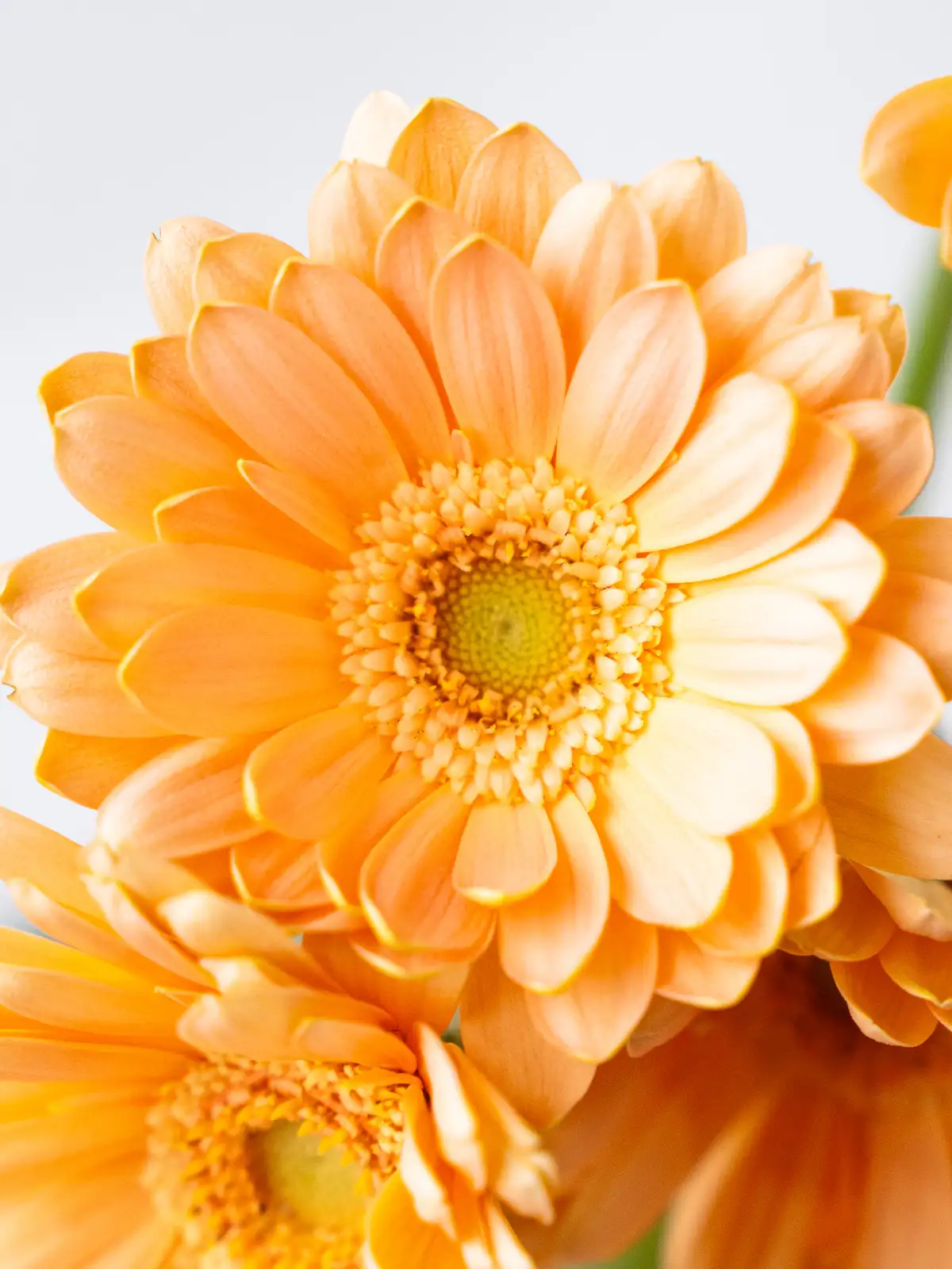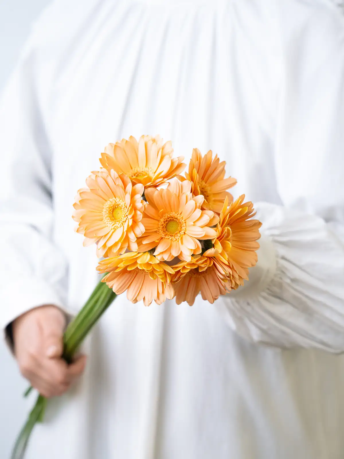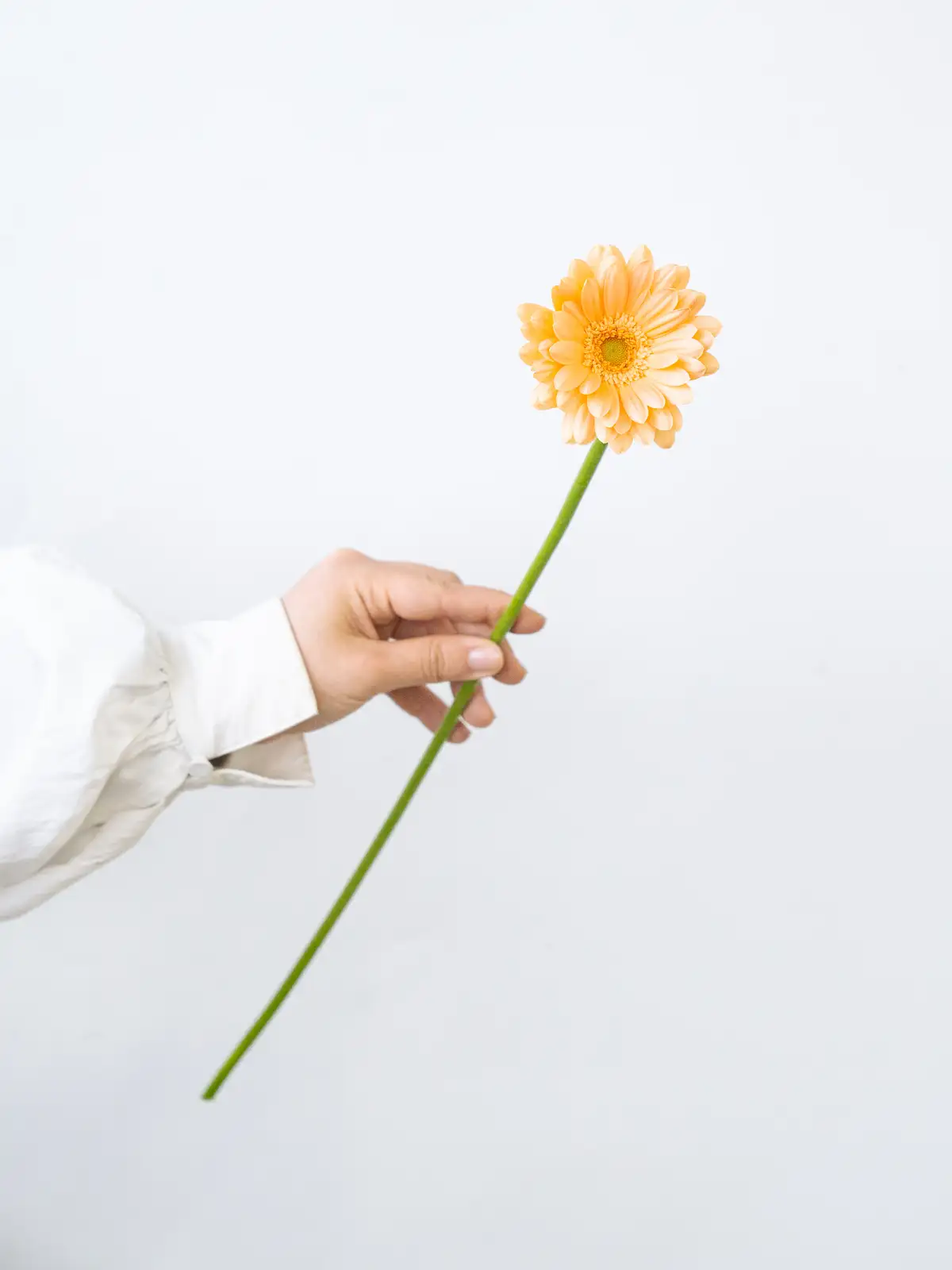 やわらかな淡オレンジ色の花弁が特徴。優しい発色で、ナチュラルな雰囲気を持つガーベラです。