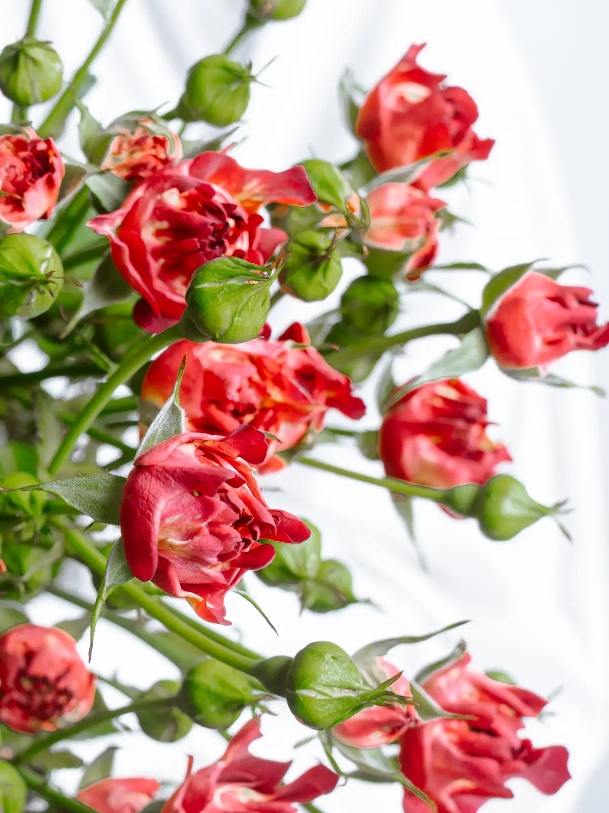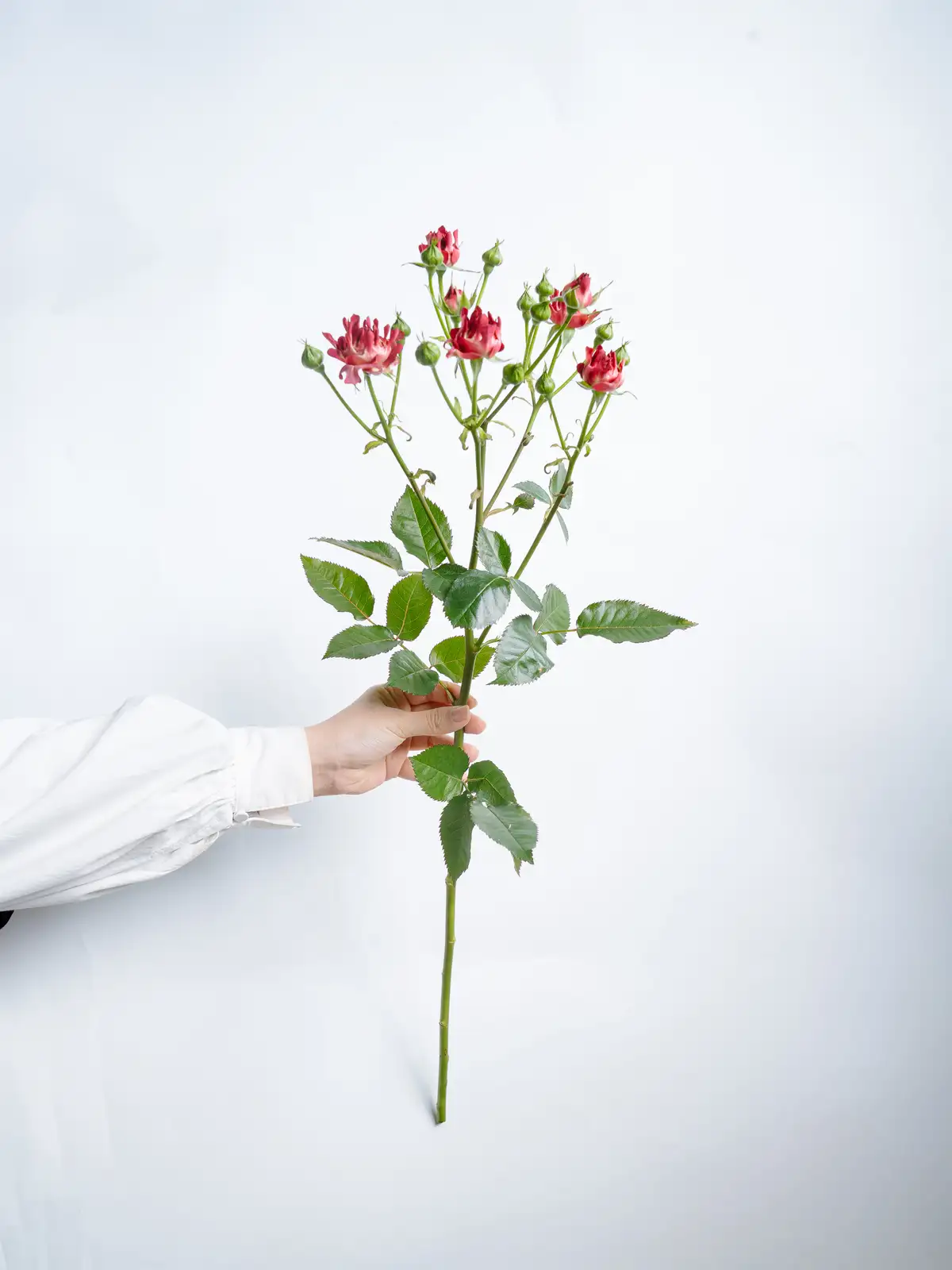 咲き始めは紅色で、開花が進むにつれて紫色へ変化するのが特徴のスプレーバラ。色の移ろいが美しい品種です。