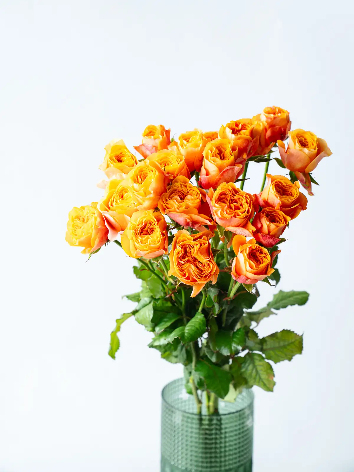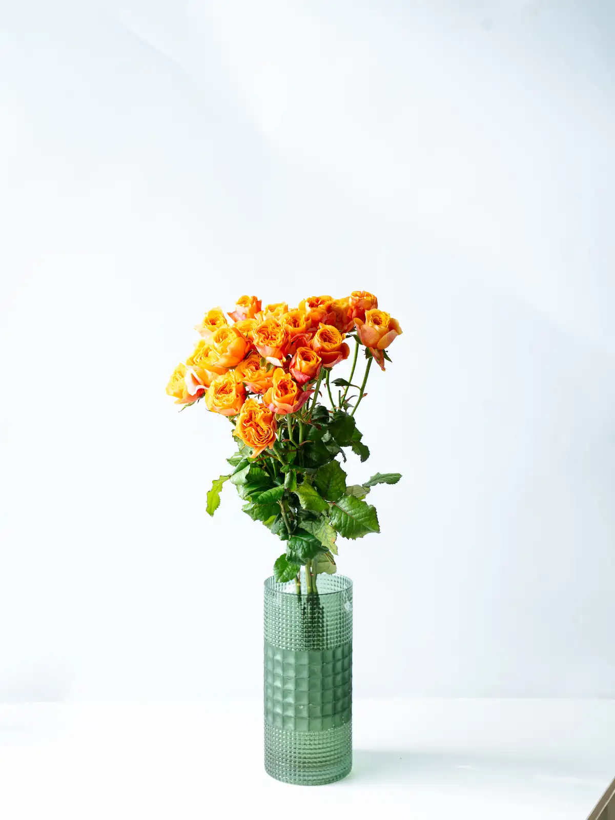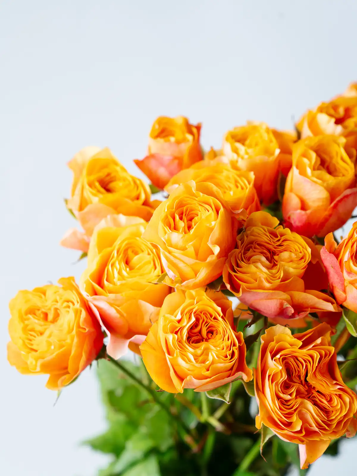 オレンジピンク系の花色が特徴のスプレーバラ。明るく温かみのある色合いで、まとまりのある花付きです。