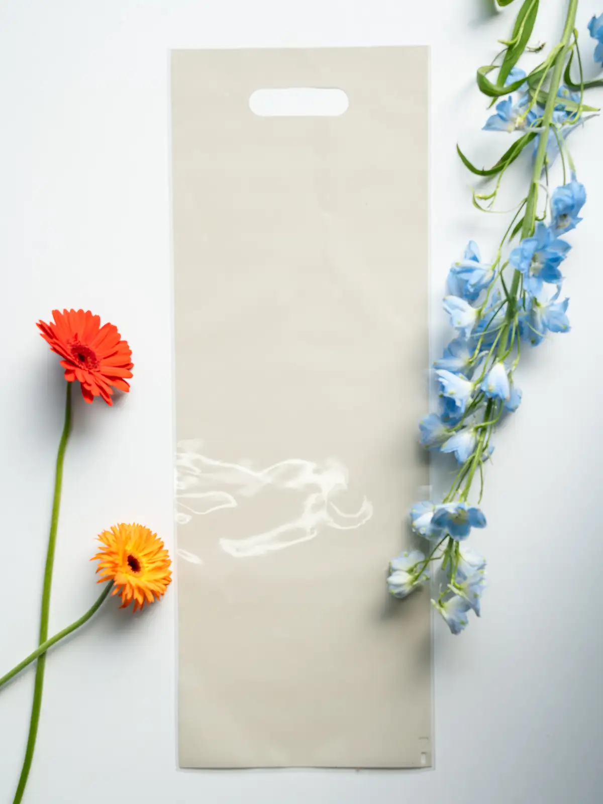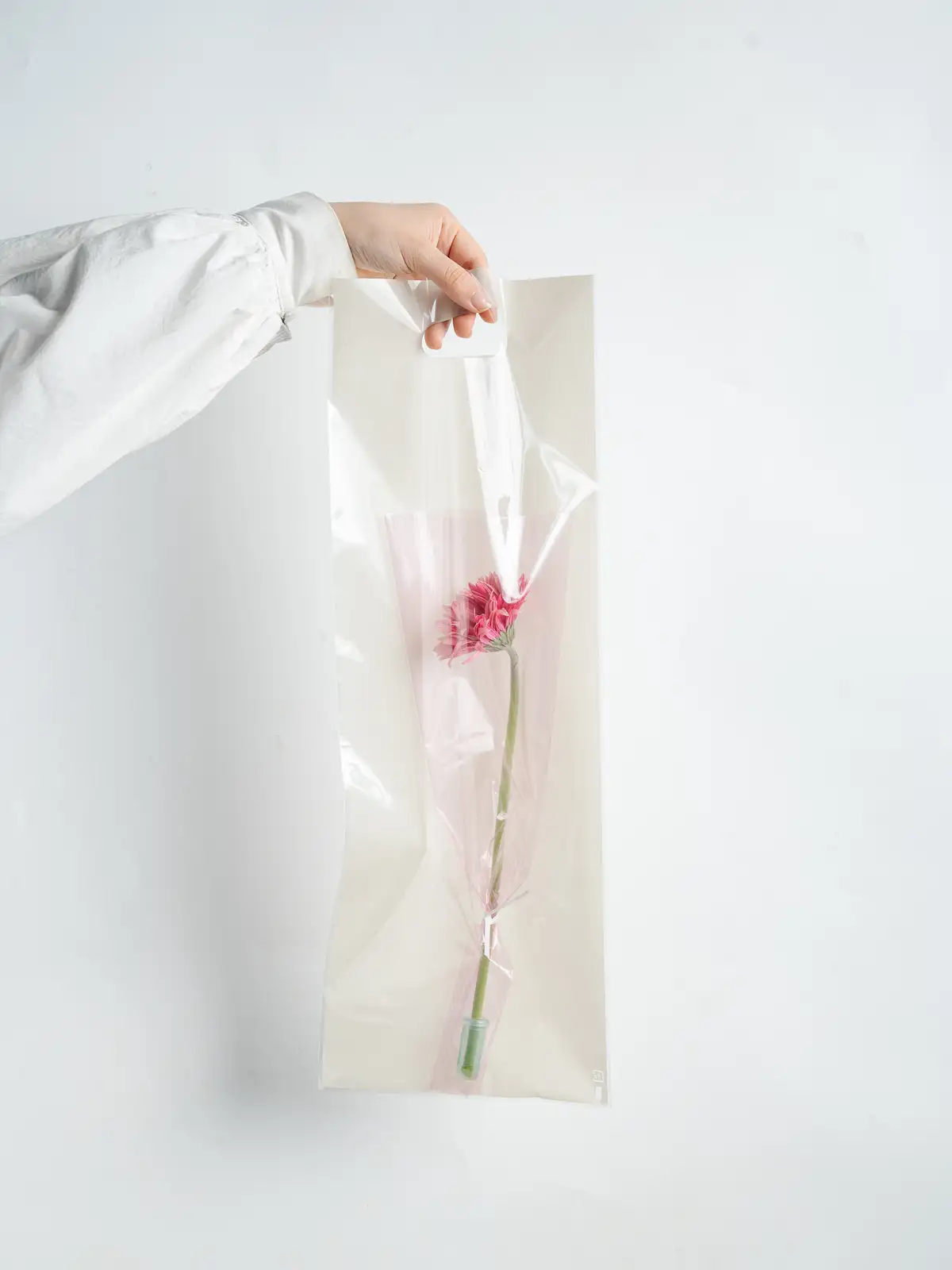 花束やギフトフラワーをお渡しする際に活躍する、底あり・持ち手付きの花袋です。お花を引き立てるシンプルなデザインで、持ち帰りにも便利です。