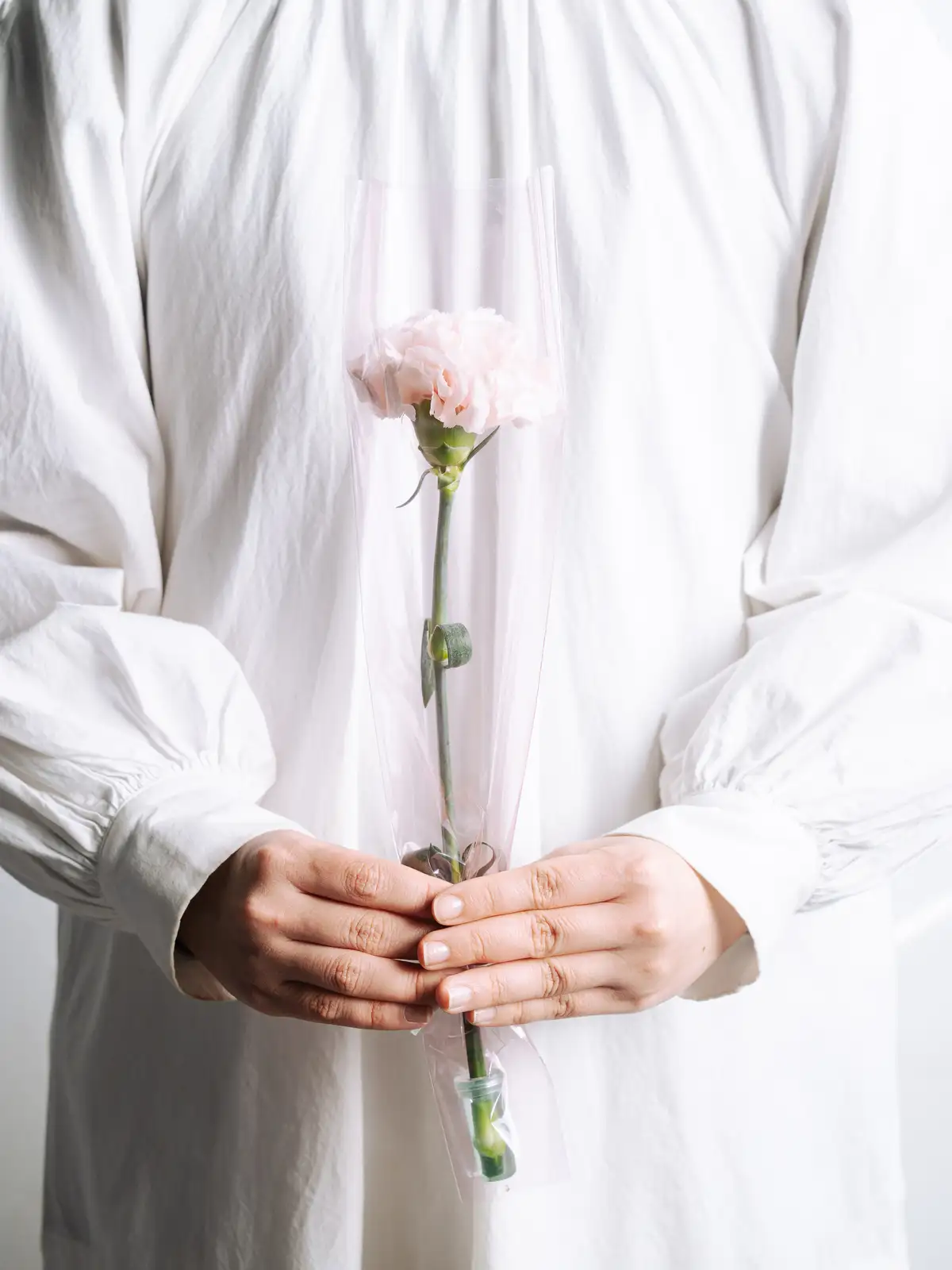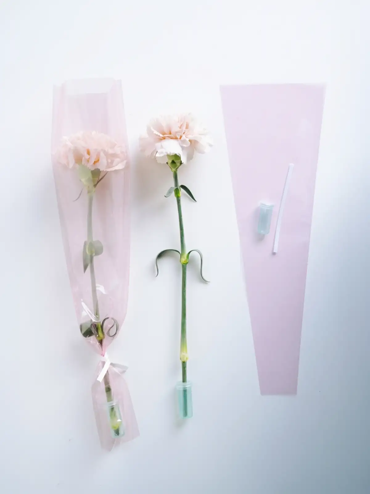ピンクのカーネーション10本を、一輪ずつラッピングしてお渡ししたい際に活躍するセットです。カーネーションに、生花用クリアフローラルチューブ、リボンタイ、シアーカラー花袋(ピンク)を組み合わせており、給水しながら見た目よく仕上げたい場面に便利です。