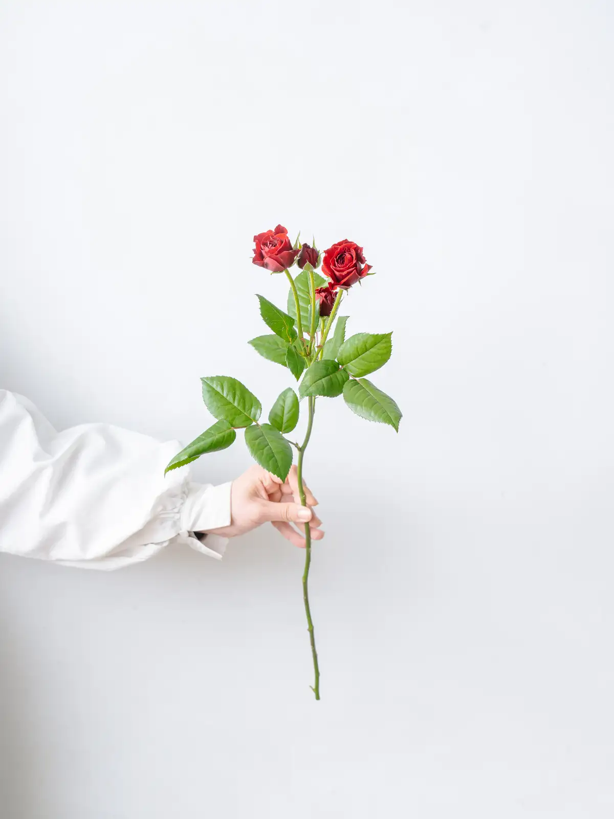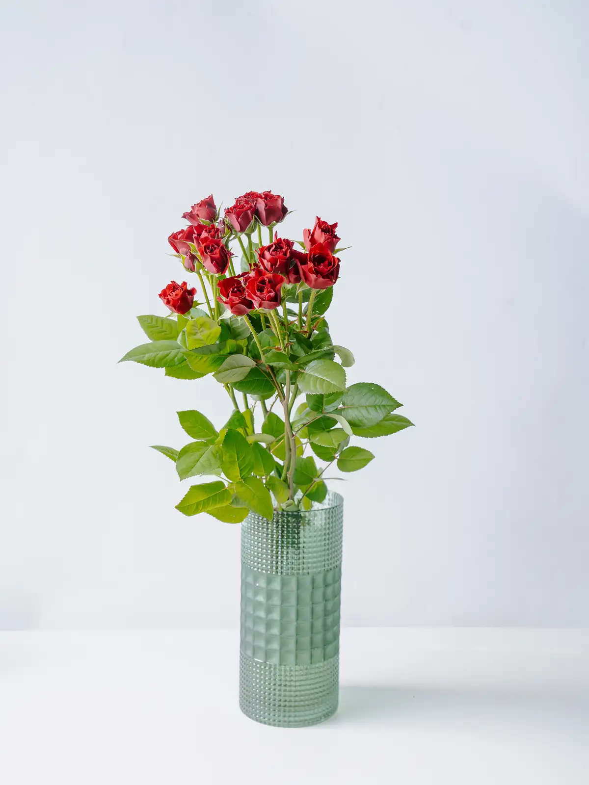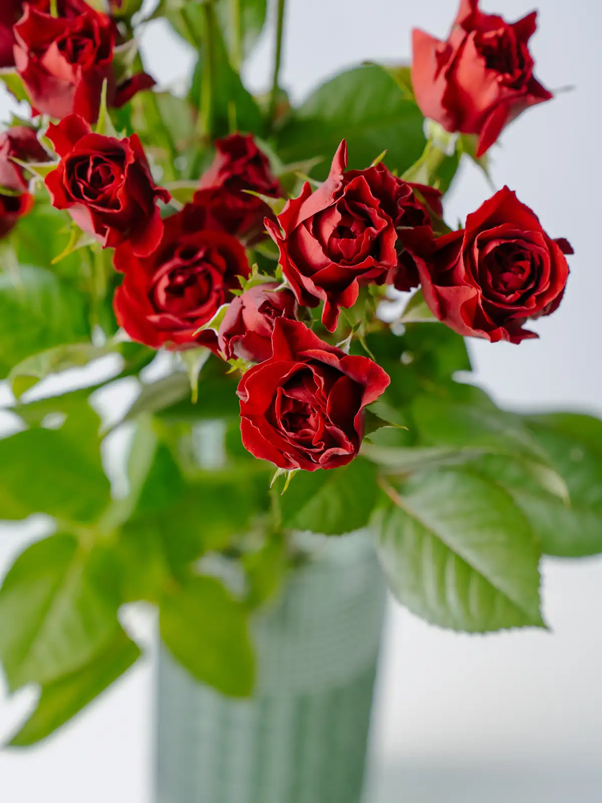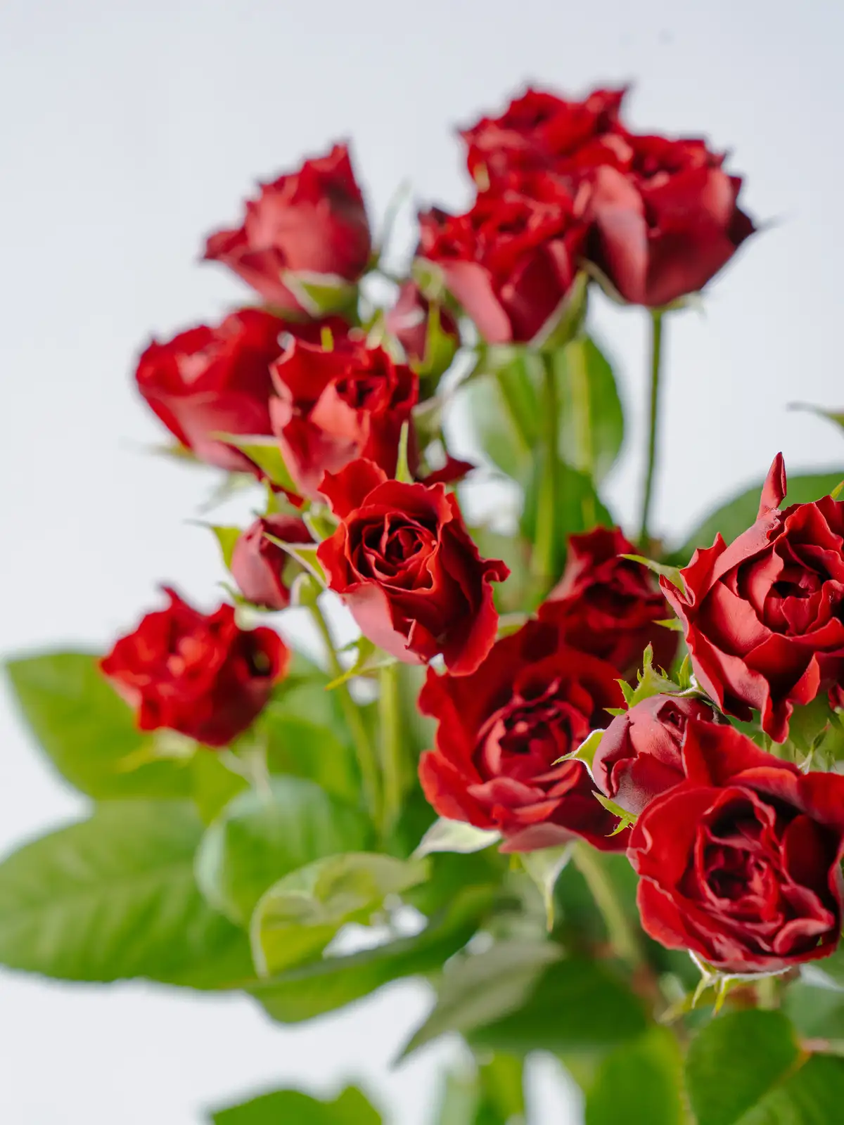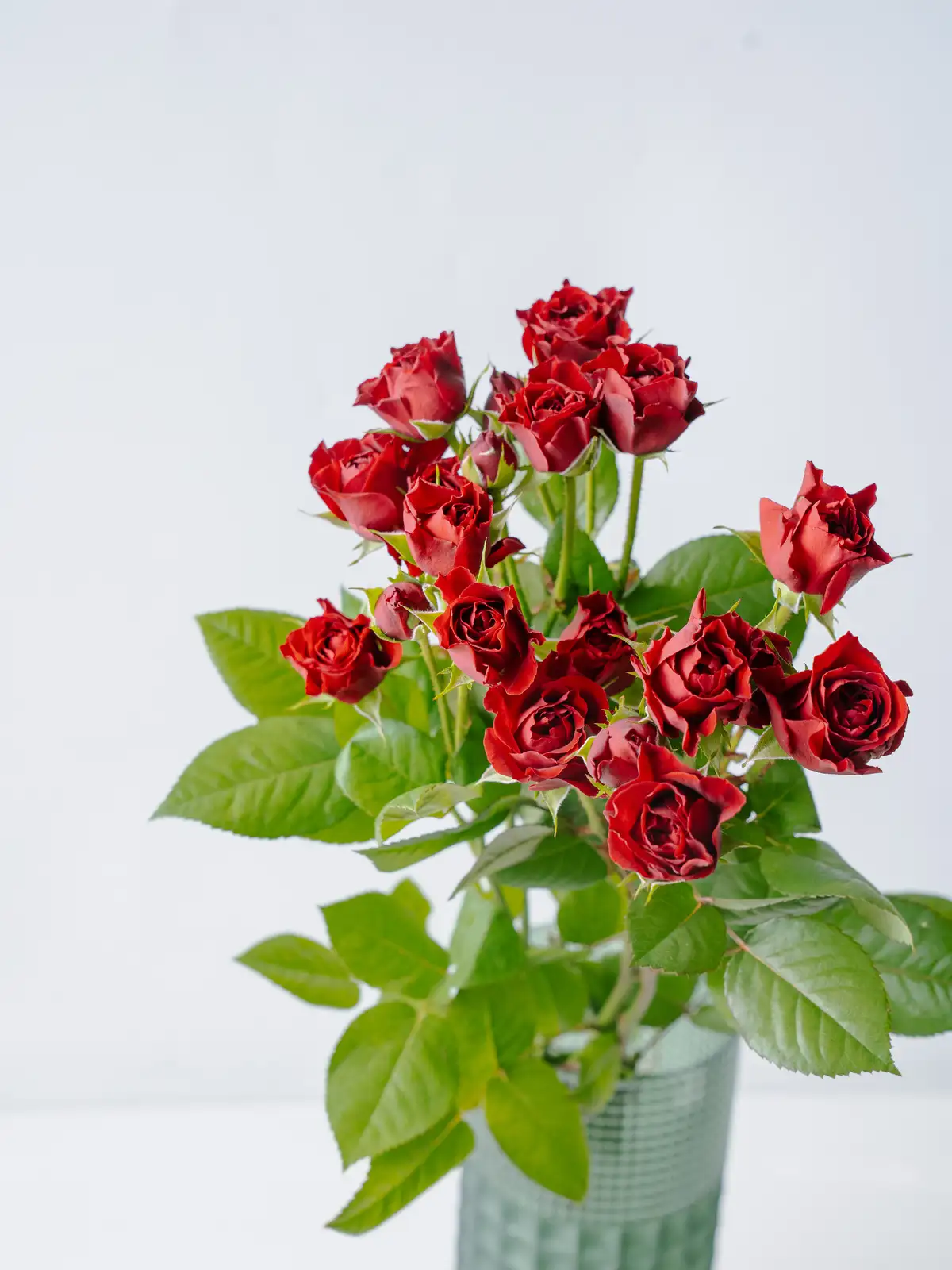濃い赤からワインレッドを思わせる深い花色が特徴のスプレーバラ。丸みのある花形で、大人っぽい落ち着いた印象です。