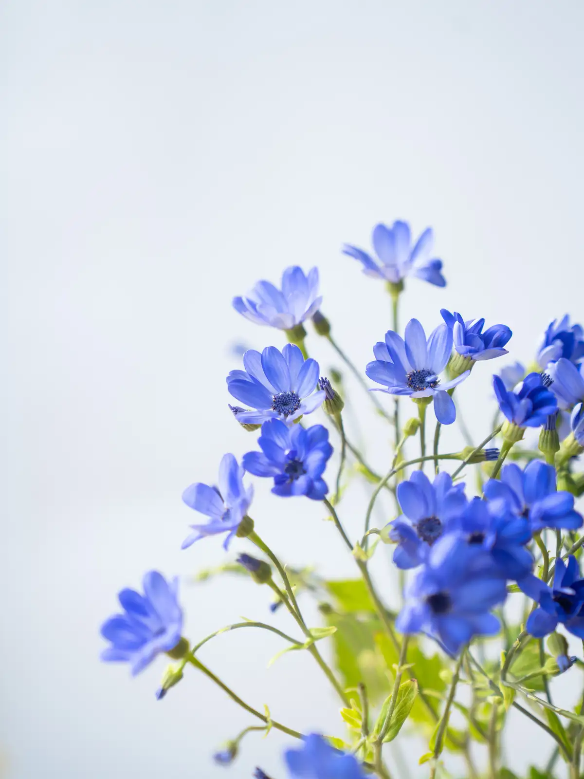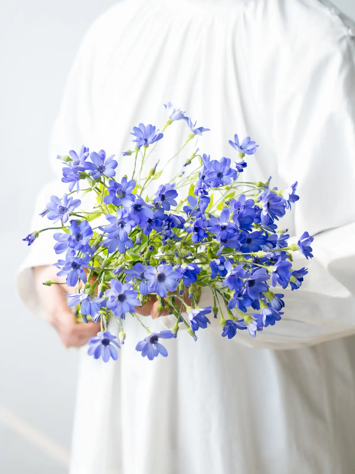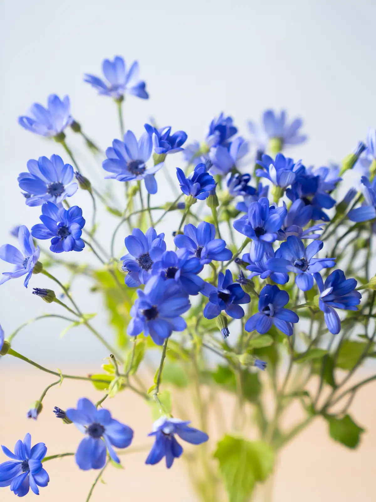 海の青を思わせる鮮やかなブルーの花色が特徴のサイネリア。ティア(Tia)シリーズは切り花向けに品種改良されており、発色が良く存在感のある青花はアレンジメントのアクセントとして人気です。