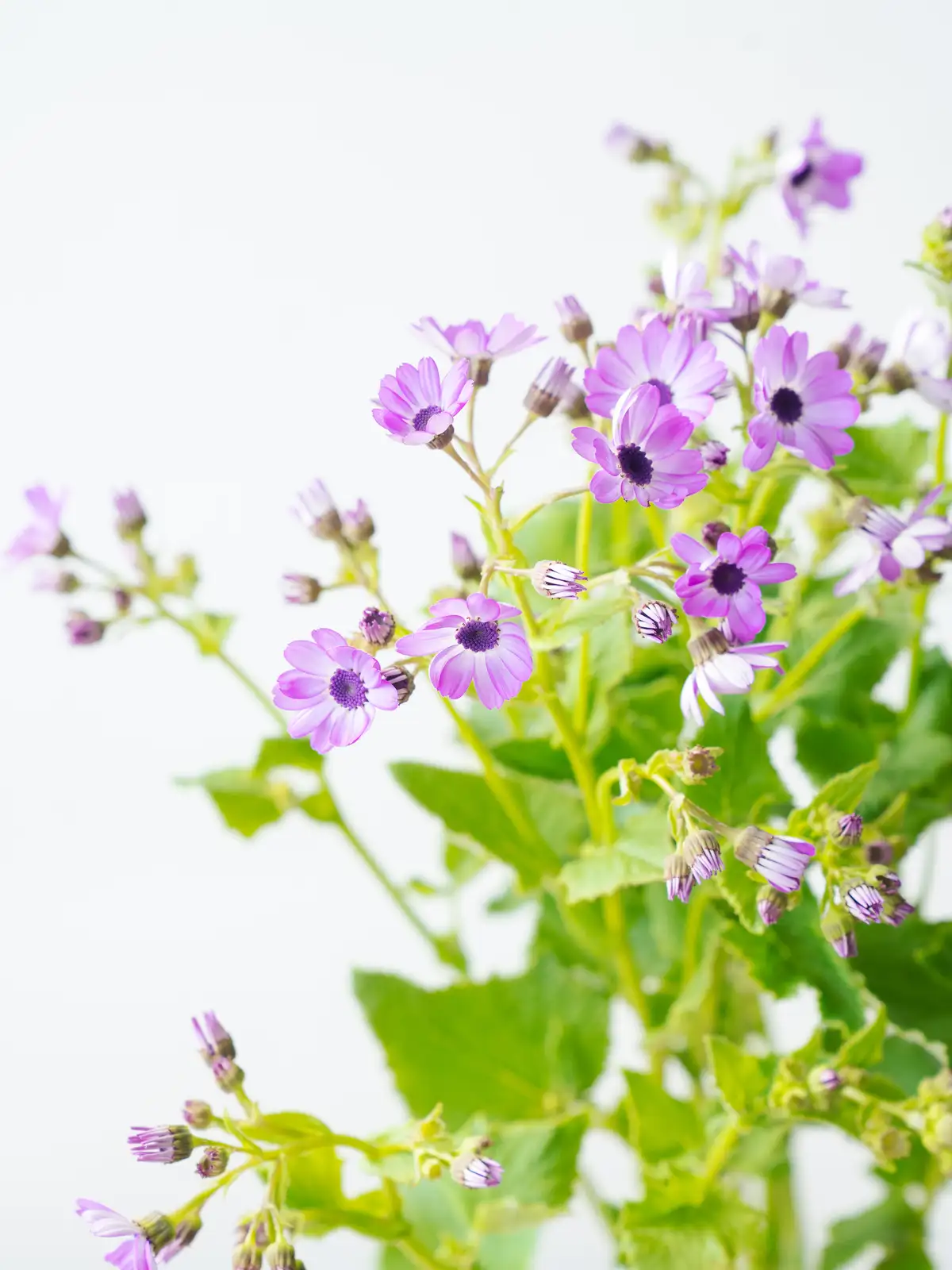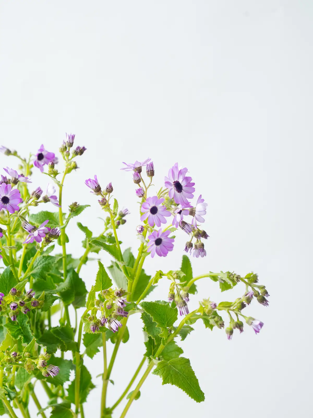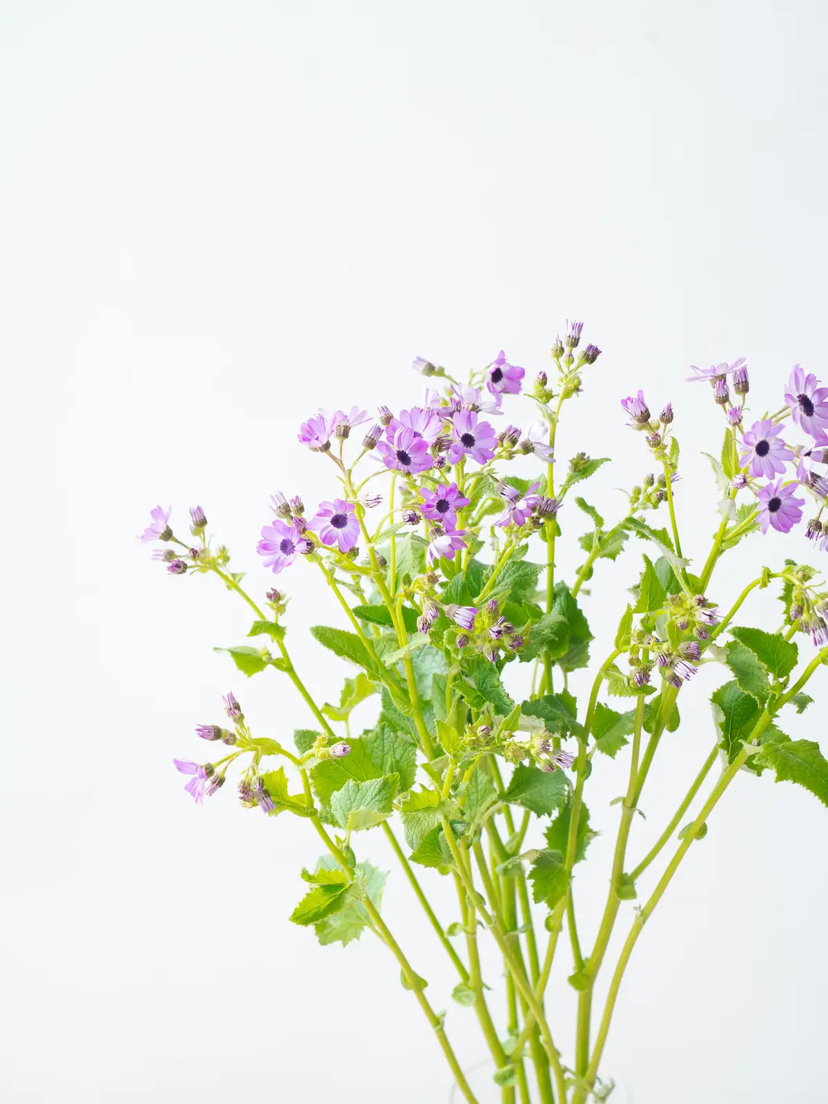 アメジストを思わせる鮮やかな紫色(バイオレット)の花色が特徴のサイネリア。茎に沿って小花が密集して咲き、アレンジメントに深みと個性を加えるアクセント花材として活躍します。