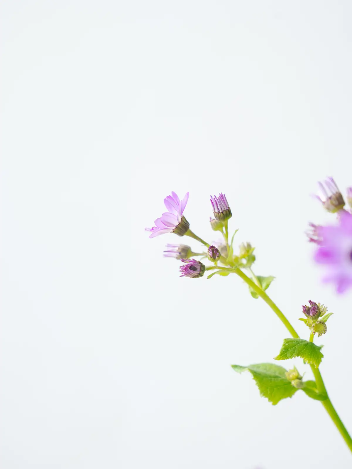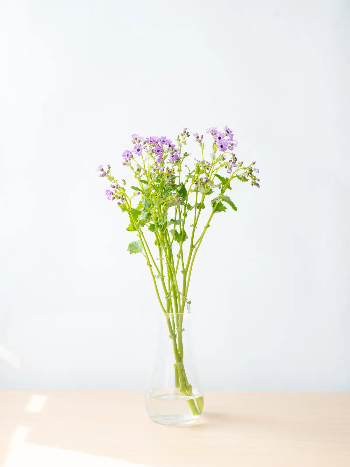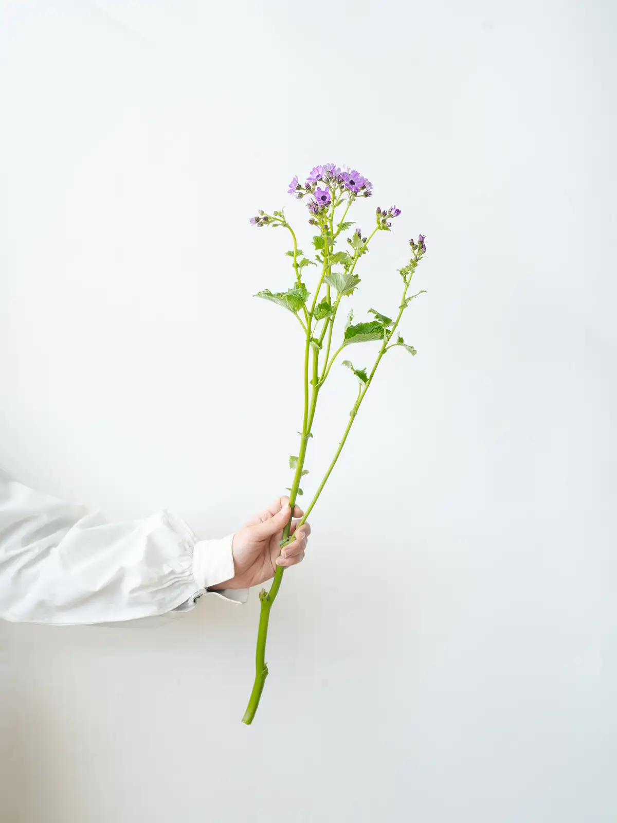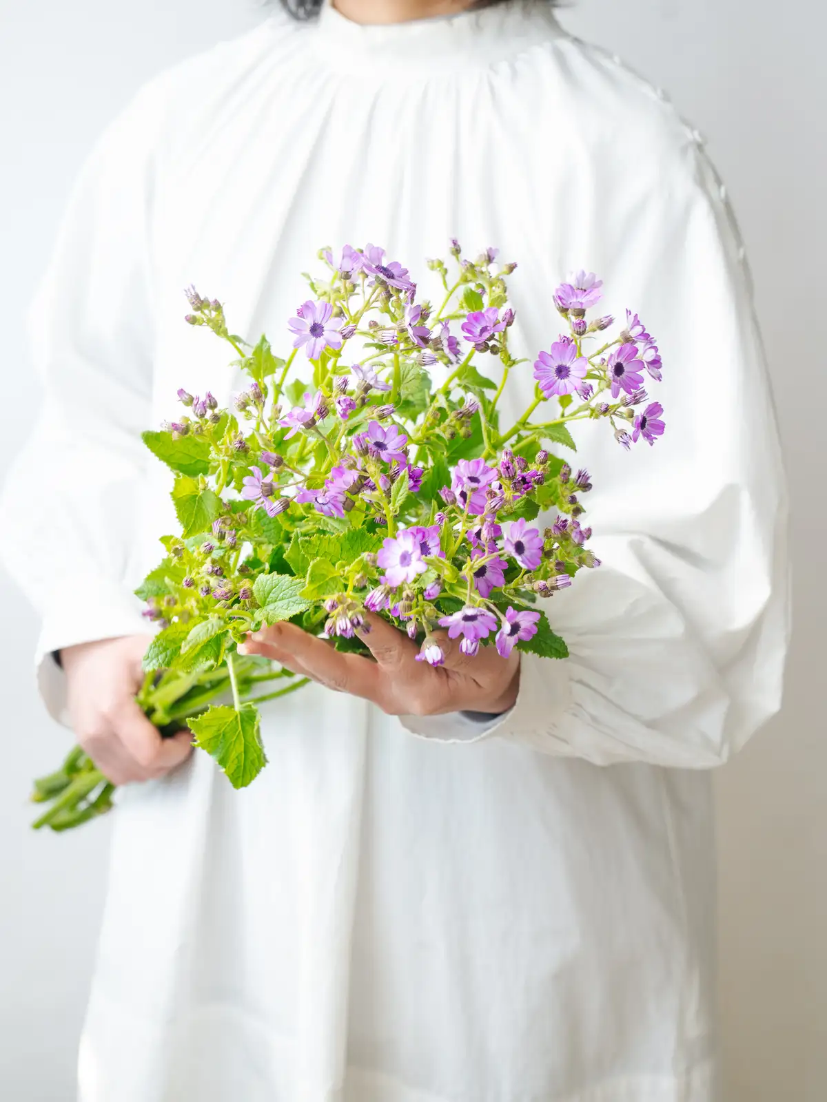 アメジストを思わせる鮮やかな紫色(バイオレット)の花色が特徴のサイネリア。茎に沿って小花が密集して咲き、アレンジメントに深みと個性を加えるアクセント花材として活躍します。