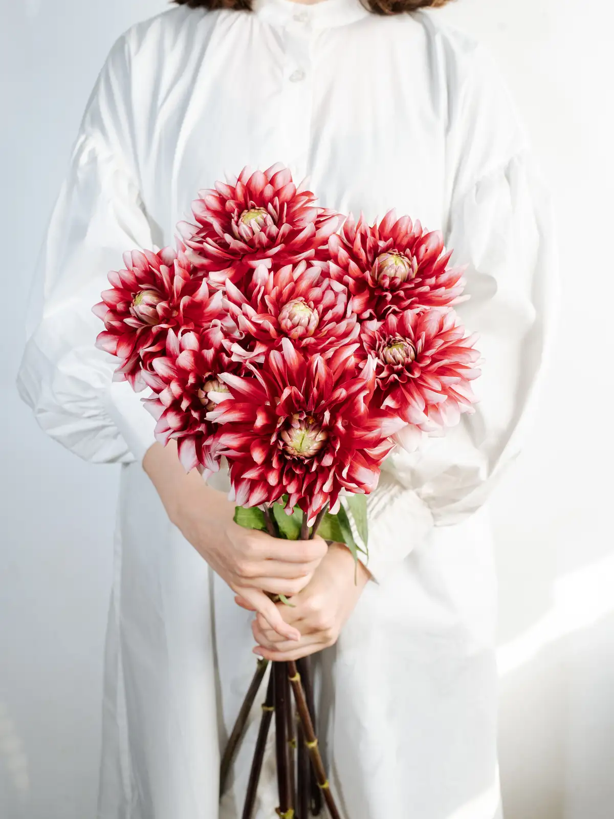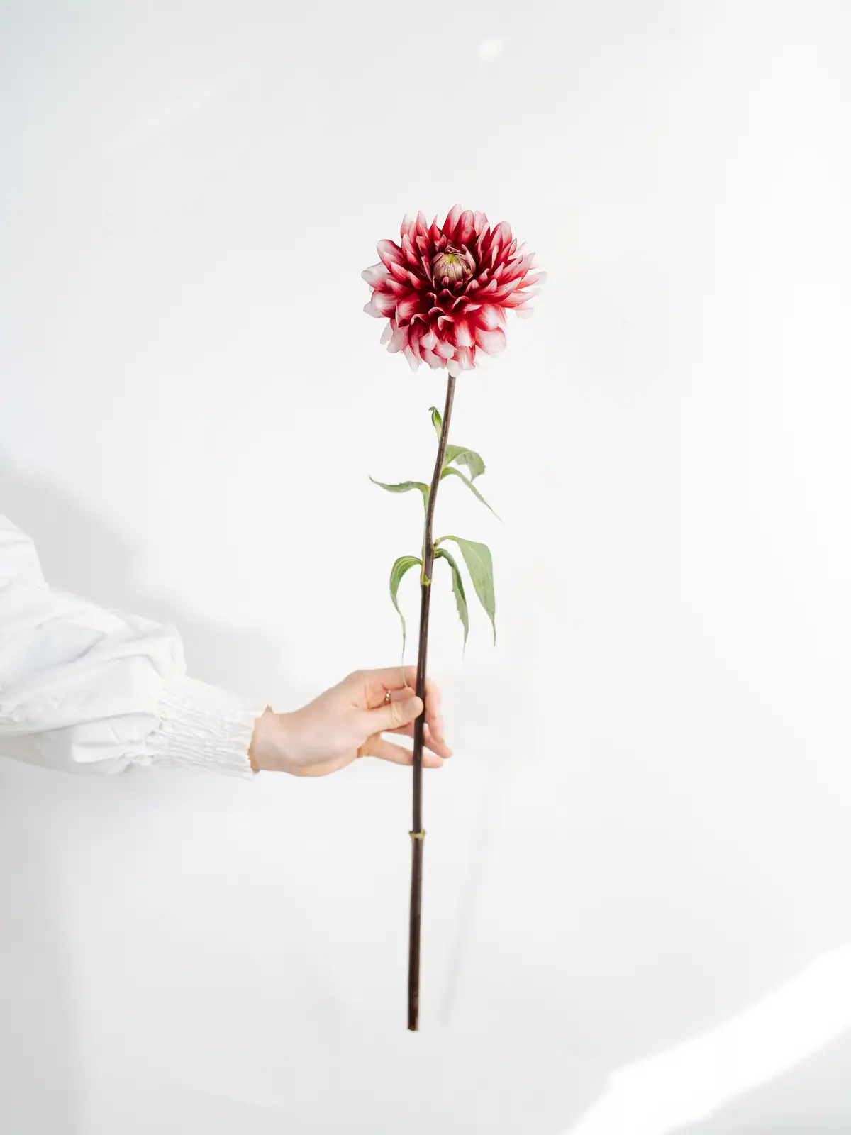 赤とオレンジが混ざり合う華やかな複色のダリアです。ふっくらとした花弁が幾重にも重なり、存在感のある一輪です。アレンジメントの主役花材として人気があります。