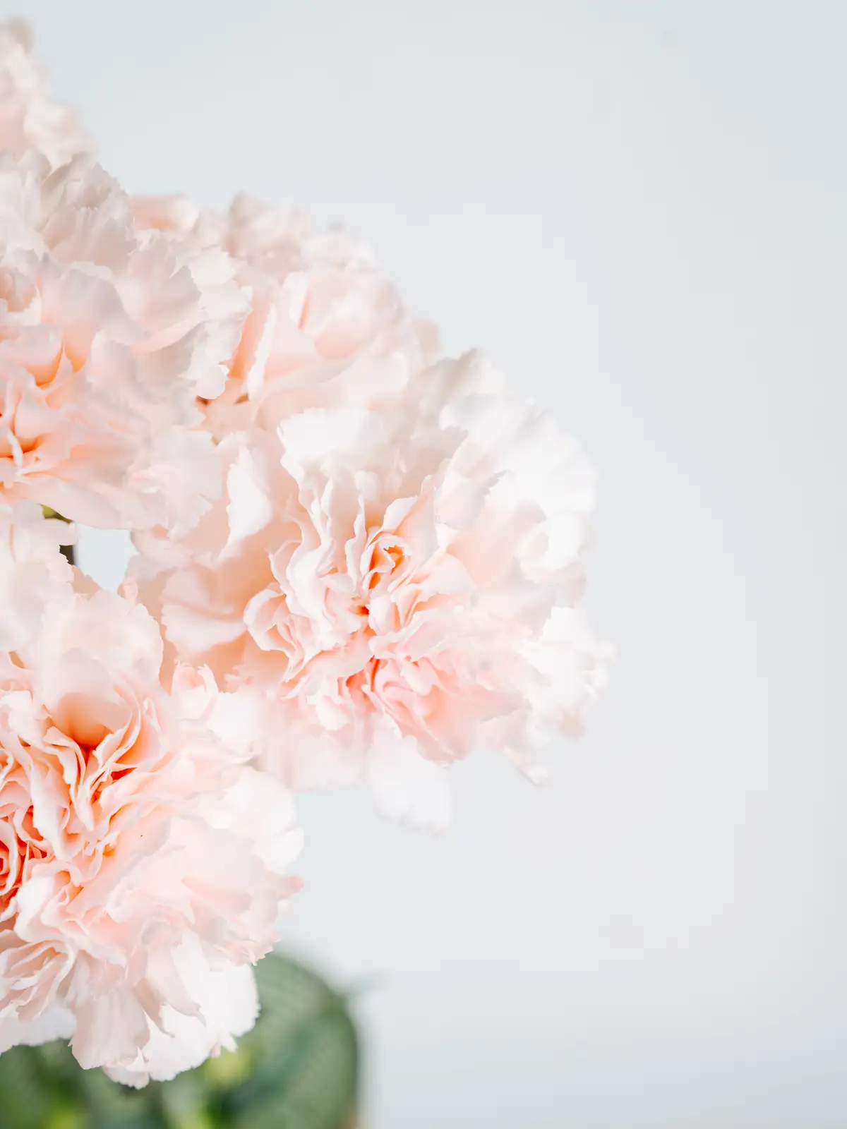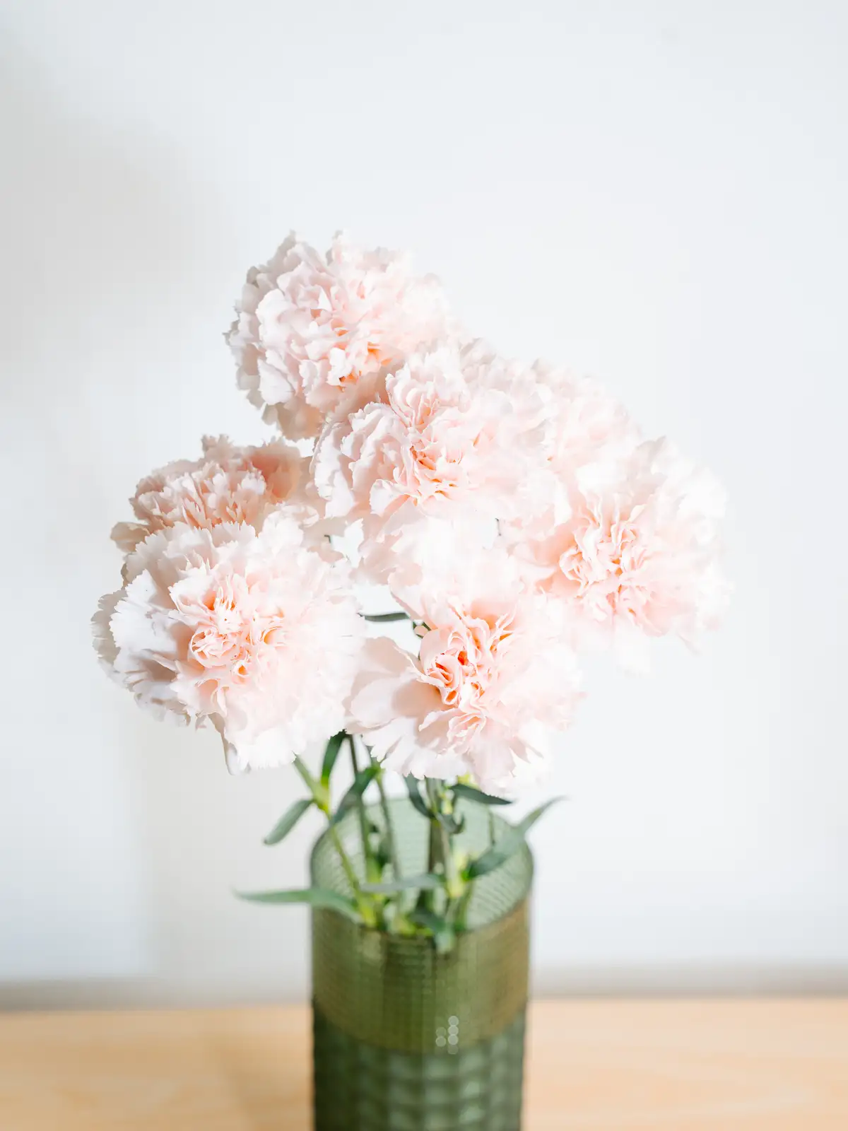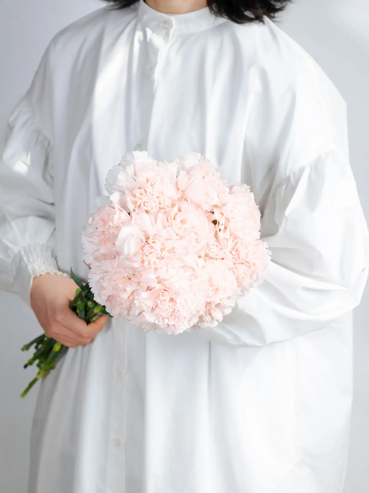 淡いピンク色が柔らかく繊細な印象を与えるスタンダードカーネーション。贈り物やブライダル装花にも使いやすい上品な品種です。