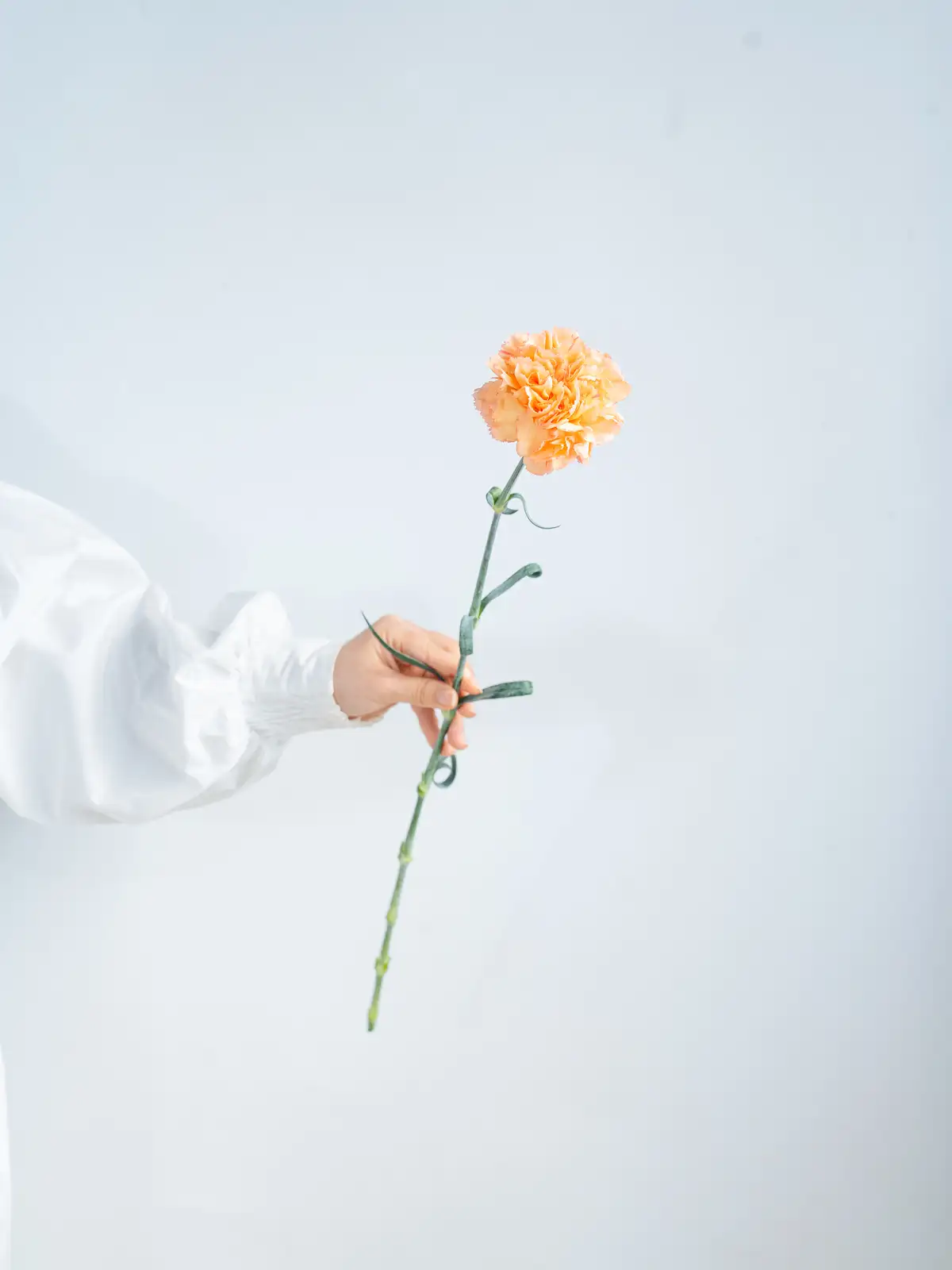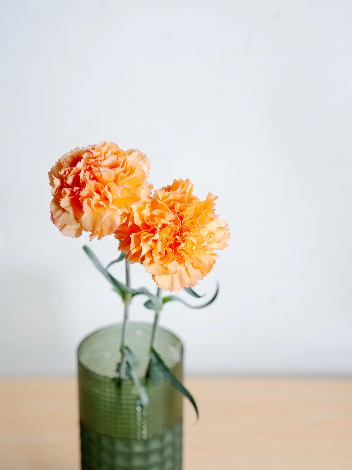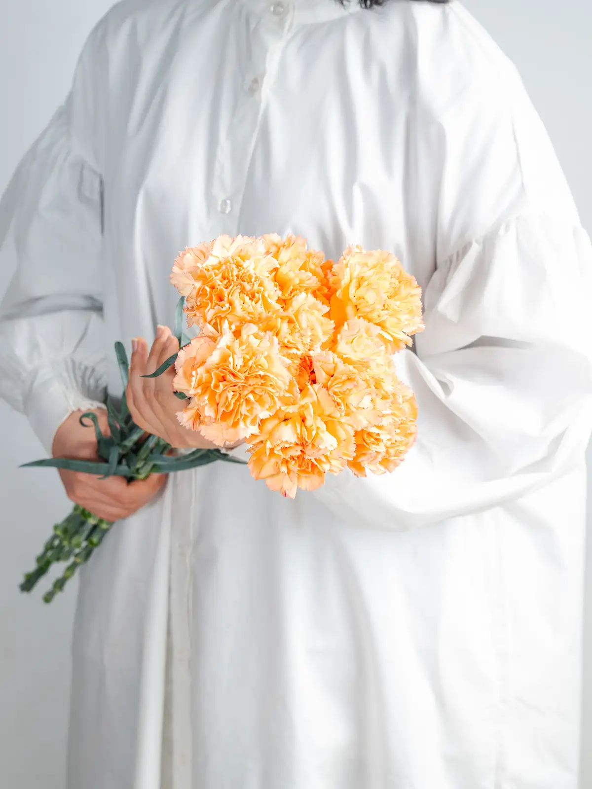 鮮やかなオレンジ色が陽気な雰囲気を演出するスタンダードカーネーション。明るいトーンのアレンジメントに活躍します。