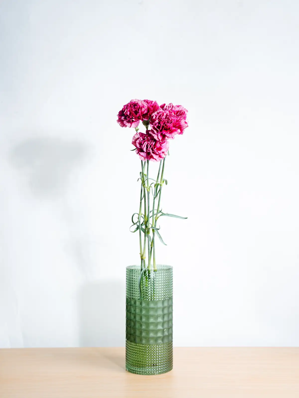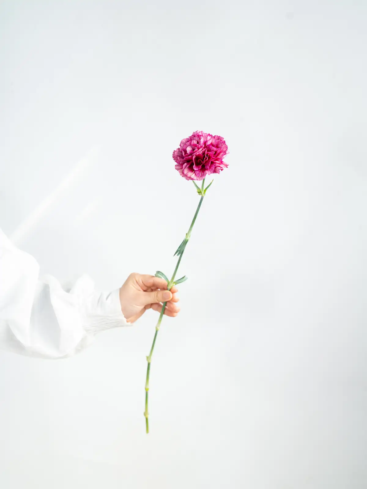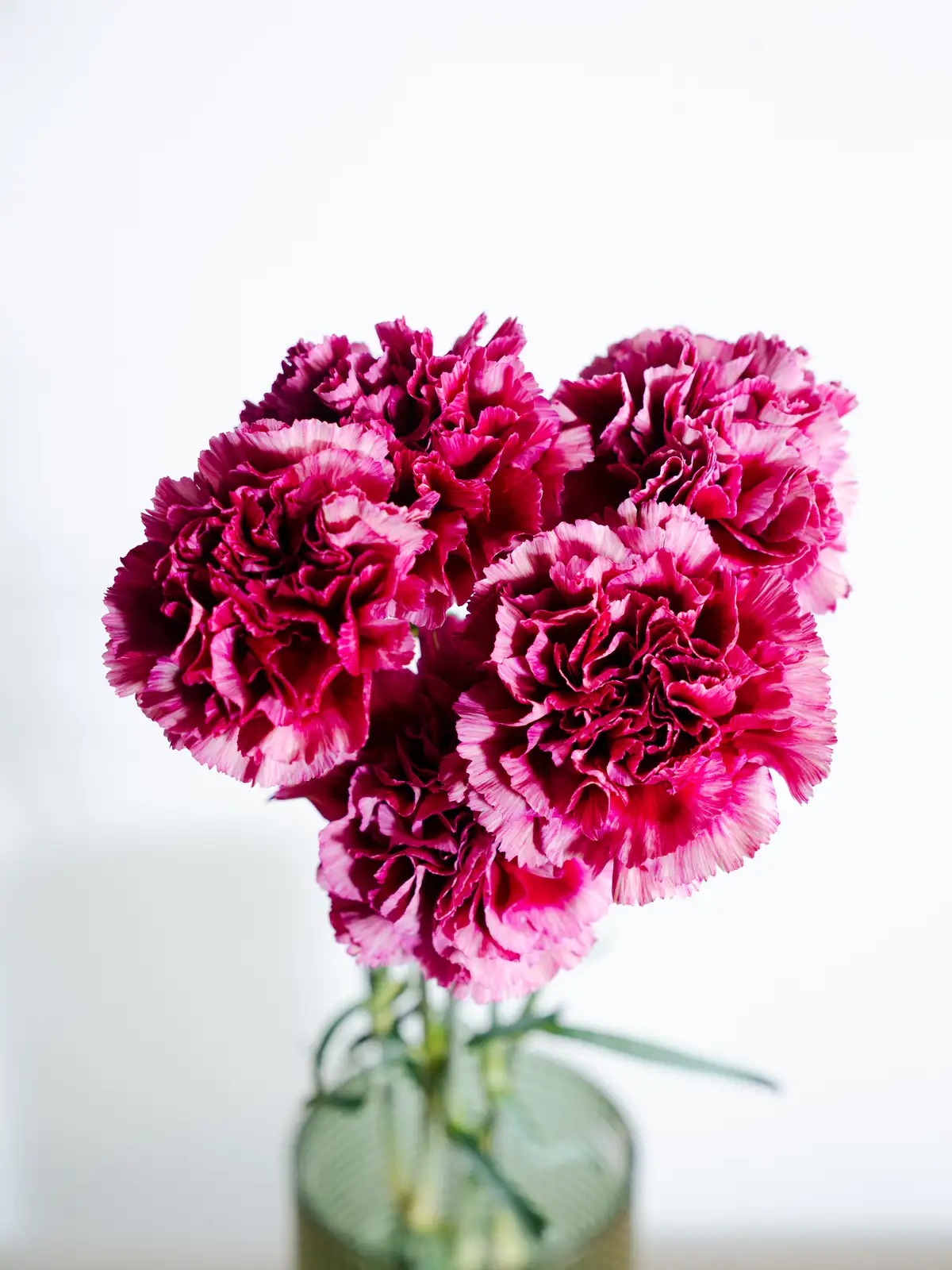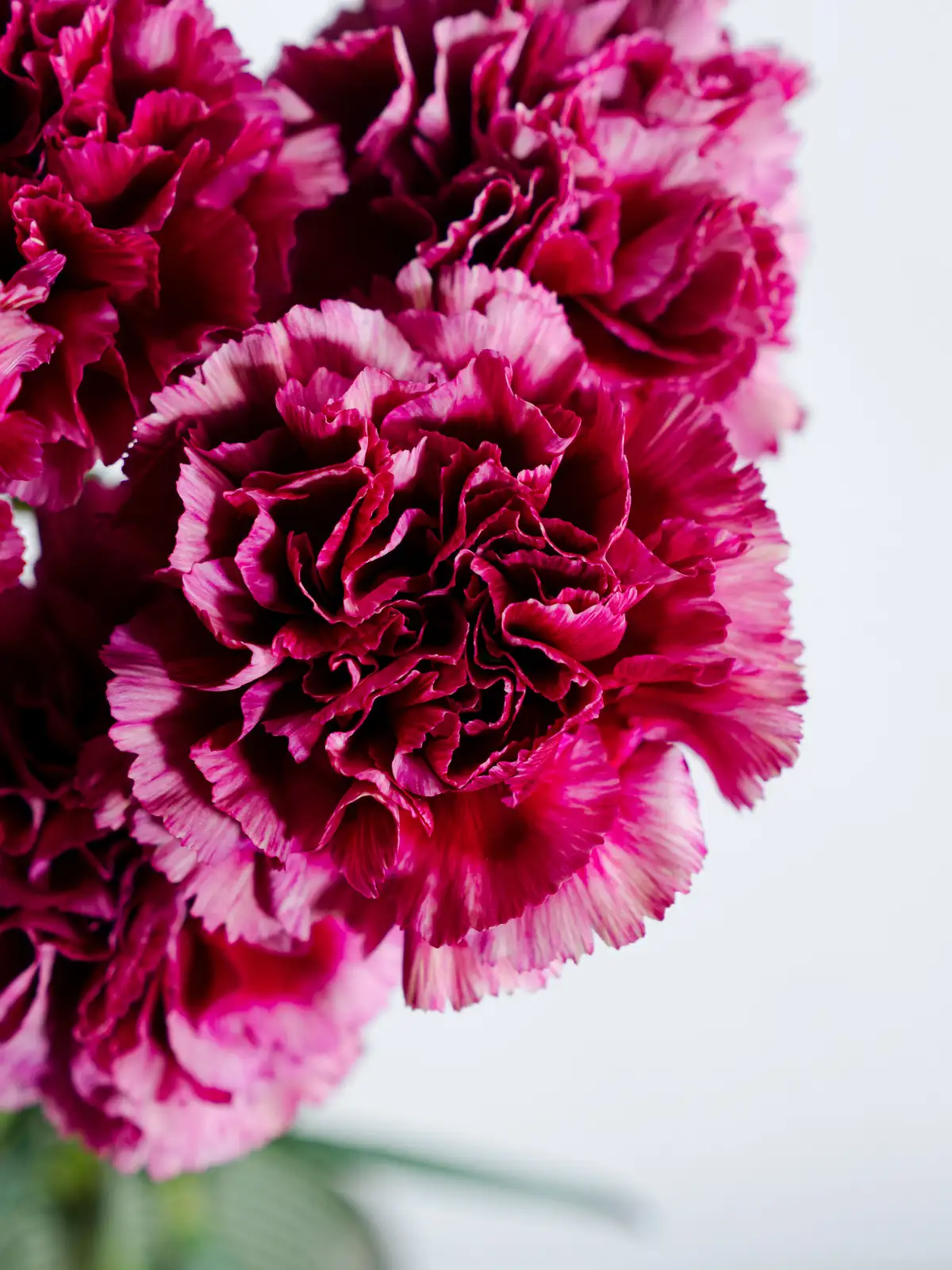 紫色の花に白の縁取りが入る個性的なカーネーション。目を引く色合いが魅力で、モダンなアレンジメントに映えます。