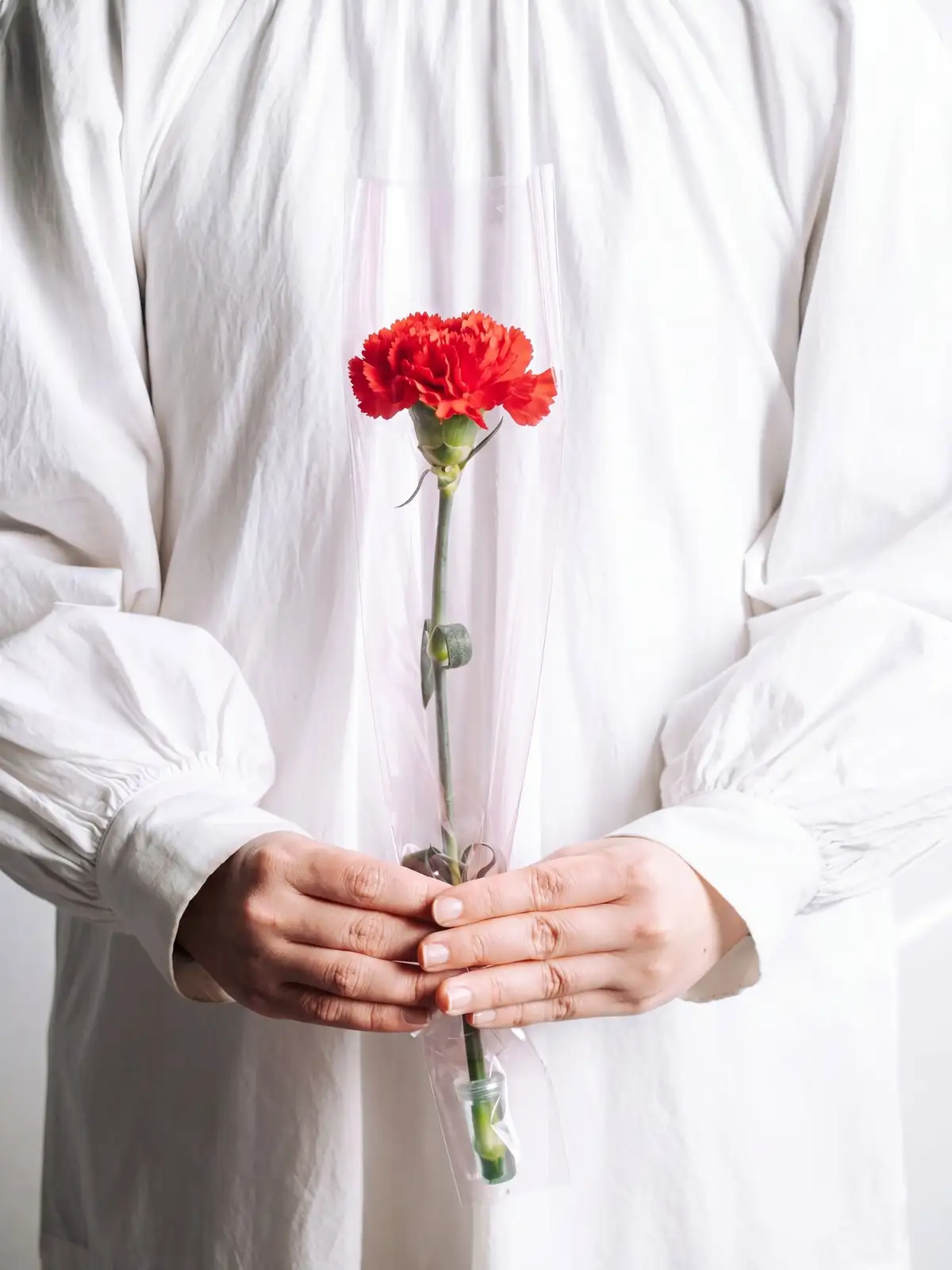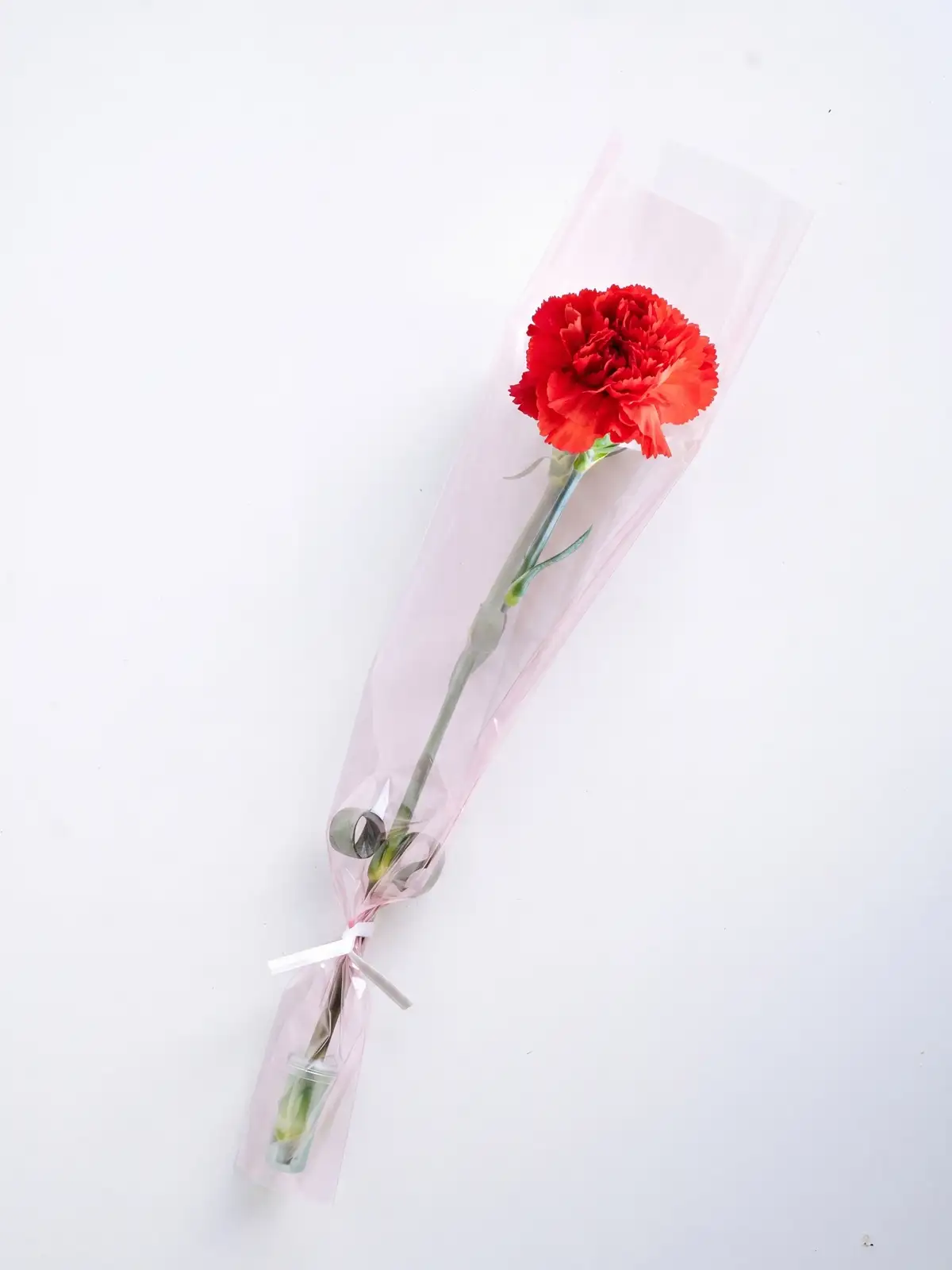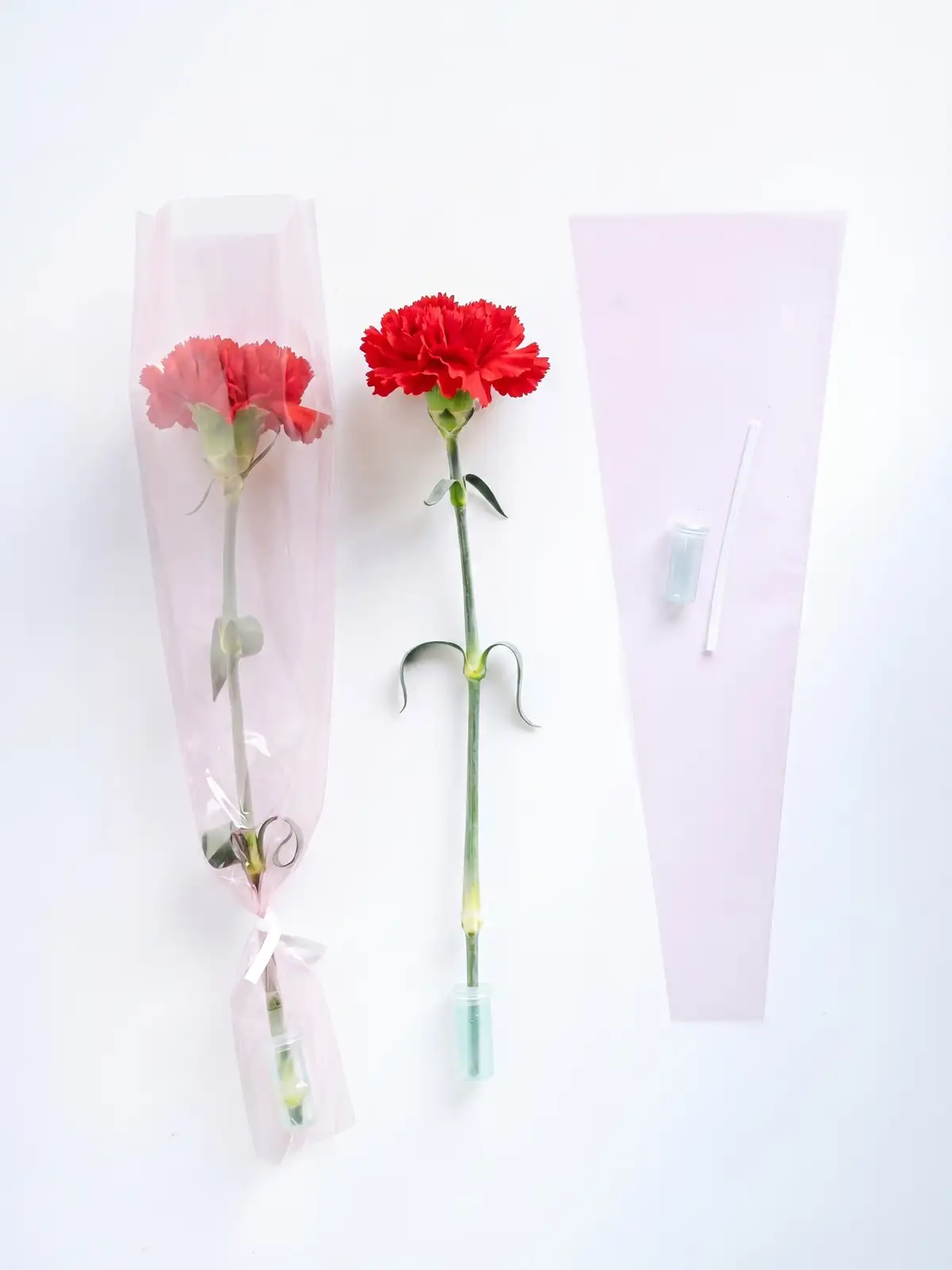 赤のカーネーション10本を、一輪ずつラッピングしてお渡ししたい際に活躍するセットです。カーネーションに、生花用クリアフローラルチューブ、リボンタイ、シアーカラー花袋(ピンク)を組み合わせており、給水しながら見た目よく仕上げたい場面に便利です。