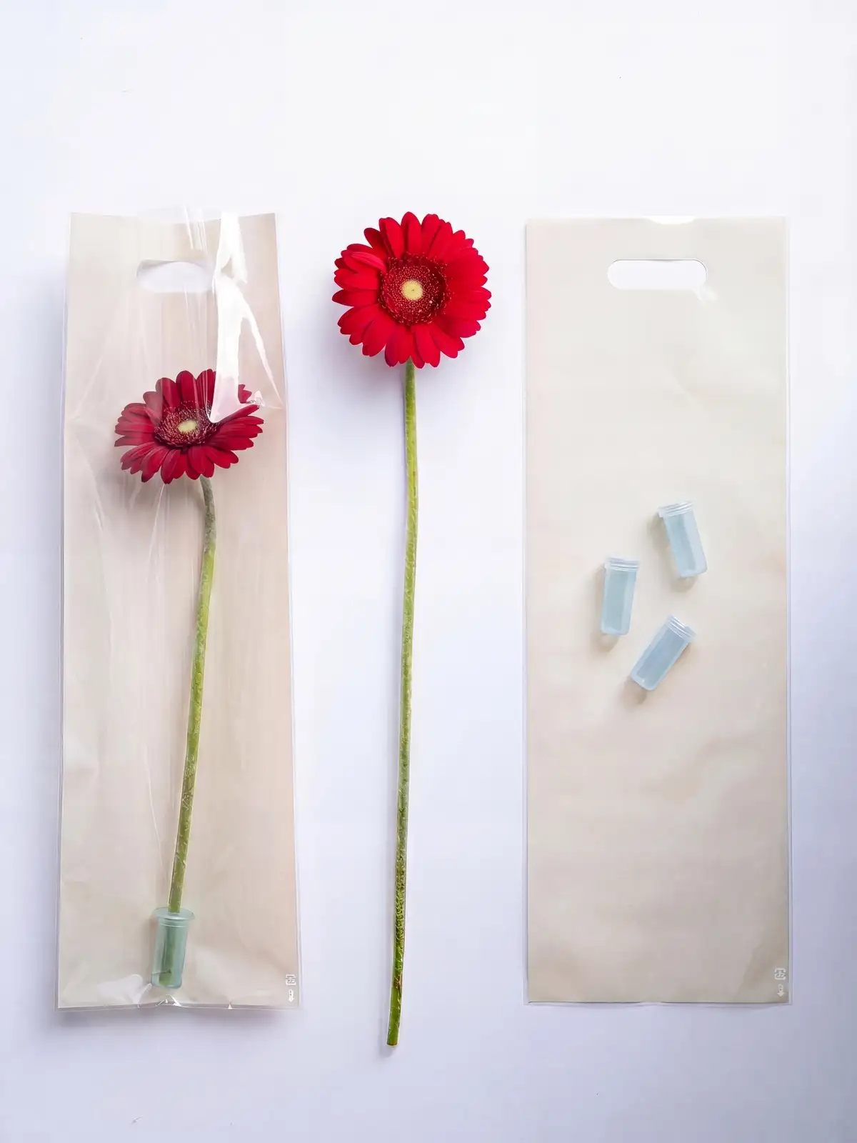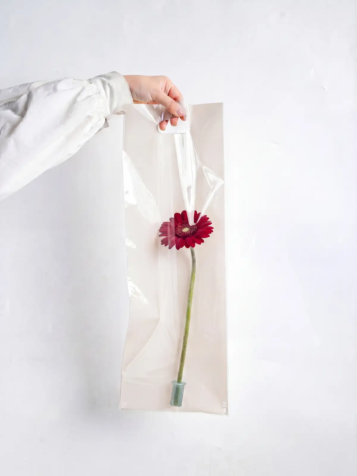 赤のガーベラ10本をラッピングしてお渡ししたい際に活躍するセットです。ガーベラに、底あり・持ち手付きのデザイン花袋ハンディスクエア、生花用クリアフローラルチューブを組み合わせており、花の保水と持ち帰りやすさを両立したラッピングに便利です。
